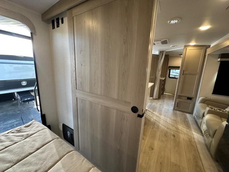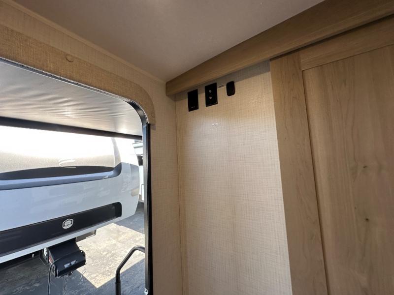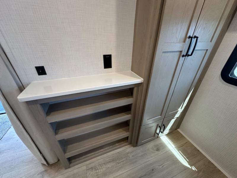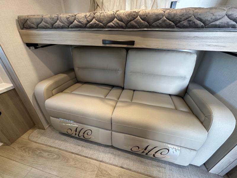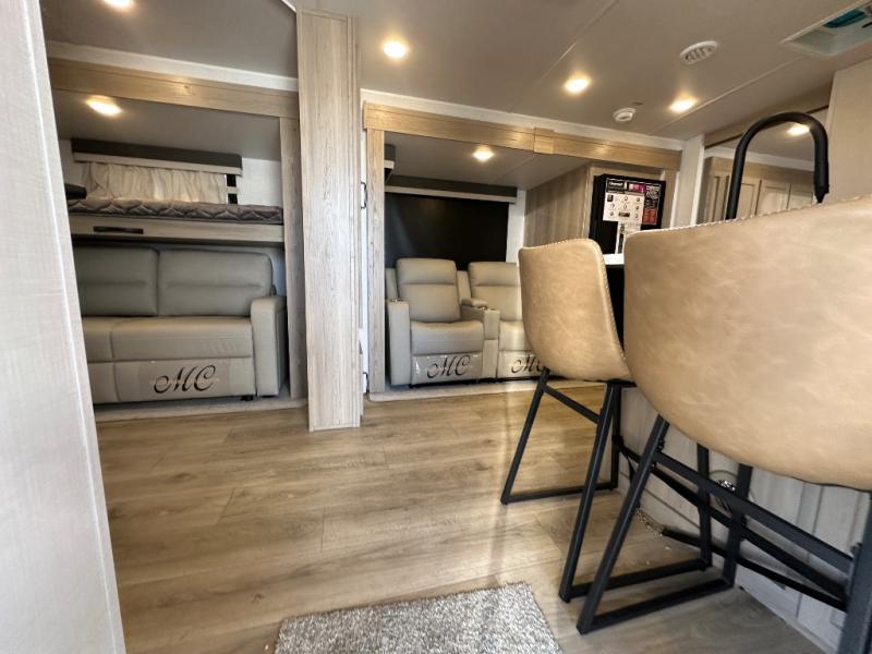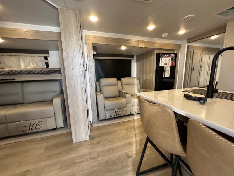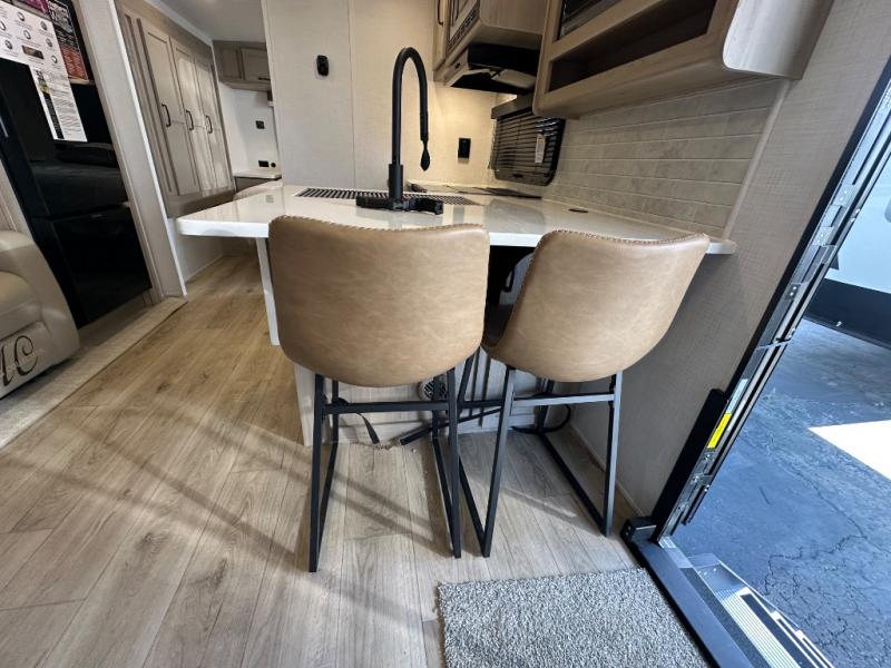 Camping with friends and family has never been easier than with this lightweight travel trailer! There is a semi-private bunkhouse in the rear corner with a privacy curtain, a sofa slide out, and a flip-up bunk. The full bath with its own exterior entry door is close by to make nighttime restroom breaks easy for the little ones, and you'll enjoy the front private bedroom all to yourselves. Here, you can sleep soundly on the queen bed, store your clothes in the wardrobe slide, and sneak out early to fish through the second entry door; how convenient! The middle living area and kitchen includes a third slide out, a theater seat across from the TV, and a countertop with stools where campers can visit with the chef as they cook dinner. Head outside to enjoy the 21' power awning with LED lights, exterior griddle, and pass-thru storage with a steel sliding tray!