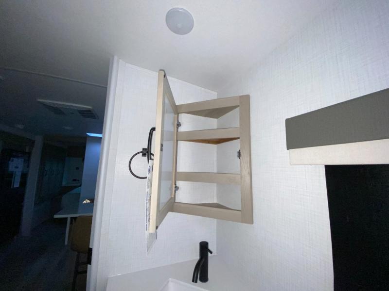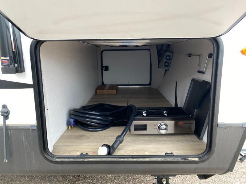 Camping with friends and family has never been easier than with this lightweight travel trailer! There is a semi-private bunkhouse in the rear corner with a privacy curtain, a sofa slide out, and a flip-up bunk. The full bath with its own exterior entry door is close by to make nighttime restroom breaks easy for the little ones, and you'll enjoy the front private bedroom all to yourselves. Here, you can sleep soundly on the queen bed, store your clothes in the wardrobe slide, and sneak out early to fish through the second entry door; how convenient! The middle living area and kitchen includes a third slide out, a theater seat across from the TV, and a countertop with stools where campers can visit with the chef as they cook dinner. Head outside to enjoy the 21' power awning with LED lights, exterior griddle, and pass-thru storage with a steel sliding tray!