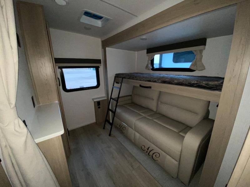Camping with friends and family has never been easier than with this lightweight travel trailer! There is a semi-private bunkhouse in the rear corner with a privacy curtain, a sofa slide out, and a flip-up bunk. The full bath with its own exterior entry door is close by to make nighttime restroom breaks easy for the little ones, and you'll enjoy the front private bedroom all to yourselves. Here, you can sleep soundly on the queen bed, store your clothes in the wardrobe slide, and sneak out early to fish through the second entry door; how convenient! The middle living area and kitchen includes a third slide out, a theater seat across from the TV, and a countertop with stools where campers can visit with the chef as they cook dinner. Head outside to enjoy the 21' power awning with LED lights, exterior griddle, and pass-thru storage with a steel sliding tray!