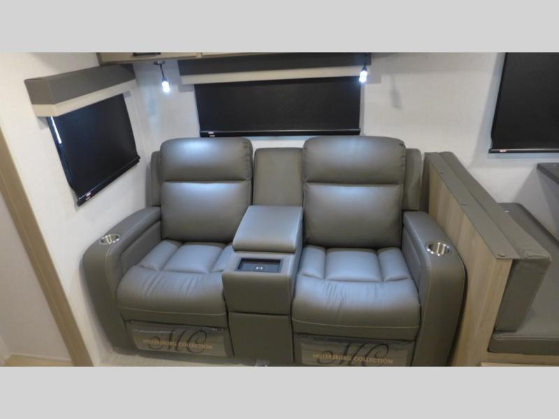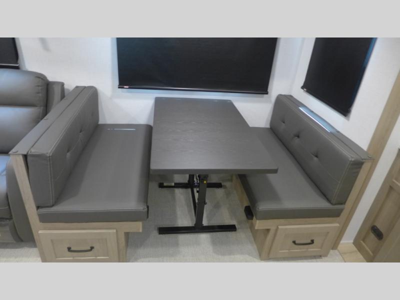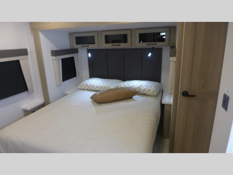 This is the perfect couples trailer with a spacious living and kitchen area and a rear bedroom which includes the second exterior entry/exit door! The bedroom also provides a slide out queen bed, a wardrobe and an optional TV, plus windows for great views and access to the double entry bathroom. The front kitchen gives the cook counter space and cabinetry for dishes and such, plus all the appliances needed to make warm meals and store leftovers. You can dine at the booth dinette, relax on the 67" theater seating and watch the Smart TV while enjoying the fireplace.