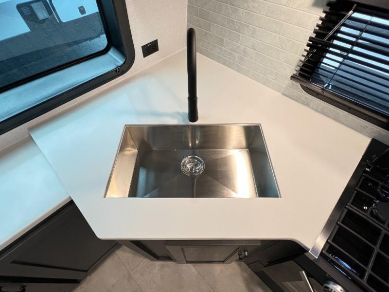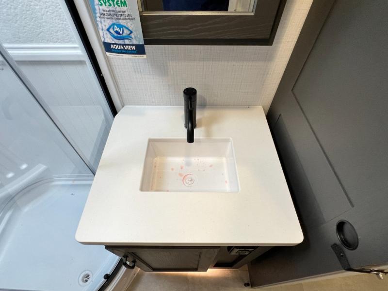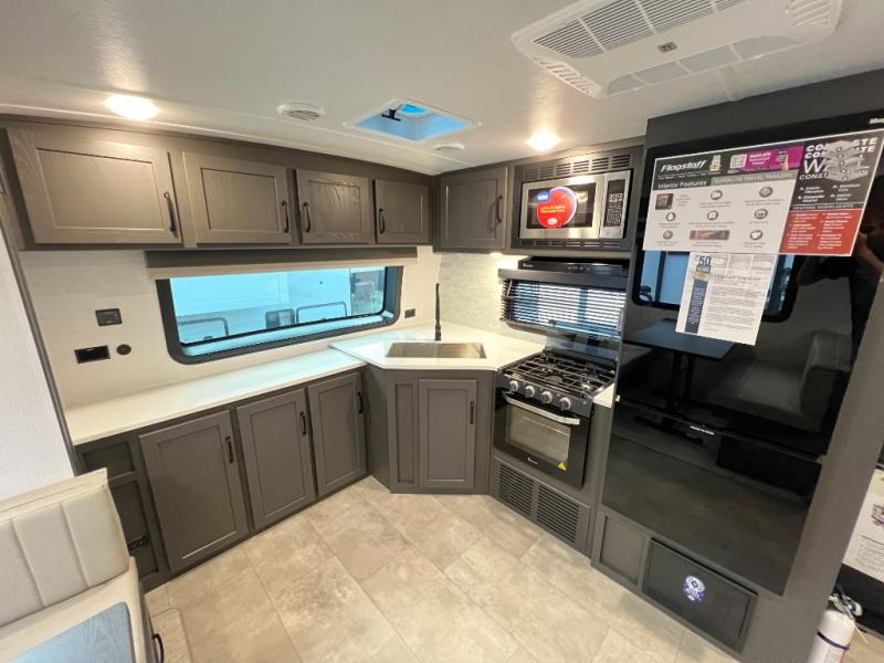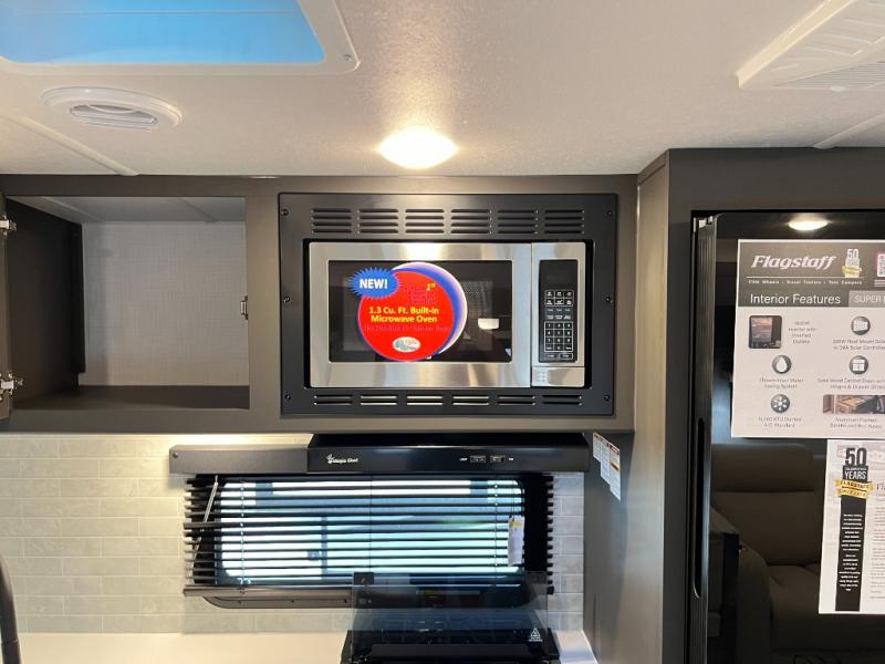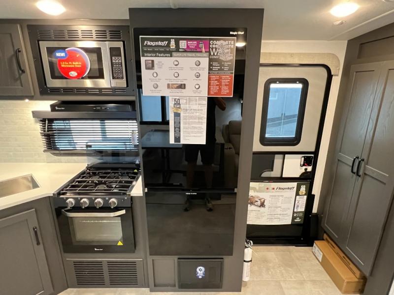 With any Flagstaff Super Lite travel trailer by Forest River the towing features include the TST tire pressure monitor system with a monitor providing safety on the road, Easy Lube axles and Nev-R adjust brakes, a power tongue jack for easy setup, and rear observation camera prep. Each is built with 6 sided aluminum framed side walls, end wall, front, floor and a roof, a plywood tongue and groove subfloor, electronically controlled heated holding tanks and an enclosed underbelly allowing you to travel during any season. The interior includes designer kitchen backsplash, solid surface kitchen countertops, Sedonwood cabinetry, and solid wood cabinet doors and drawers to make you feel right at home.