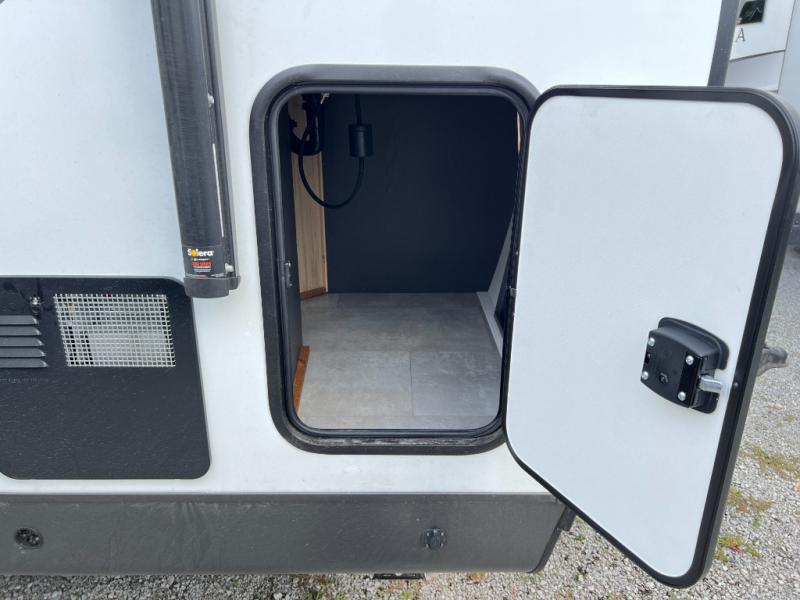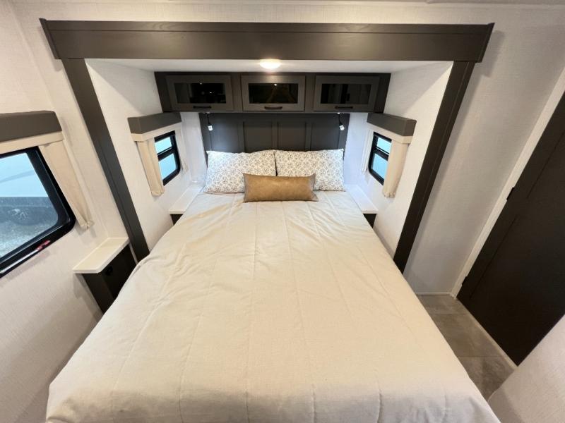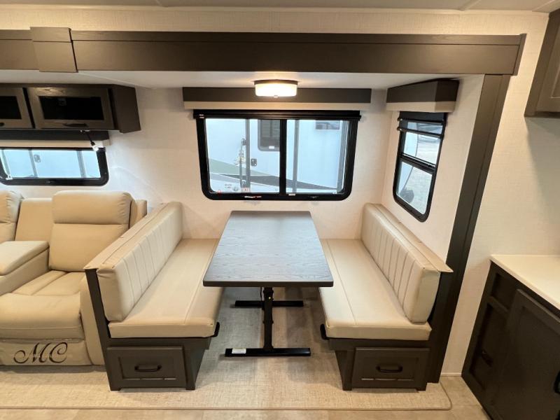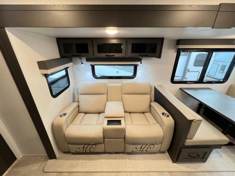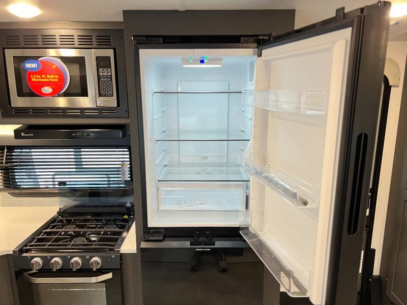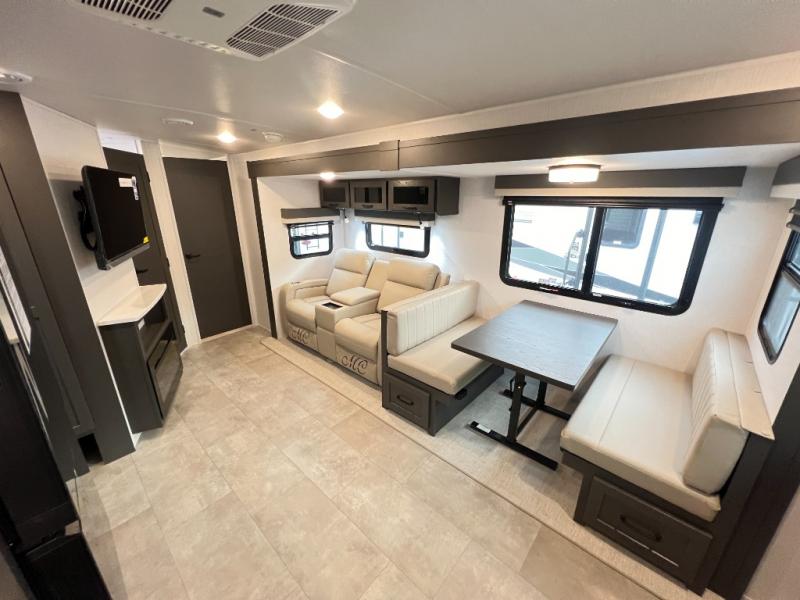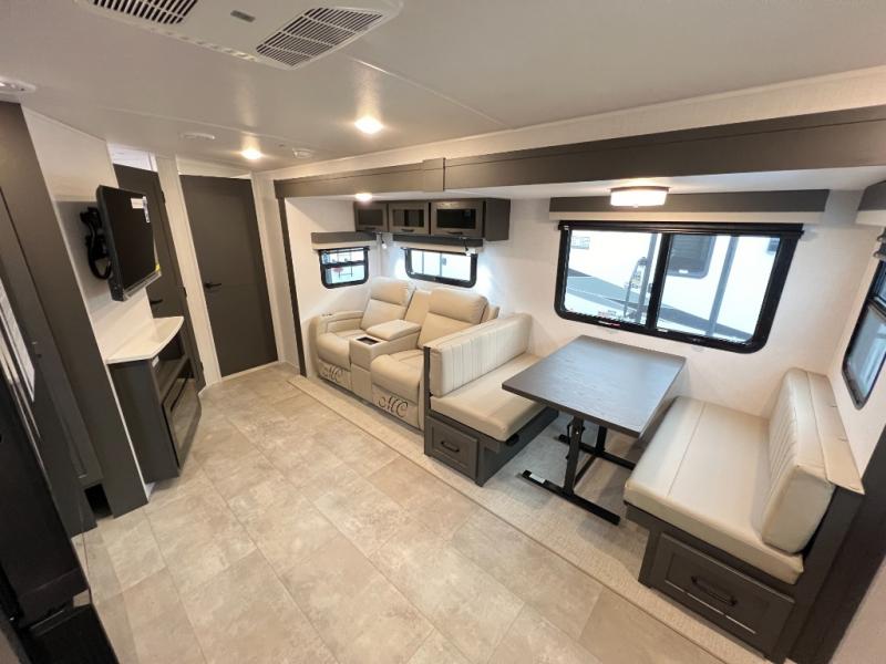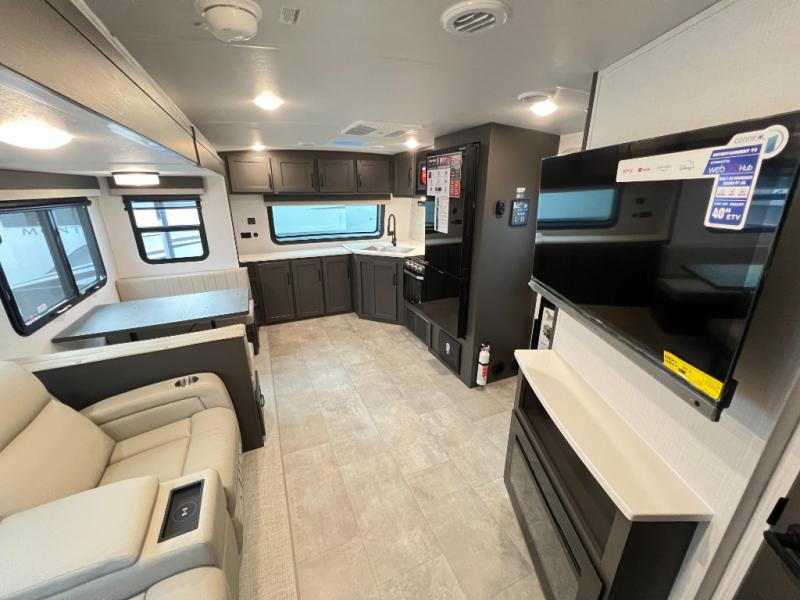 This is the perfect couples trailer with a spacious living and kitchen area and a rear bedroom which includes the second exterior entry/exit door! The bedroom also provides a slide out queen bed, a wardrobe and an optional TV, plus windows for great views and access to the double entry bathroom. The front kitchen gives the cook counter space and cabinetry for dishes and such, plus all the appliances needed to make warm meals and store leftovers. You can dine at the booth dinette, relax on the 67" theater seating and watch the Smart TV while enjoying the fireplace.