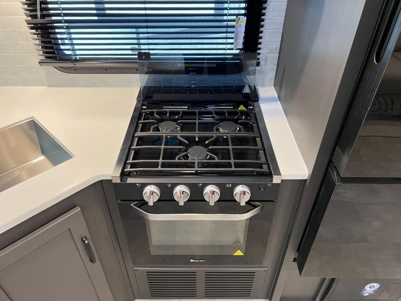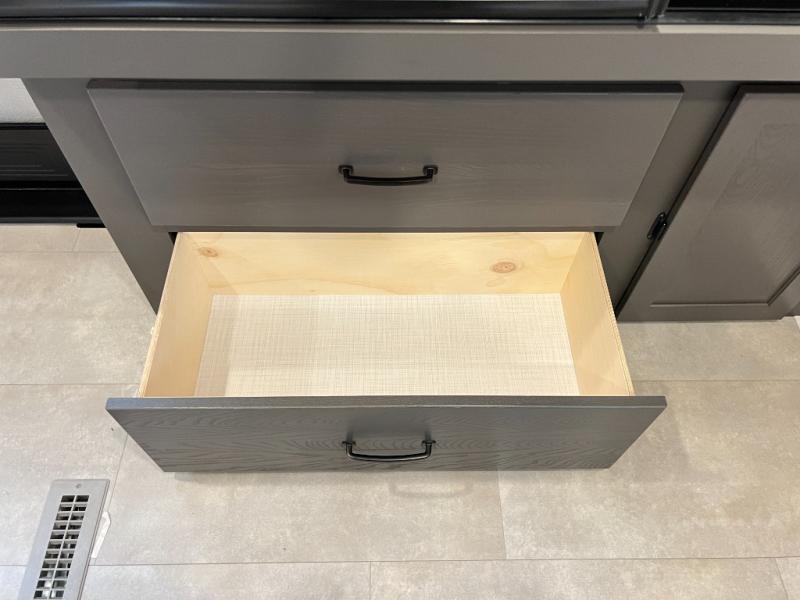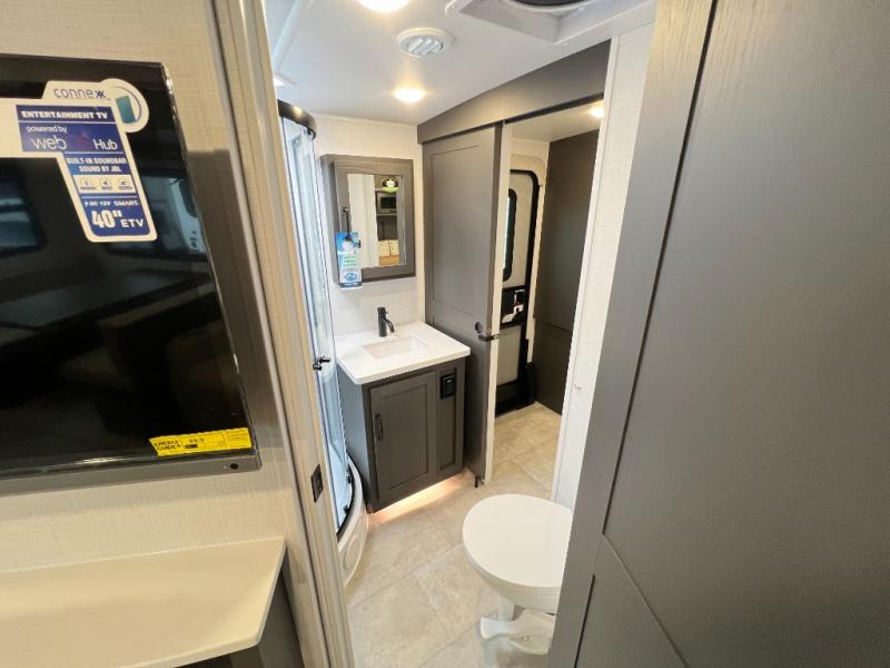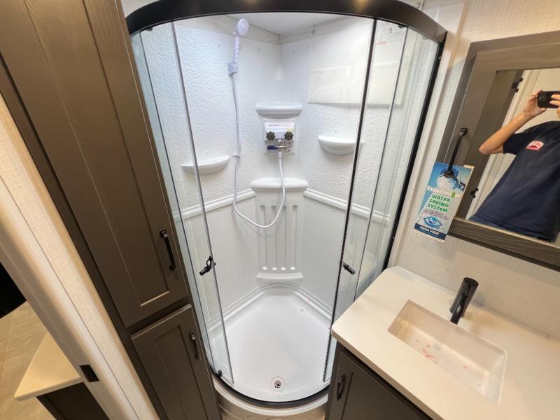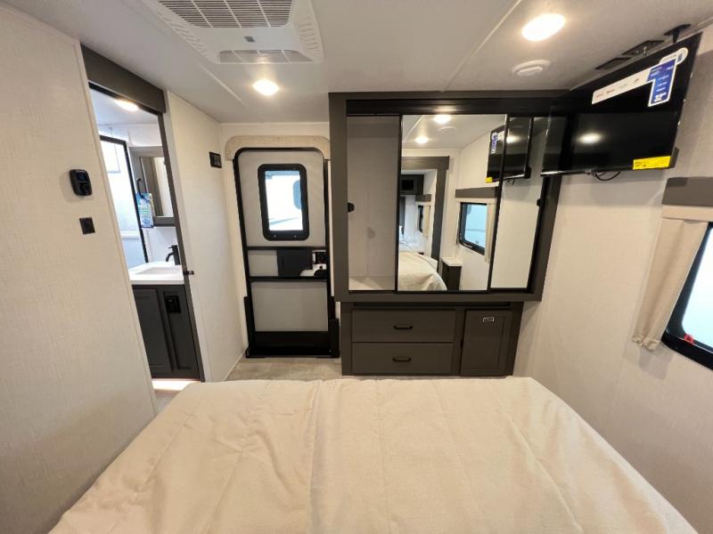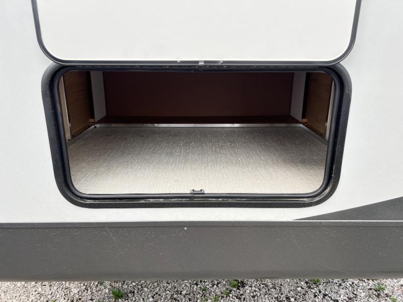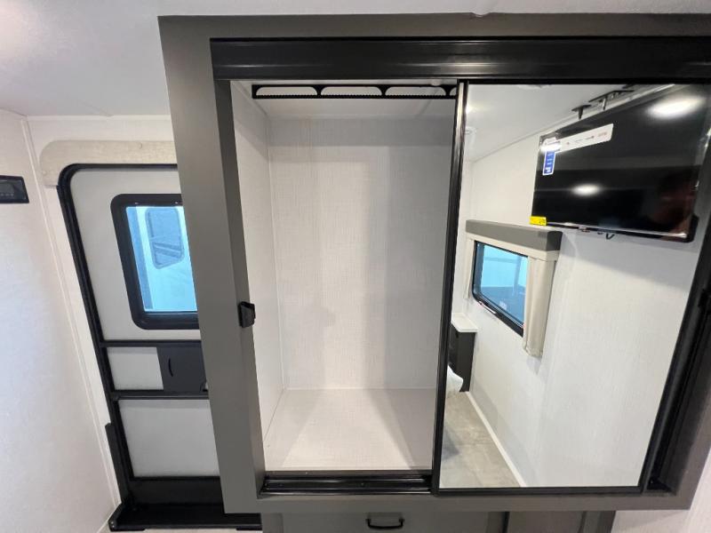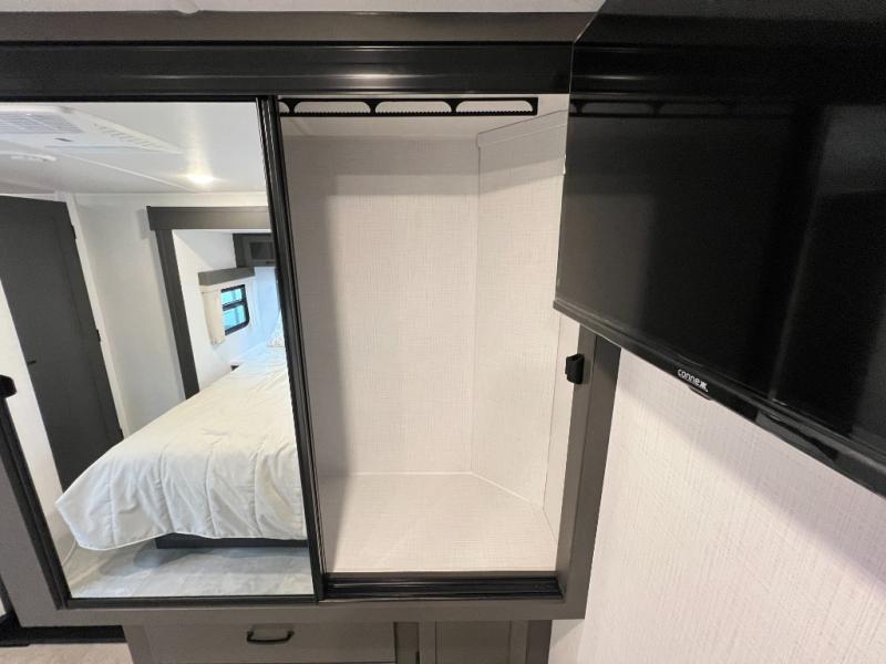 This is the perfect couples trailer with a spacious living and kitchen area and a rear bedroom which includes the second exterior entry/exit door! The bedroom also provides a slide out queen bed, a wardrobe and an optional TV, plus windows for great views and access to the double entry bathroom. The front kitchen gives the cook counter space and cabinetry for dishes and such, plus all the appliances needed to make warm meals and store leftovers. You can dine at the booth dinette, relax on the 67" theater seating and watch the Smart TV while enjoying the fireplace.