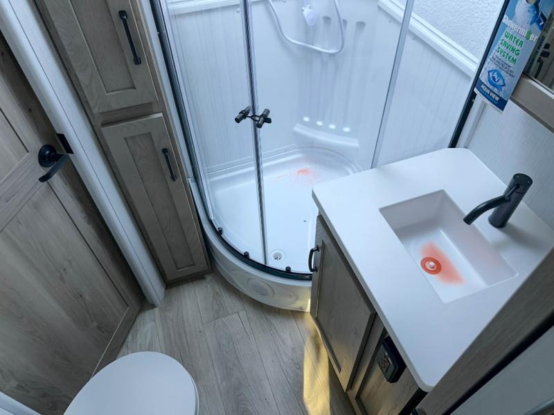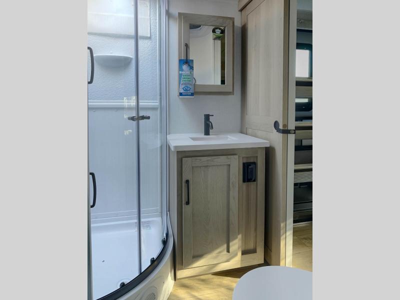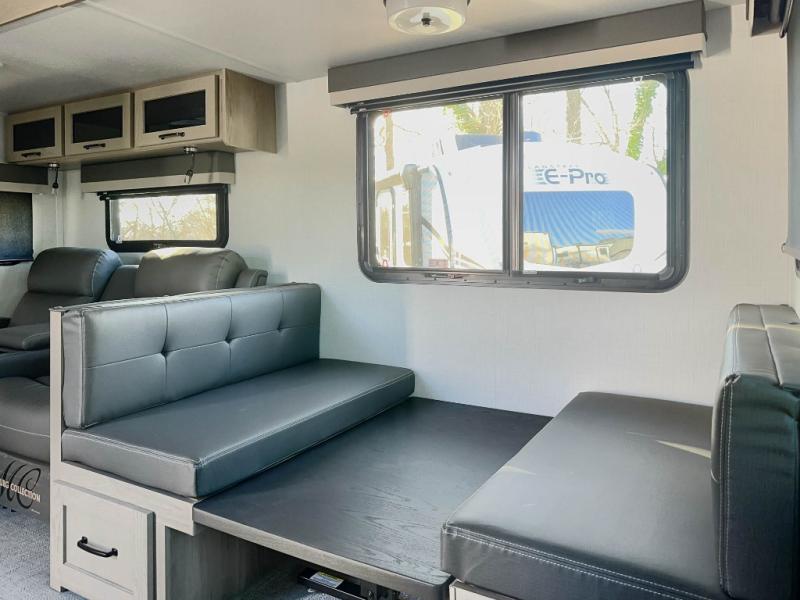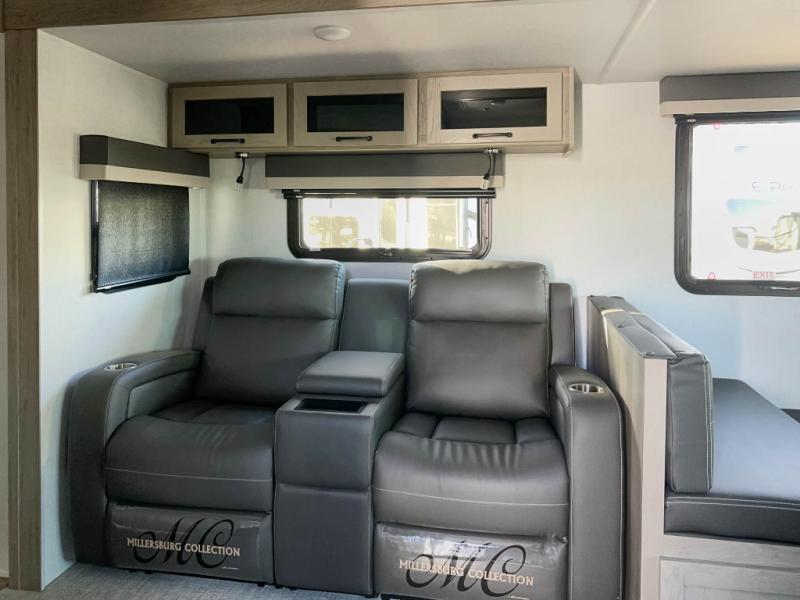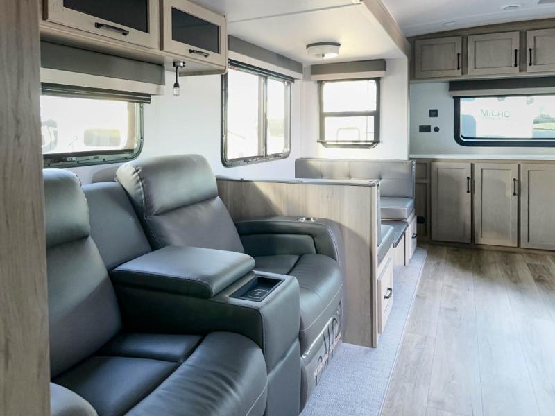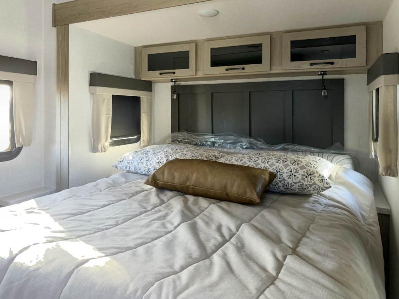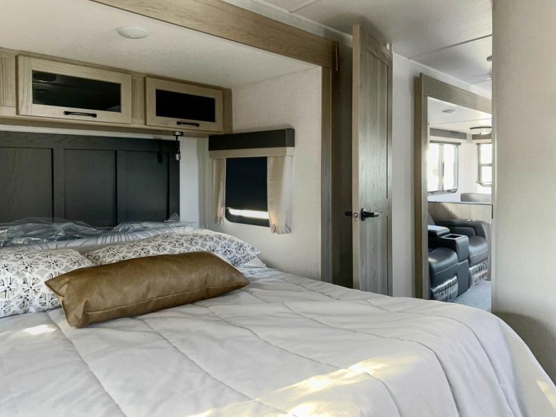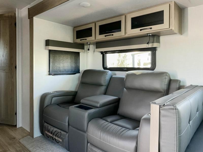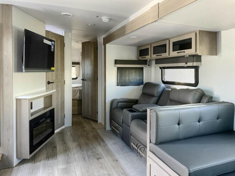 This is the perfect couples trailer with a spacious living and kitchen area and a rear bedroom which includes the second exterior entry/exit door! The bedroom also provides a slide out queen bed, a wardrobe and an optional TV, plus windows for great views and access to the double entry bathroom. The front kitchen gives the cook counter space and cabinetry for dishes and such, plus all the appliances needed to make warm meals and store leftovers. You can dine at the booth dinette, relax on the 67" theater seating and watch the Smart TV while enjoying the fireplace.