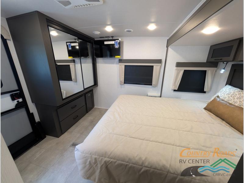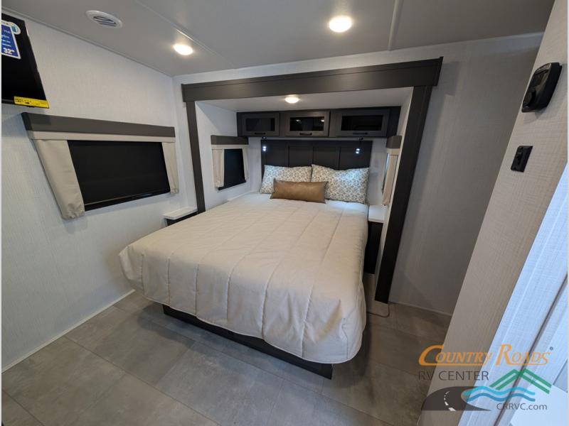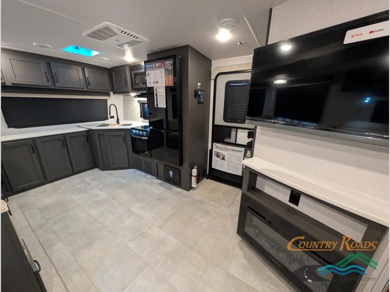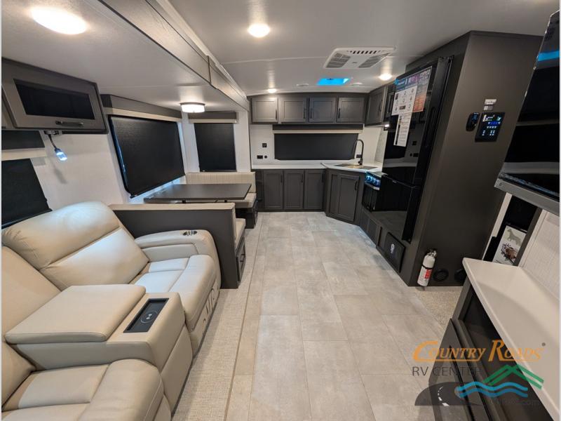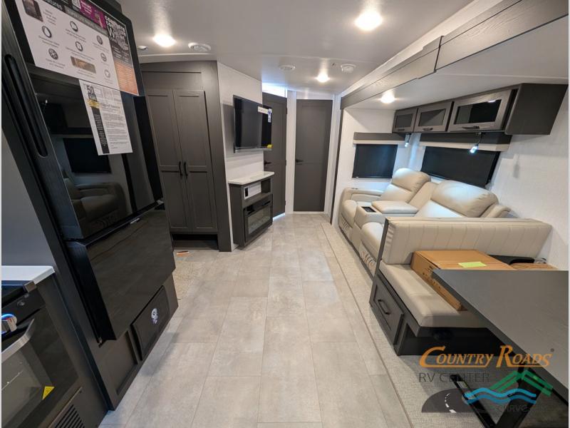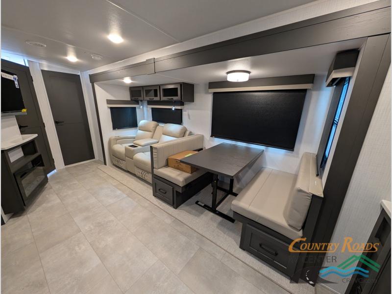 This is the perfect couples trailer with a spacious living and kitchen area and a rear bedroom which includes the second exterior entry/exit door! The bedroom also provides a slide out queen bed, a wardrobe and an optional TV, plus windows for great views and access to the double entry bathroom. The front kitchen gives the cook counter space and cabinetry for dishes and such, plus all the appliances needed to make warm meals and store leftovers. You can dine at the booth dinette, relax on the 67" theater seating and watch the Smart TV while enjoying the fireplace.