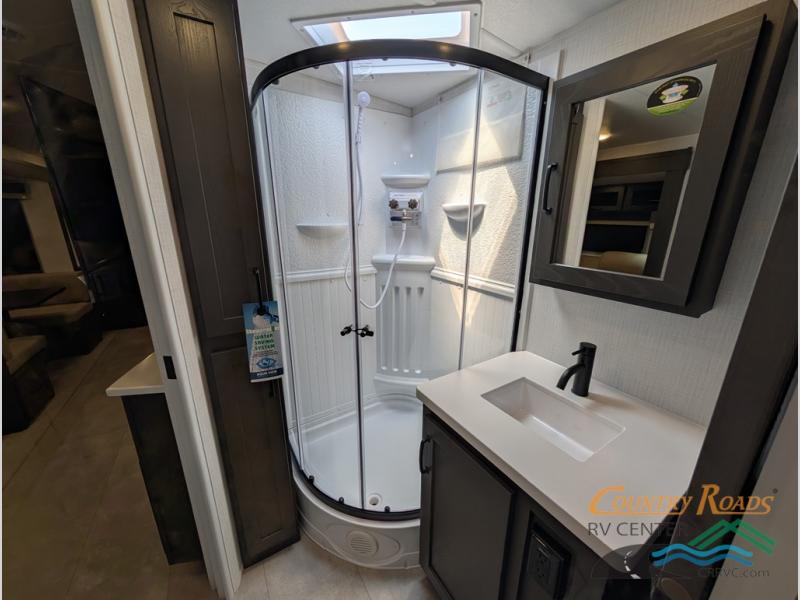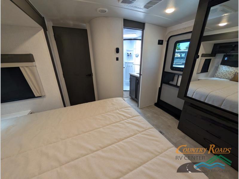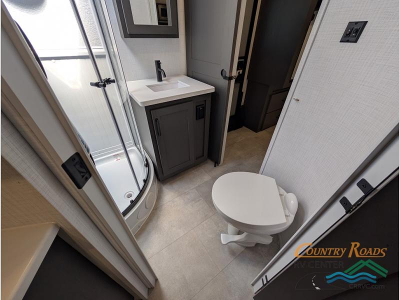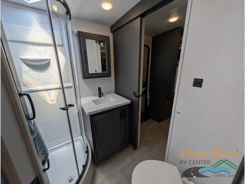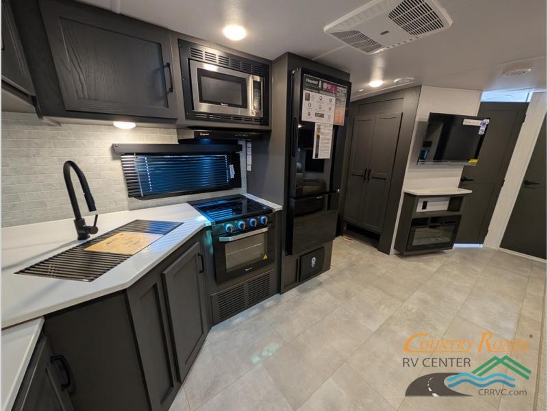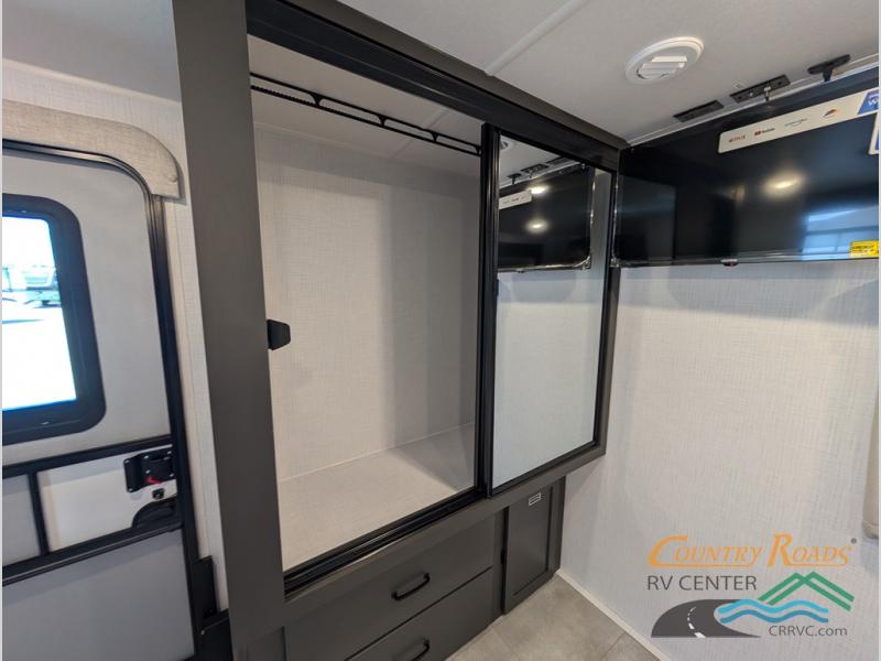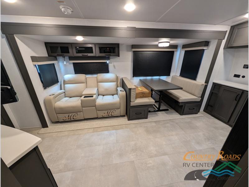 This is the perfect couples trailer with a spacious living and kitchen area and a rear bedroom which includes the second exterior entry/exit door! The bedroom also provides a slide out queen bed, a wardrobe and an optional TV, plus windows for great views and access to the double entry bathroom. The front kitchen gives the cook counter space and cabinetry for dishes and such, plus all the appliances needed to make warm meals and store leftovers. You can dine at the booth dinette, relax on the 67" theater seating and watch the Smart TV while enjoying the fireplace.