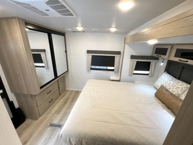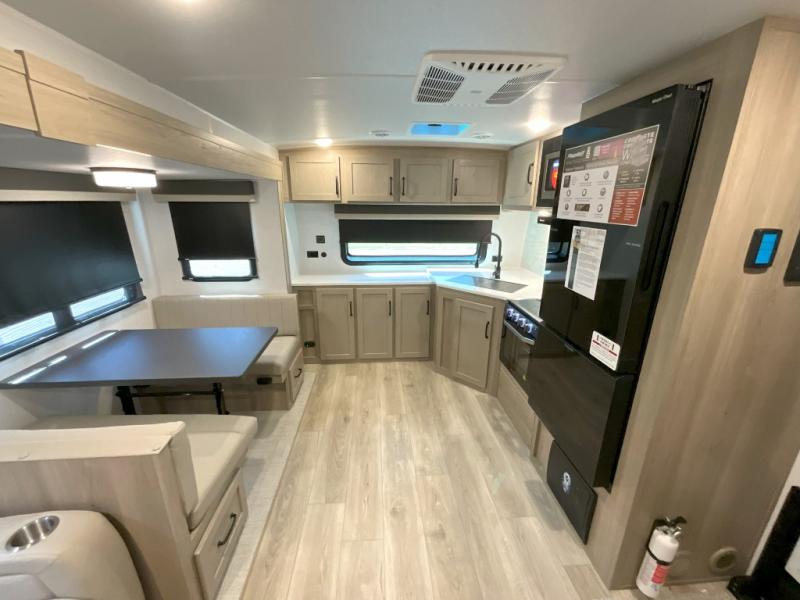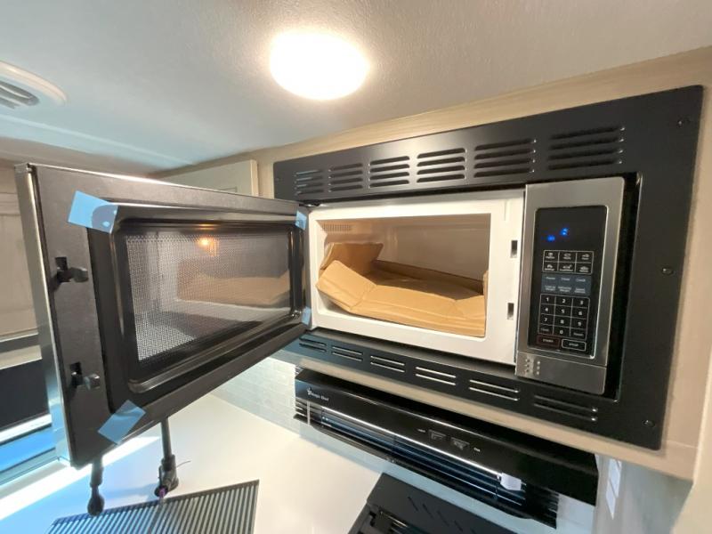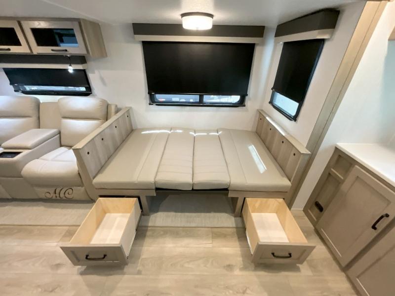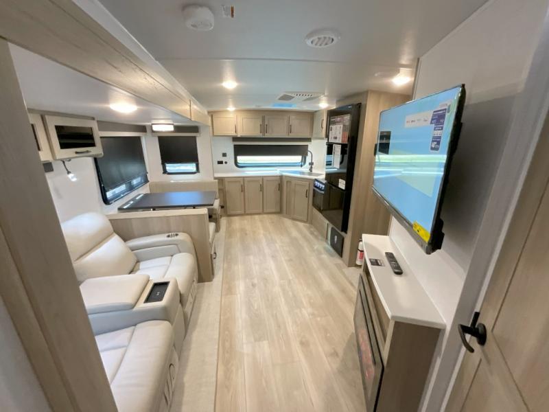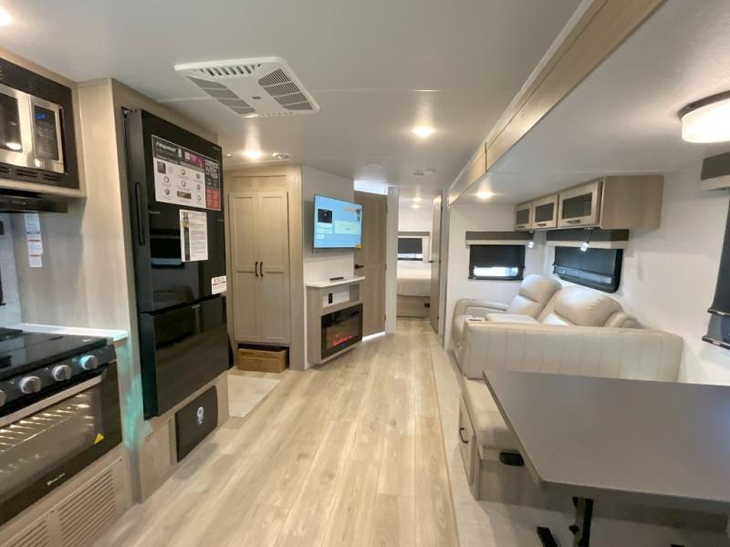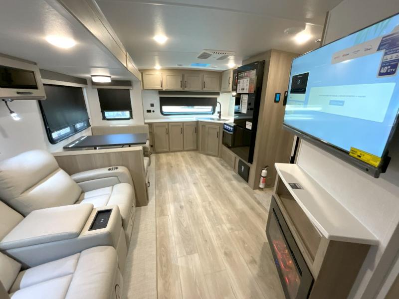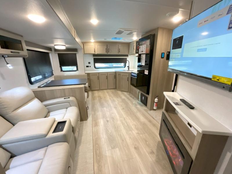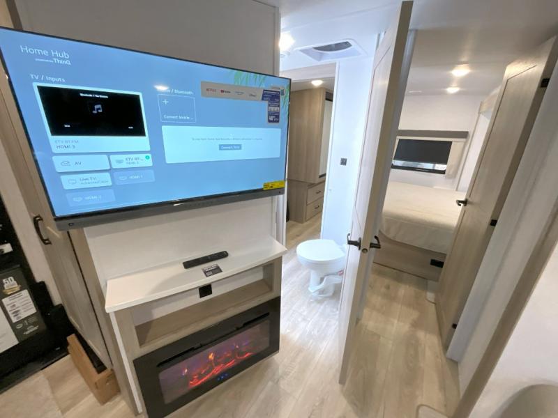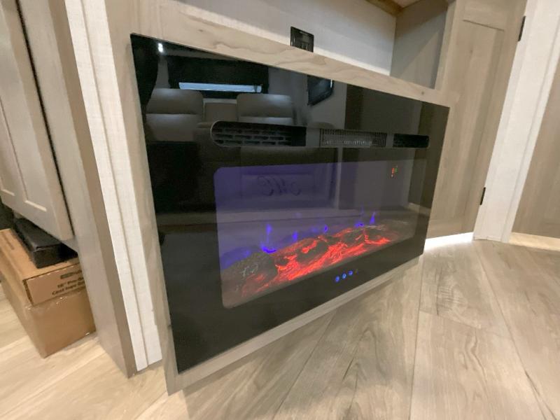 This is the perfect couples trailer with a spacious living and kitchen area and a rear bedroom which includes the second exterior entry/exit door! The bedroom also provides a slide out queen bed, a wardrobe and an optional TV, plus windows for great views and access to the double entry bathroom. The front kitchen gives the cook counter space and cabinetry for dishes and such, plus all the appliances needed to make warm meals and store leftovers. You can dine at the booth dinette, relax on the 67" theater seating and watch the Smart TV while enjoying the fireplace.