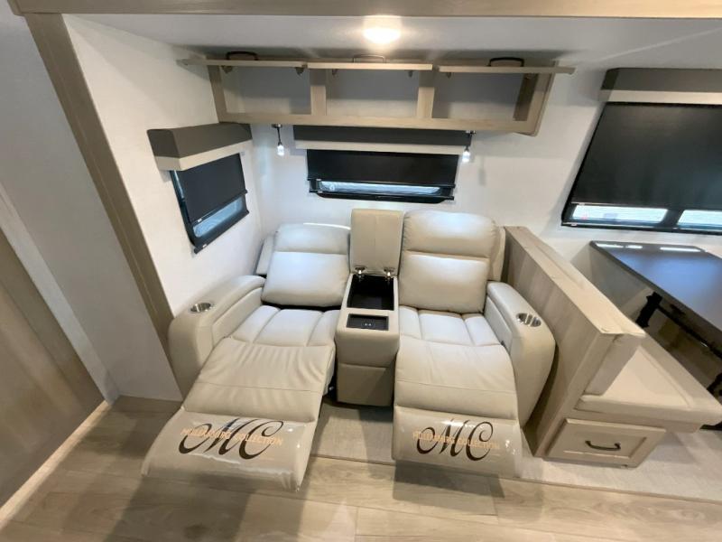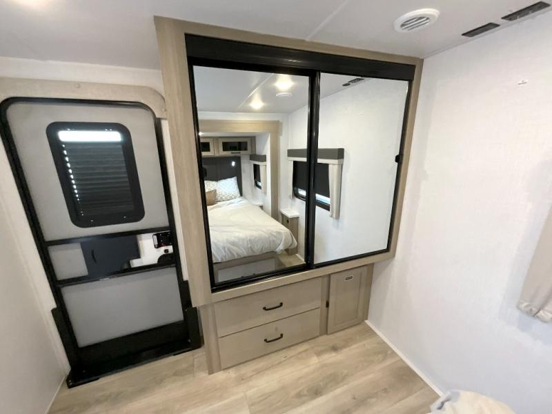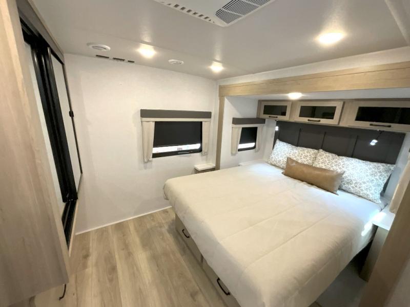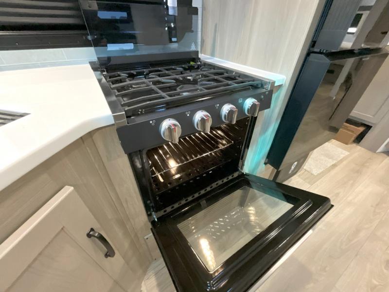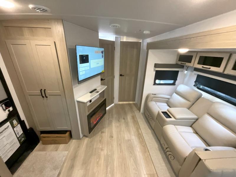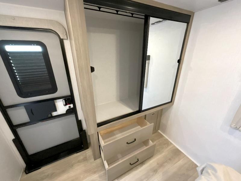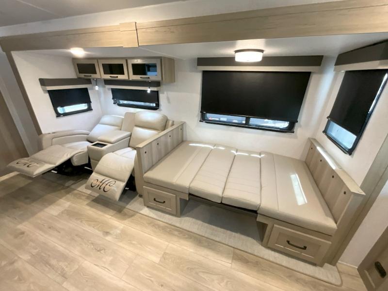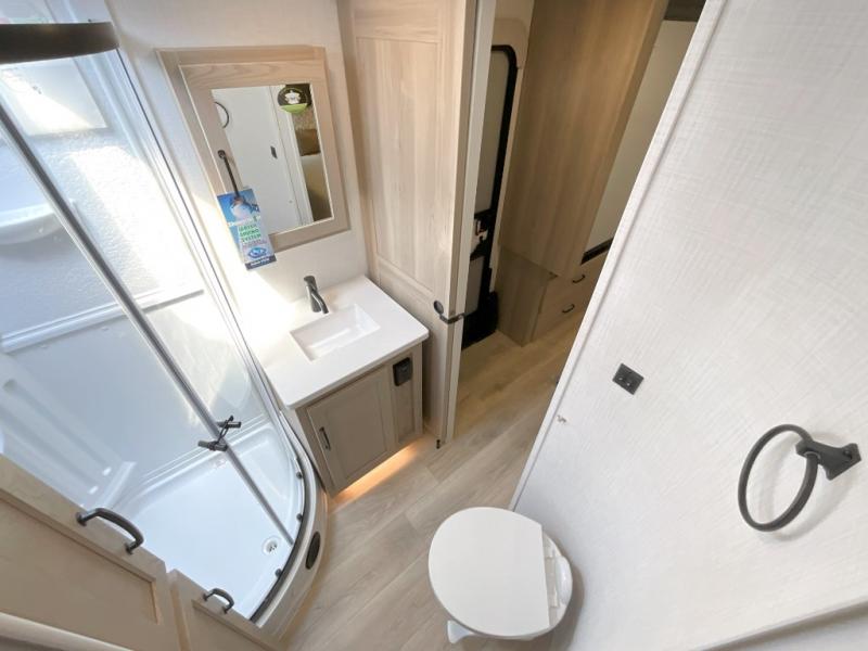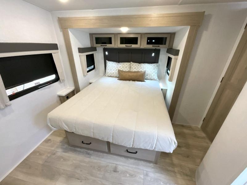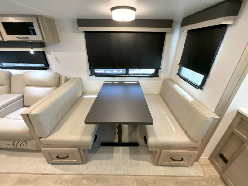 This is the perfect couples trailer with a spacious living and kitchen area and a rear bedroom which includes the second exterior entry/exit door! The bedroom also provides a slide out queen bed, a wardrobe and an optional TV, plus windows for great views and access to the double entry bathroom. The front kitchen gives the cook counter space and cabinetry for dishes and such, plus all the appliances needed to make warm meals and store leftovers. You can dine at the booth dinette, relax on the 67" theater seating and watch the Smart TV while enjoying the fireplace.