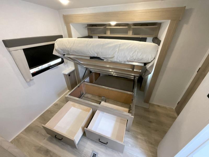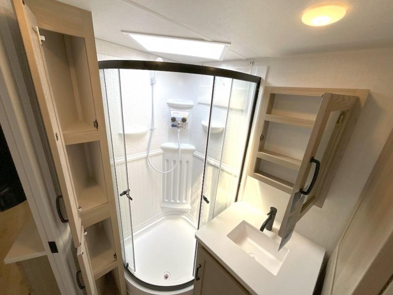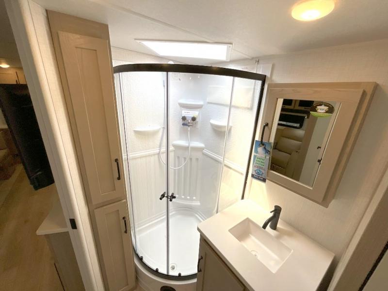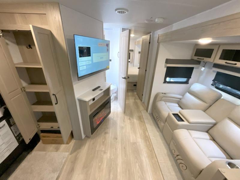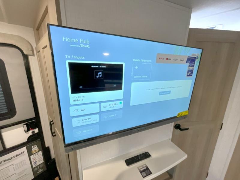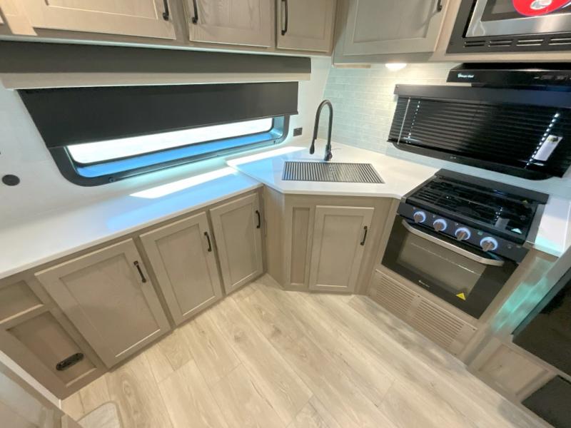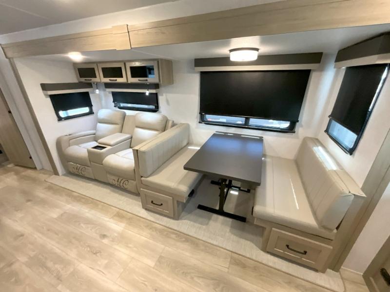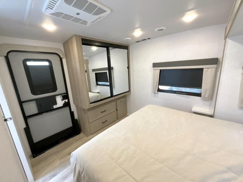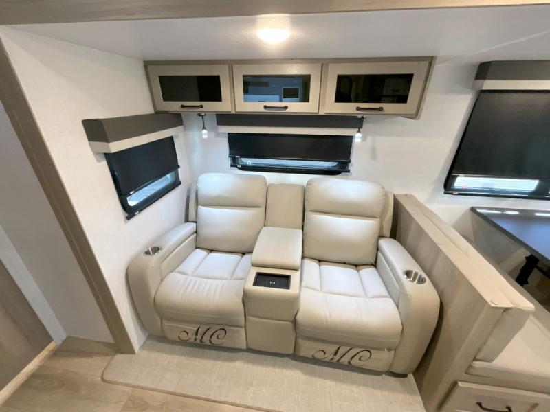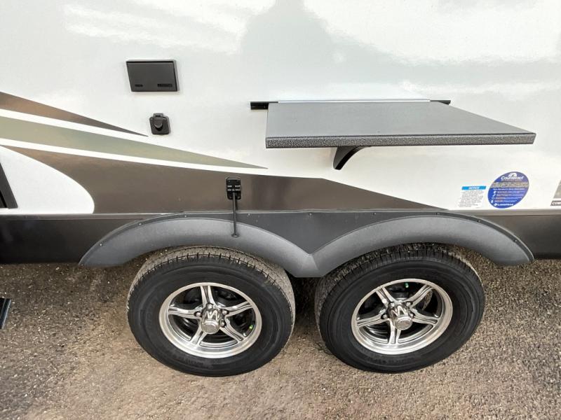 This is the perfect couples trailer with a spacious living and kitchen area and a rear bedroom which includes the second exterior entry/exit door! The bedroom also provides a slide out queen bed, a wardrobe and an optional TV, plus windows for great views and access to the double entry bathroom. The front kitchen gives the cook counter space and cabinetry for dishes and such, plus all the appliances needed to make warm meals and store leftovers. You can dine at the booth dinette, relax on the 67" theater seating and watch the Smart TV while enjoying the fireplace.