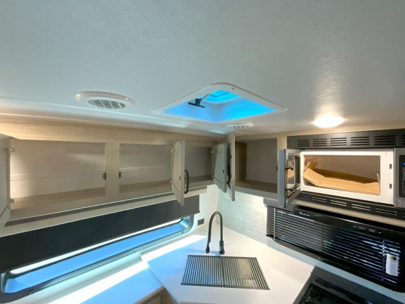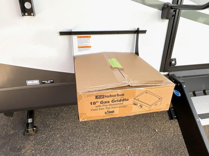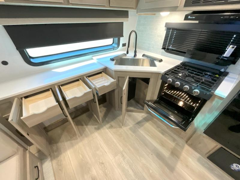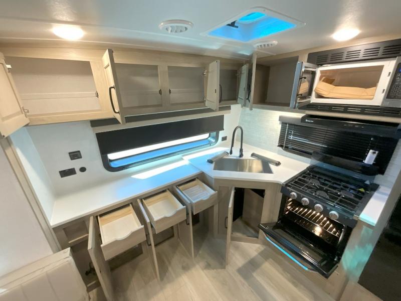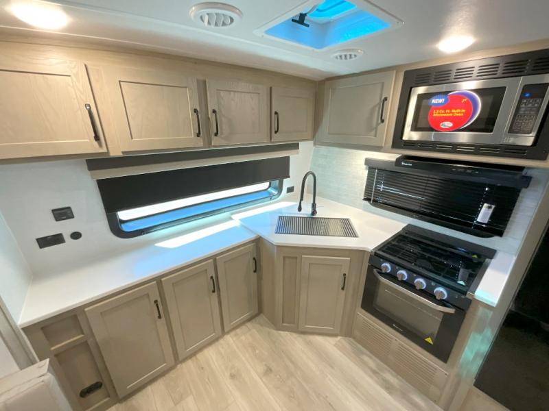 With any Flagstaff Super Lite travel trailer by Forest River the towing features include the TST tire pressure monitor system with a monitor providing safety on the road, Easy Lube axles and Nev-R adjust brakes, a power tongue jack for easy setup, and rear observation camera prep. Each is built with 6 sided aluminum framed side walls, end wall, front, floor and a roof, a plywood tongue and groove subfloor, electronically controlled heated holding tanks and an enclosed underbelly allowing you to travel during any season. The interior includes designer kitchen backsplash, solid surface kitchen countertops, Sedonwood cabinetry, and solid wood cabinet doors and drawers to make you feel right at home.