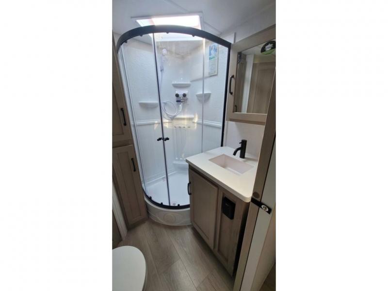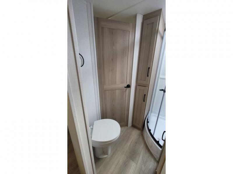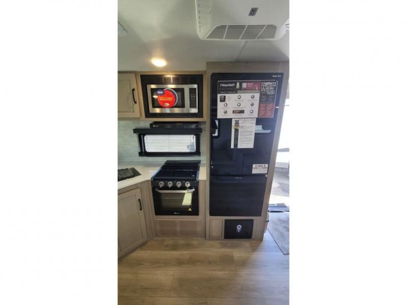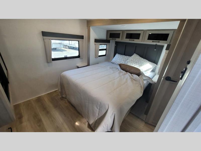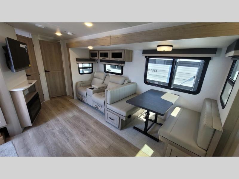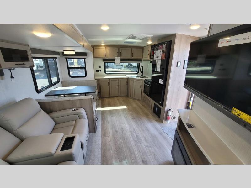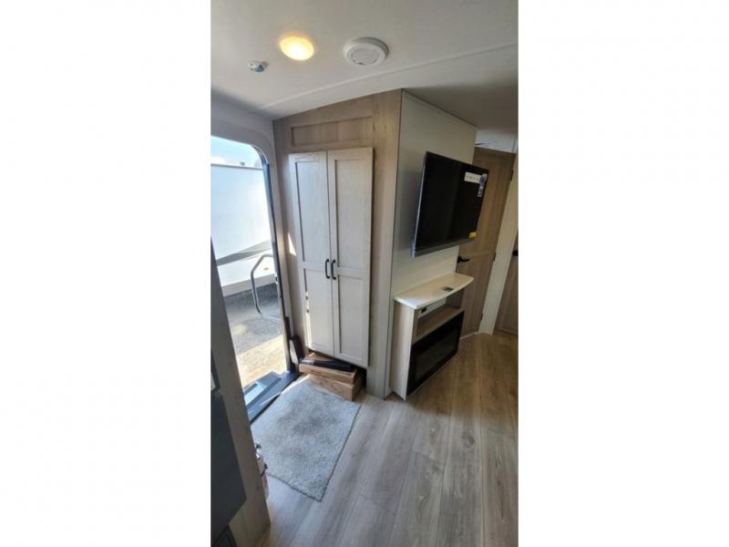 This is the perfect couples trailer with a spacious living and kitchen area and a rear bedroom which includes the second exterior entry/exit door! The bedroom also provides a slide out queen bed, a wardrobe and an optional TV, plus windows for great views and access to the double entry bathroom. The front kitchen gives the cook counter space and cabinetry for dishes and such, plus all the appliances needed to make warm meals and store leftovers. You can dine at the booth dinette, relax on the 67" theater seating and watch the Smart TV while enjoying the fireplace.