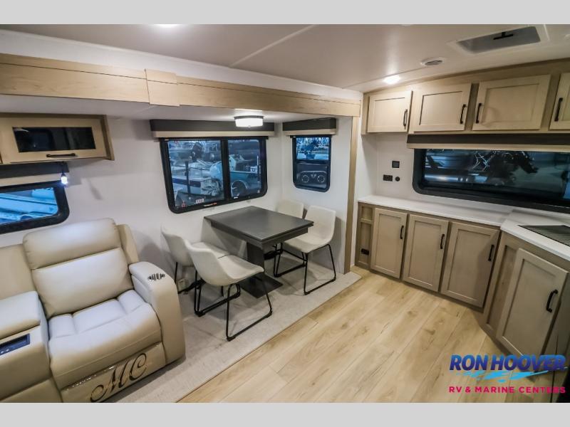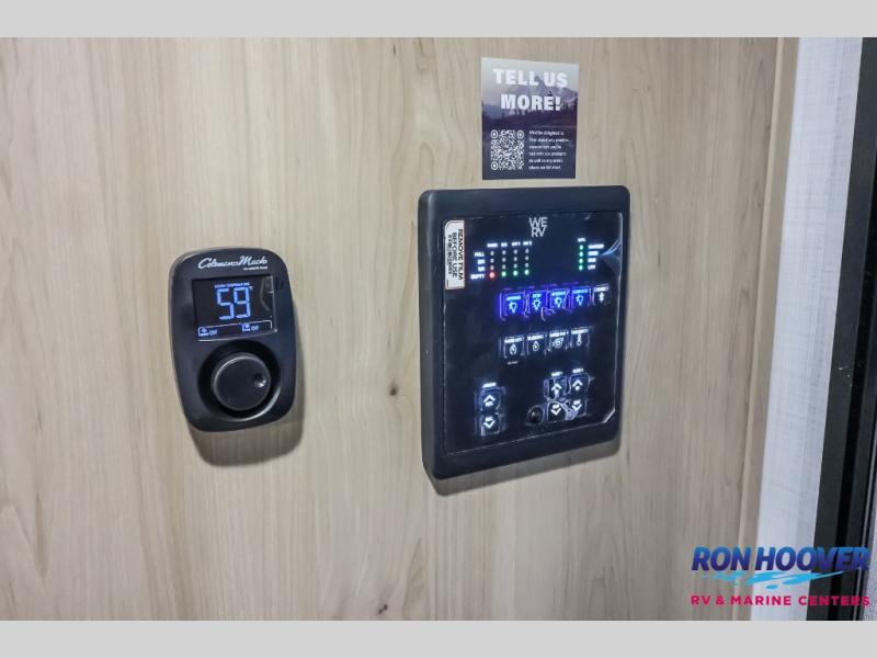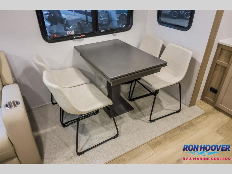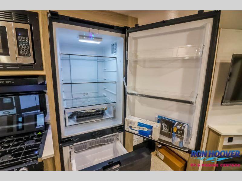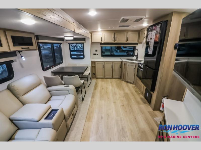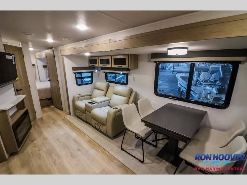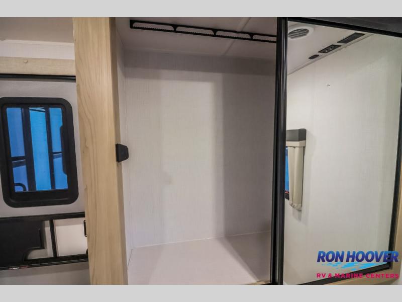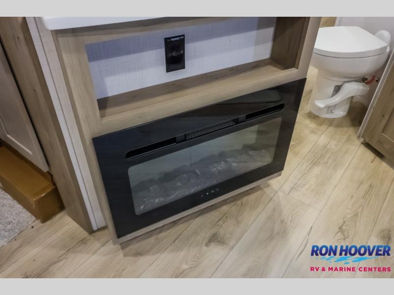 This is the perfect couples trailer with a spacious living and kitchen area and a rear bedroom which includes the second exterior entry/exit door! The bedroom also provides a slide out queen bed, a wardrobe and an optional TV, plus windows for great views and access to the double entry bathroom. The front kitchen gives the cook counter space and cabinetry for dishes and such, plus all the appliances needed to make warm meals and store leftovers. You can dine at the booth dinette, relax on the 67" theater seating and watch the Smart TV while enjoying the fireplace.