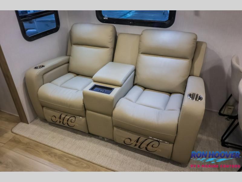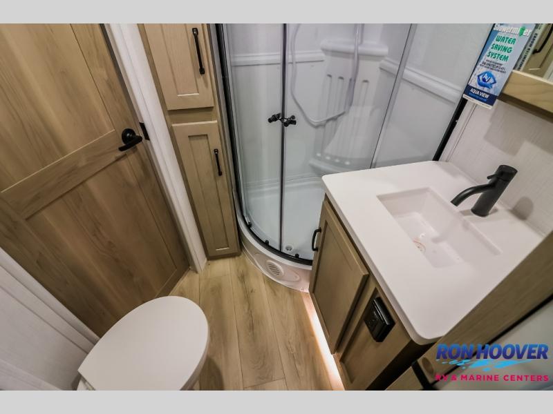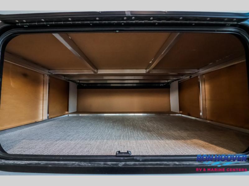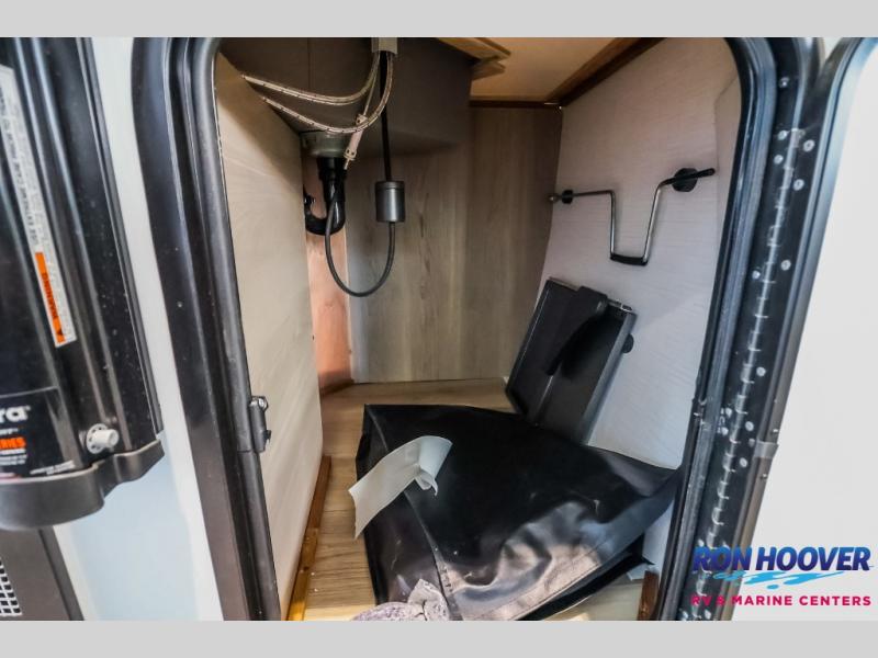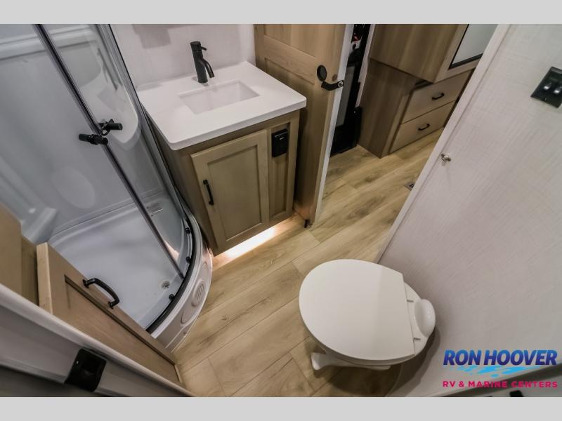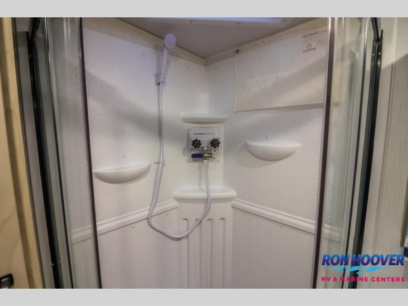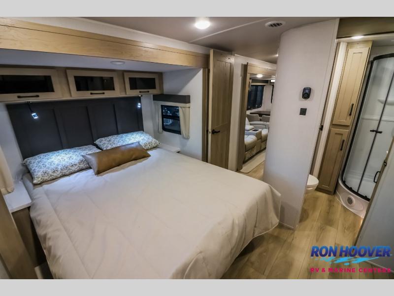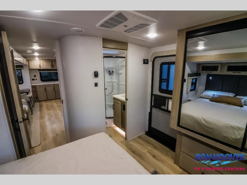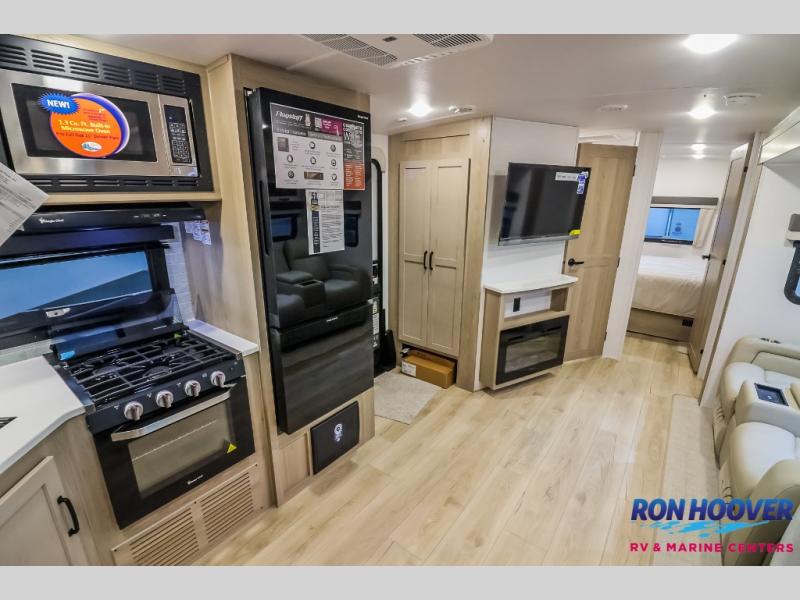 This is the perfect couples trailer with a spacious living and kitchen area and a rear bedroom which includes the second exterior entry/exit door! The bedroom also provides a slide out queen bed, a wardrobe and an optional TV, plus windows for great views and access to the double entry bathroom. The front kitchen gives the cook counter space and cabinetry for dishes and such, plus all the appliances needed to make warm meals and store leftovers. You can dine at the booth dinette, relax on the 67" theater seating and watch the Smart TV while enjoying the fireplace.