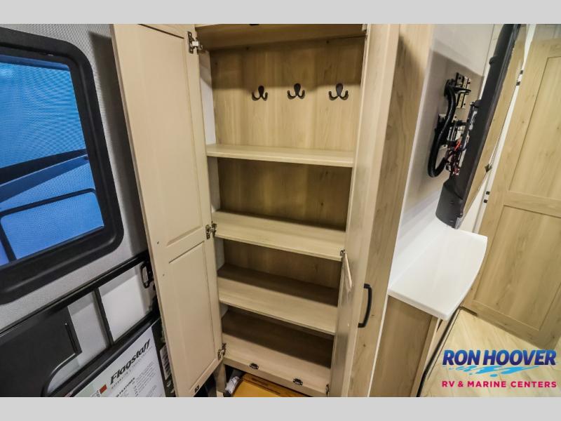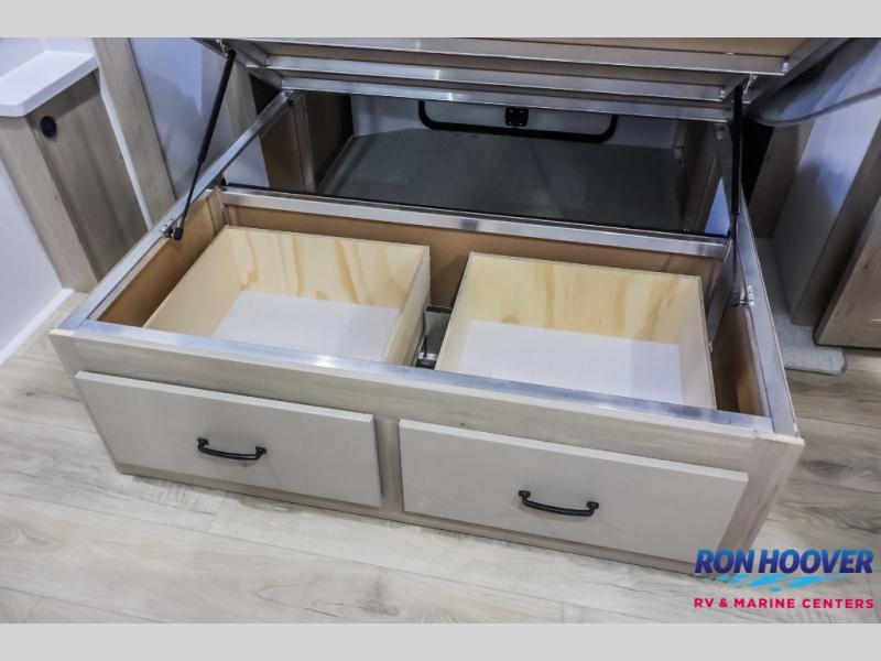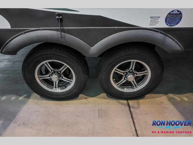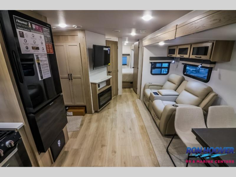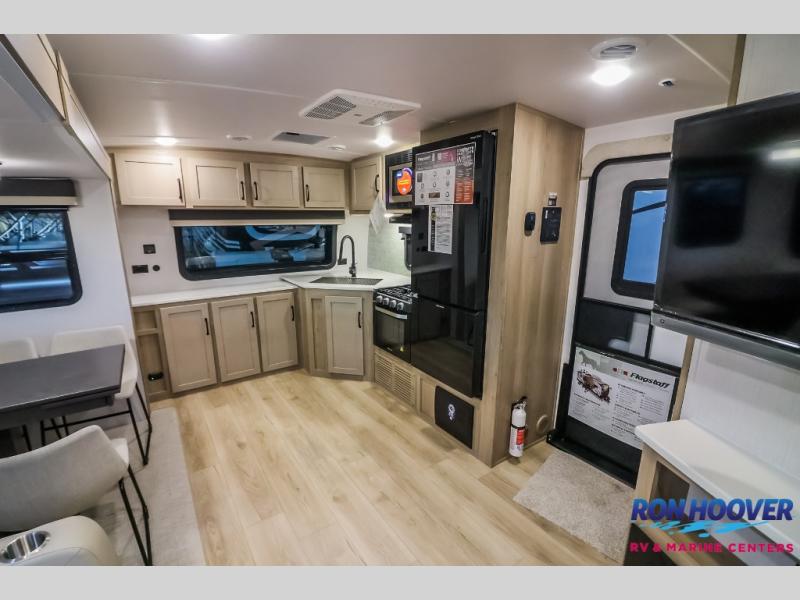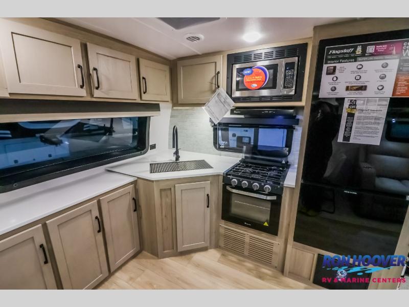 With any Flagstaff Super Lite travel trailer by Forest River the towing features include the TST tire pressure monitor system with a monitor providing safety on the road, Easy Lube axles and Nev-R adjust brakes, a power tongue jack for easy setup, and rear observation camera prep. Each is built with 6 sided aluminum framed side walls, end wall, front, floor and a roof, a plywood tongue and groove subfloor, electronically controlled heated holding tanks and an enclosed underbelly allowing you to travel during any season. The interior includes designer kitchen backsplash, solid surface kitchen countertops, Sedonwood cabinetry, and solid wood cabinet doors and drawers to make you feel right at home.
