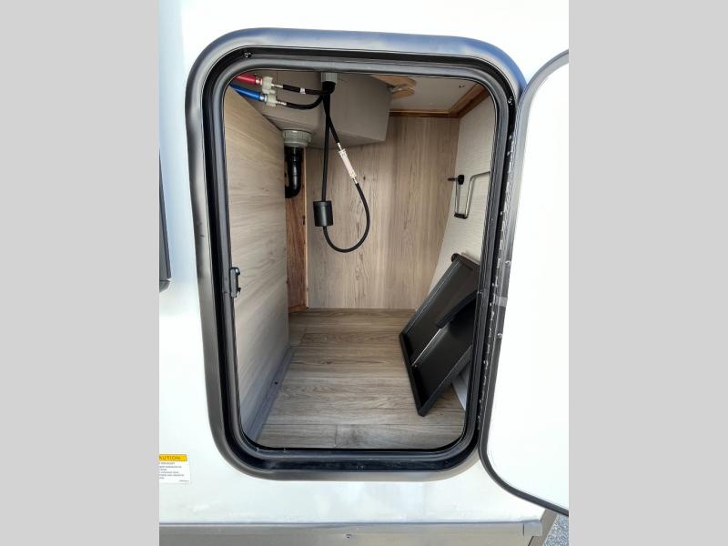 This is the perfect couples trailer with a spacious living and kitchen area and a rear bedroom which includes the second exterior entry/exit door! The bedroom also provides a slide out queen bed, a wardrobe and an optional TV, plus windows for great views and access to the double entry bathroom. The front kitchen gives the cook counter space and cabinetry for dishes and such, plus all the appliances needed to make warm meals and store leftovers. You can dine at the booth dinette, relax on the 67" theater seating and watch the Smart TV while enjoying the fireplace.
