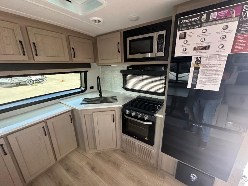 With any Flagstaff Super Lite travel trailer by Forest River the towing features include the TST tire pressure monitor system with a monitor providing safety on the road, Easy Lube axles and Nev-R adjust brakes, a power tongue jack for easy setup, and rear observation camera prep. Each is built with 6 sided aluminum framed side walls, end wall, front, floor and a roof, a plywood tongue and groove subfloor, electronically controlled heated holding tanks and an enclosed underbelly allowing you to travel during any season. The interior includes designer kitchen backsplash, solid surface kitchen countertops, Sedonwood cabinetry, and solid wood cabinet doors and drawers to make you feel right at home.