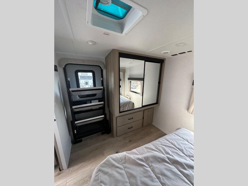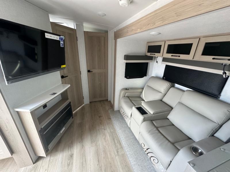 This is the perfect couples trailer with a spacious living and kitchen area and a rear bedroom which includes the second exterior entry/exit door! The bedroom also provides a slide out queen bed, a wardrobe and an optional TV, plus windows for great views and access to the double entry bathroom. The front kitchen gives the cook counter space and cabinetry for dishes and such, plus all the appliances needed to make warm meals and store leftovers. You can dine at the booth dinette, relax on the 67" theater seating and watch the Smart TV while enjoying the fireplace.