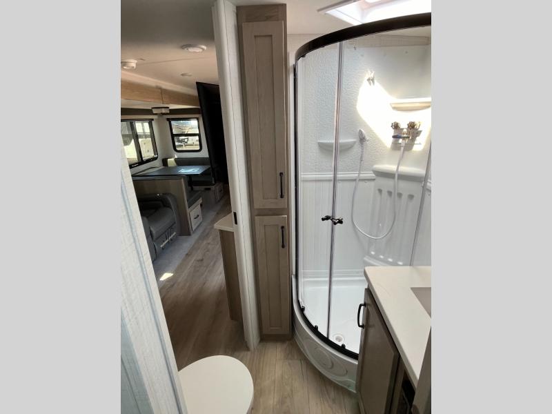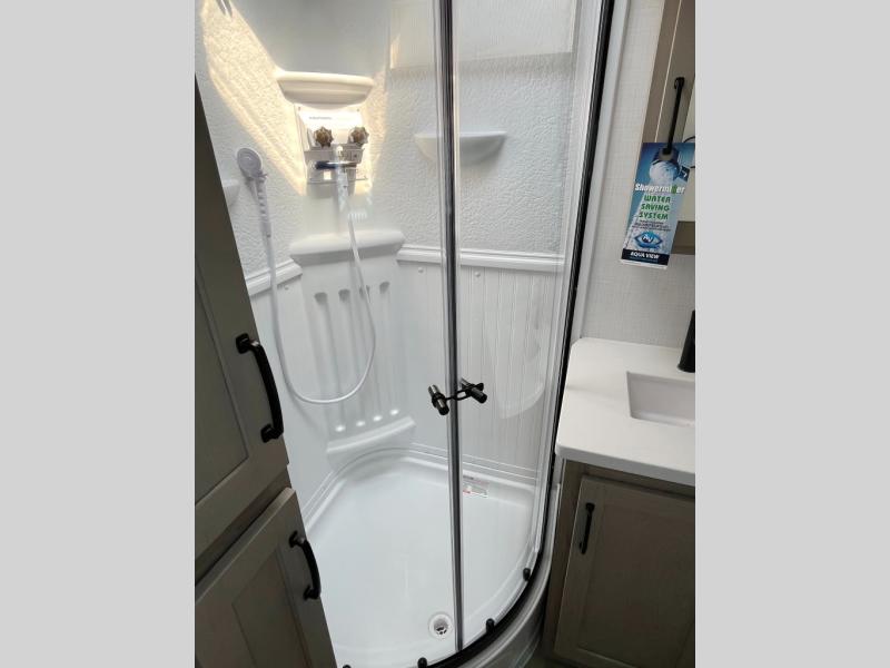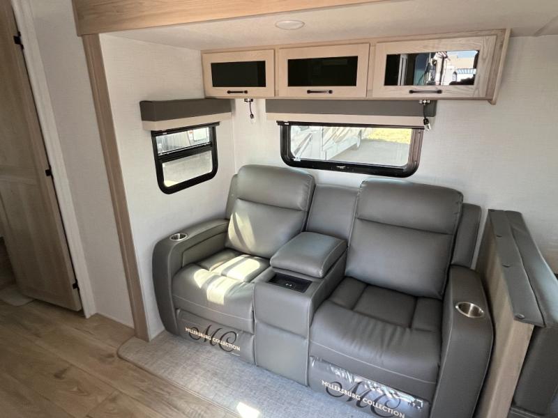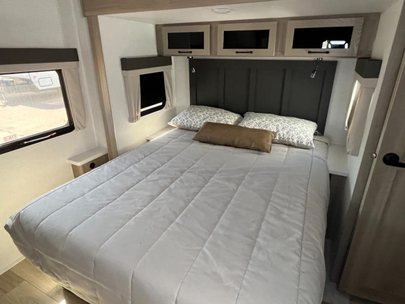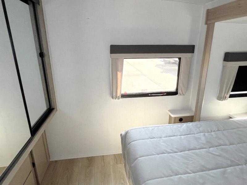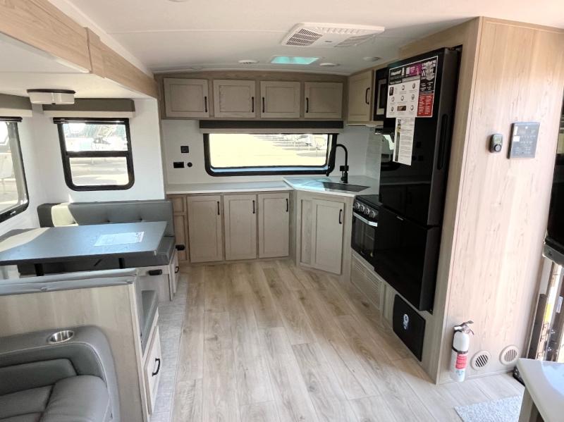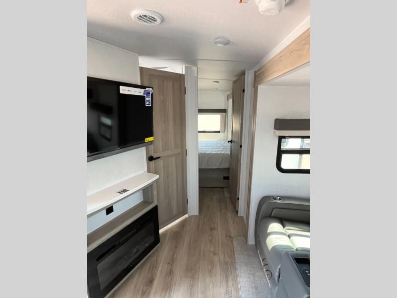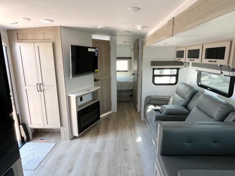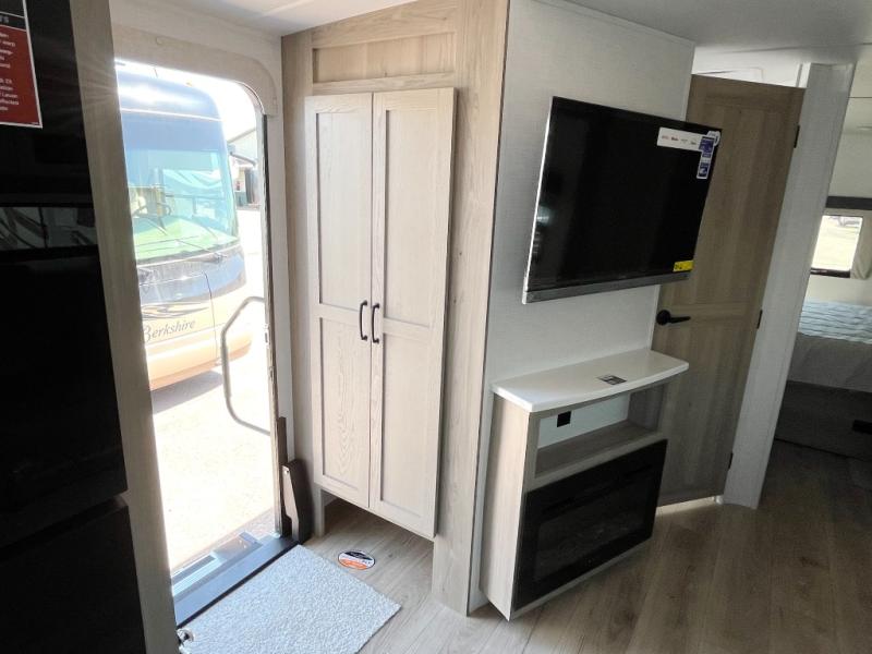 This is the perfect couples trailer with a spacious living and kitchen area and a rear bedroom which includes the second exterior entry/exit door! The bedroom also provides a slide out queen bed, a wardrobe and an optional TV, plus windows for great views and access to the double entry bathroom. The front kitchen gives the cook counter space and cabinetry for dishes and such, plus all the appliances needed to make warm meals and store leftovers. You can dine at the booth dinette, relax on the 67" theater seating and watch the Smart TV while enjoying the fireplace.