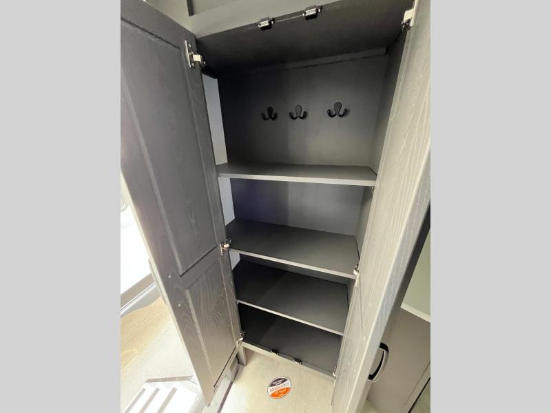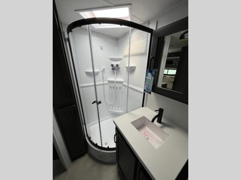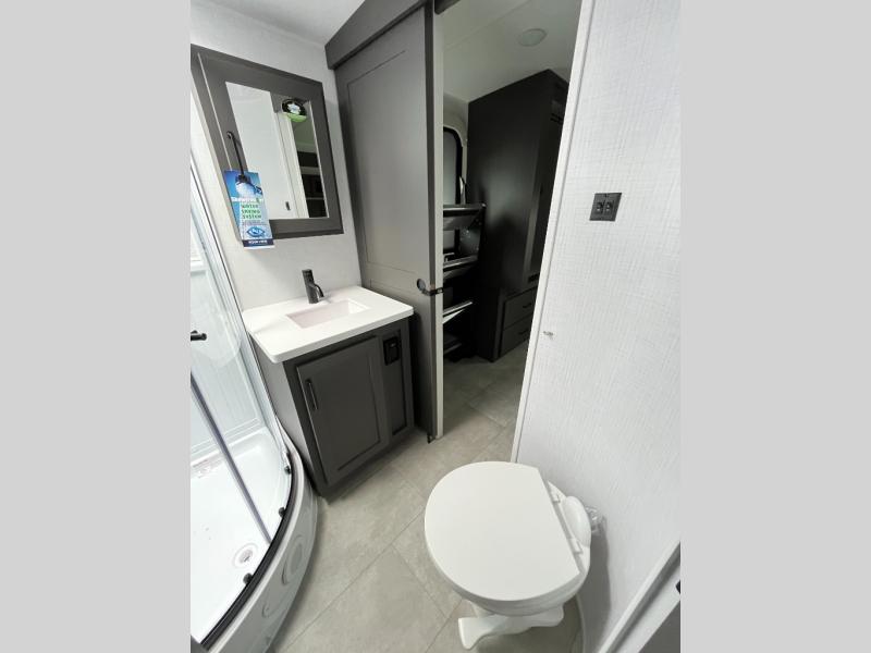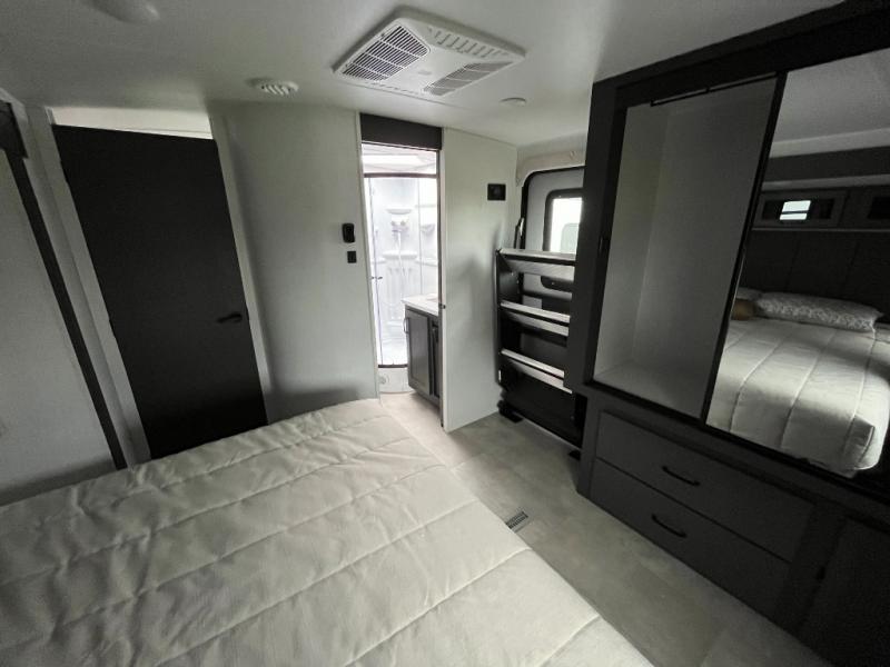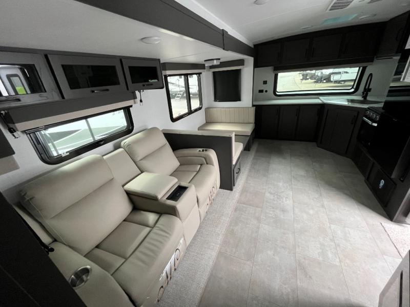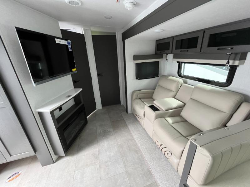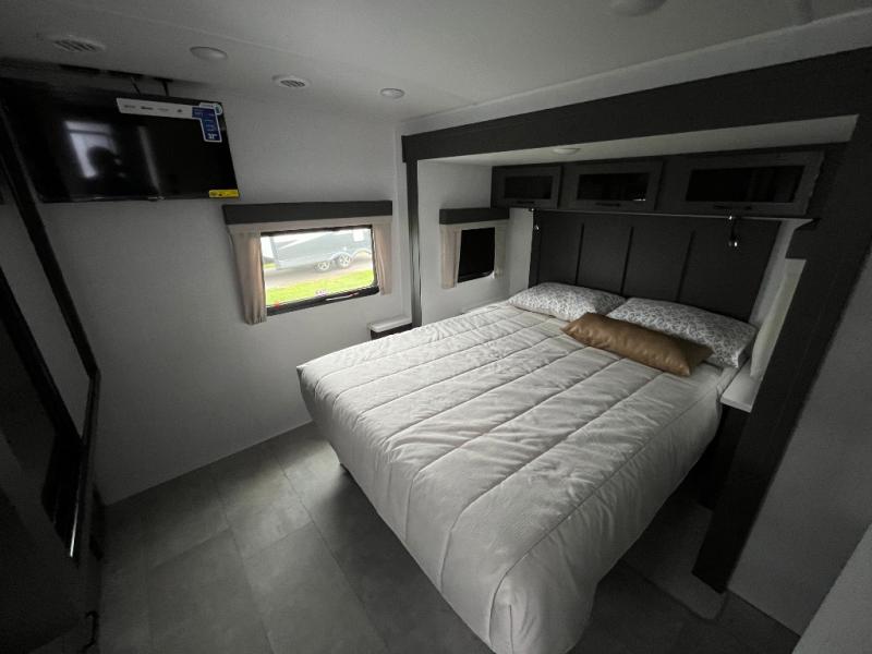 This is the perfect couples trailer with a spacious living and kitchen area and a rear bedroom which includes the second exterior entry/exit door! The bedroom also provides a slide out queen bed, a wardrobe and an optional TV, plus windows for great views and access to the double entry bathroom. The front kitchen gives the cook counter space and cabinetry for dishes and such, plus all the appliances needed to make warm meals and store leftovers. You can dine at the booth dinette, relax on the 67" theater seating and watch the Smart TV while enjoying the fireplace.