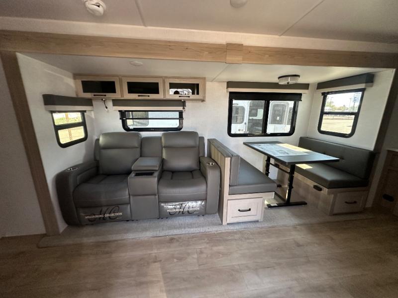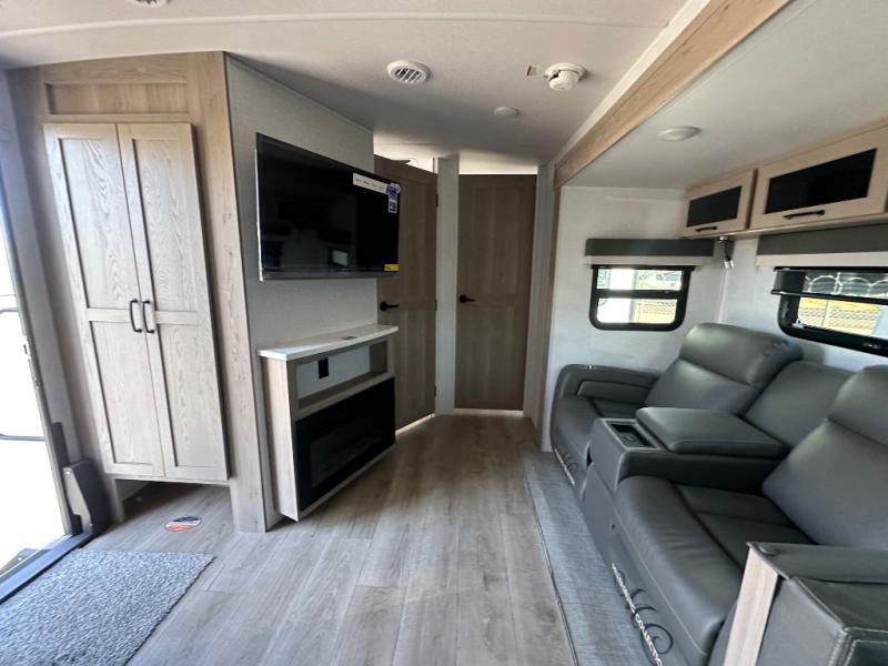 Spacious Living Area – Centered between front kitchen and rear bedroom, featuring theater seating (˜ 67?), entertainment center, and fireplace. Great for relaxing after a day outdoors.