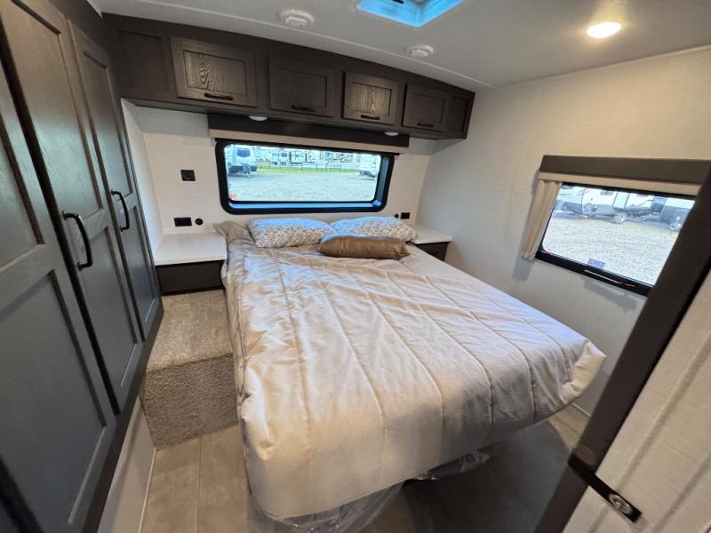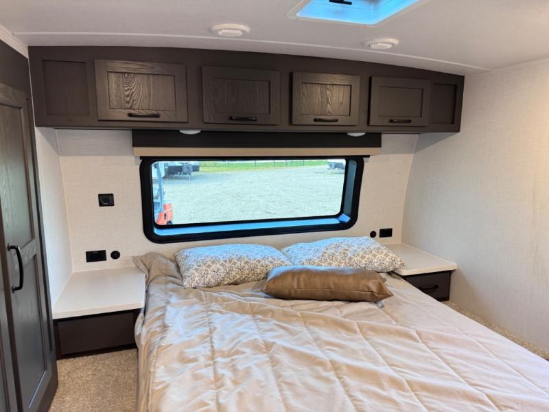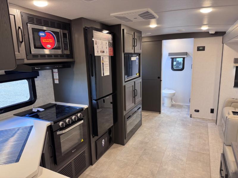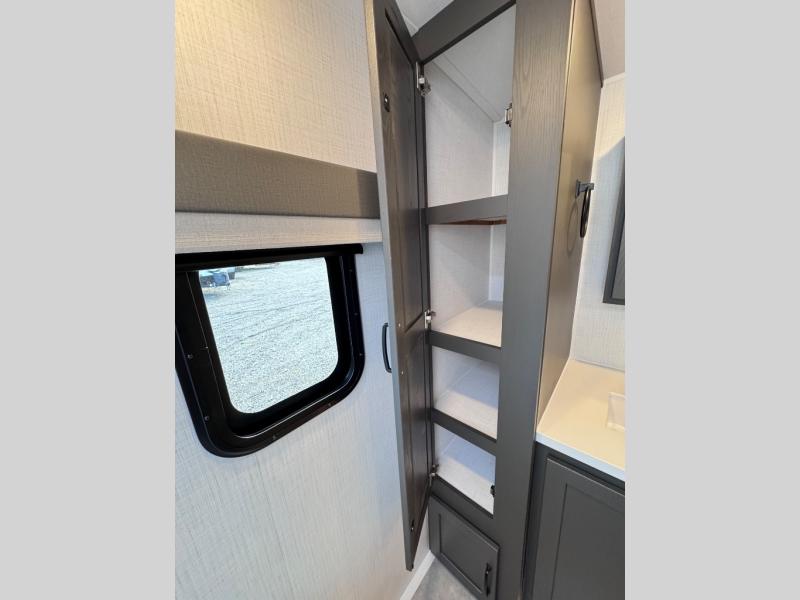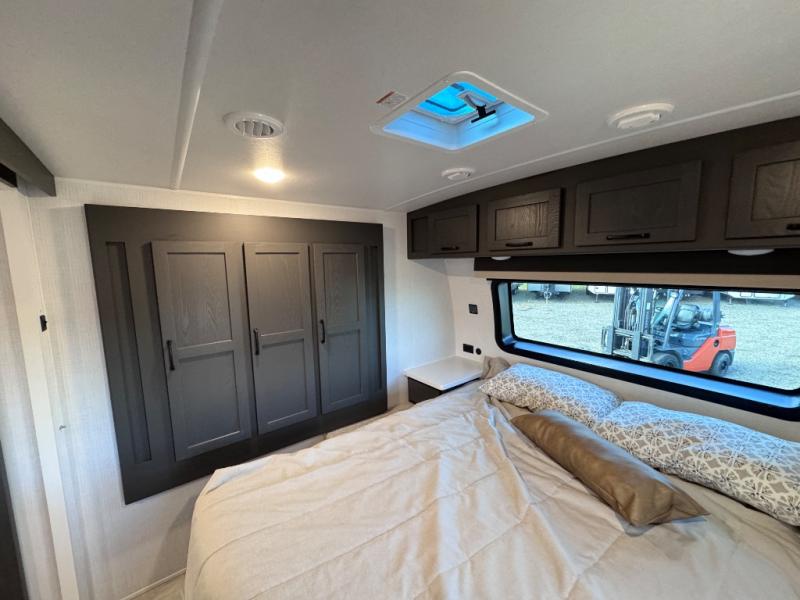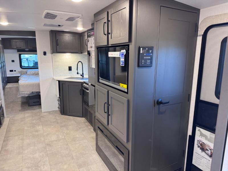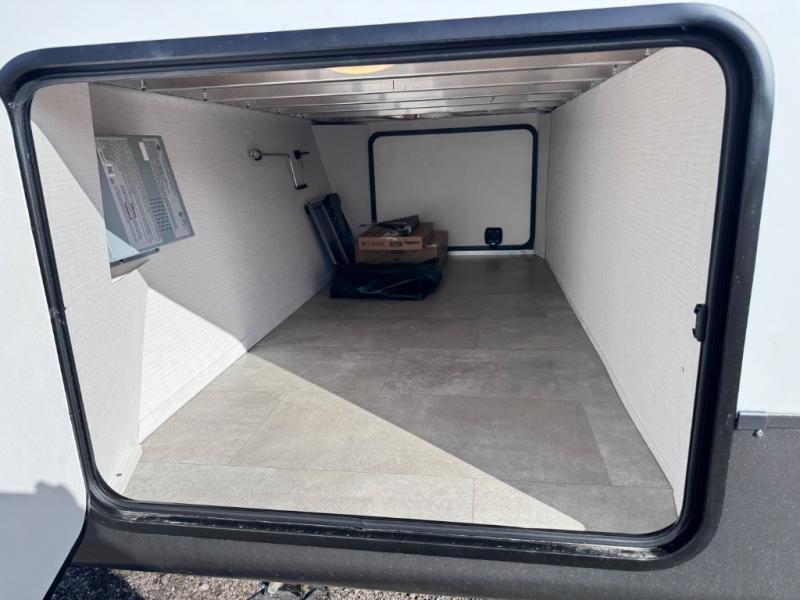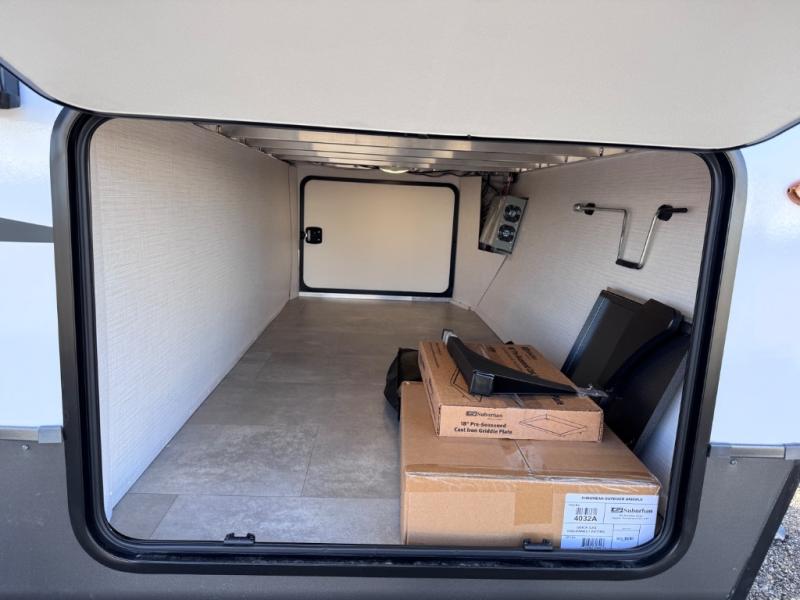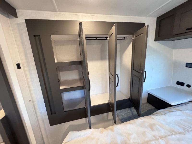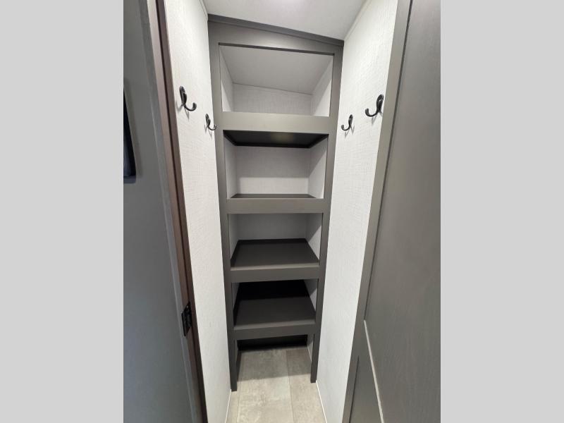 Enjoy inside comforts, and outside conveniences in this trailer. You can relax under the 21' awning which offers an outdoor living area protected from the elements, and a pass-thru storage with an optional steel sliding tray gives you the option to easily access your gear. You'll find ample storage space inside as well, including a walk-in pantry by the entry door for convenience! The cook will have full amenities to make meals, and when you are ready to sleep, head to the front bedroom with a queen bed and plenty of storage, and a wardrobe slide out giving you more floor and storage space.
