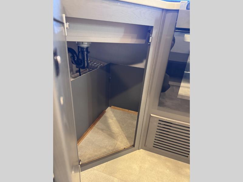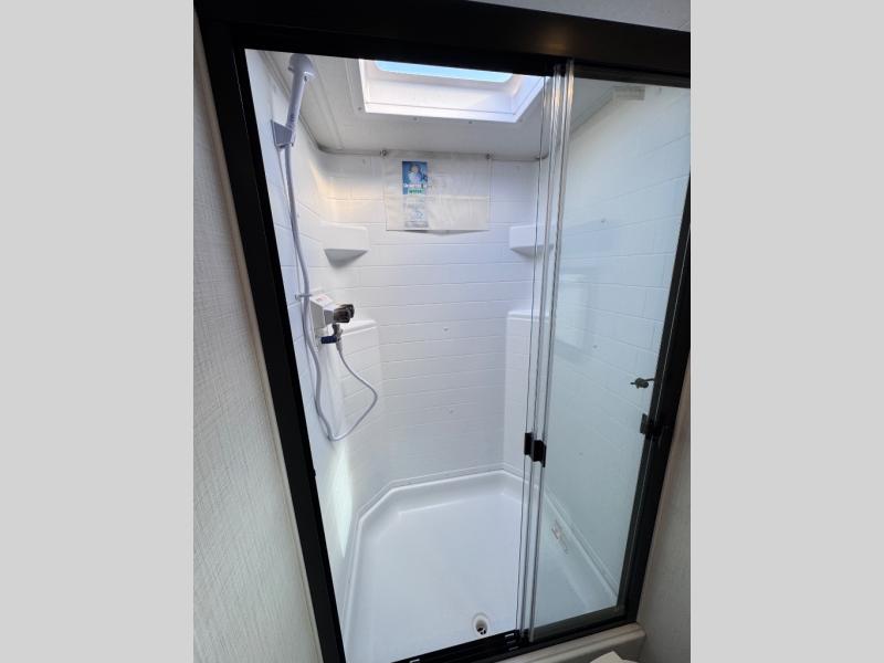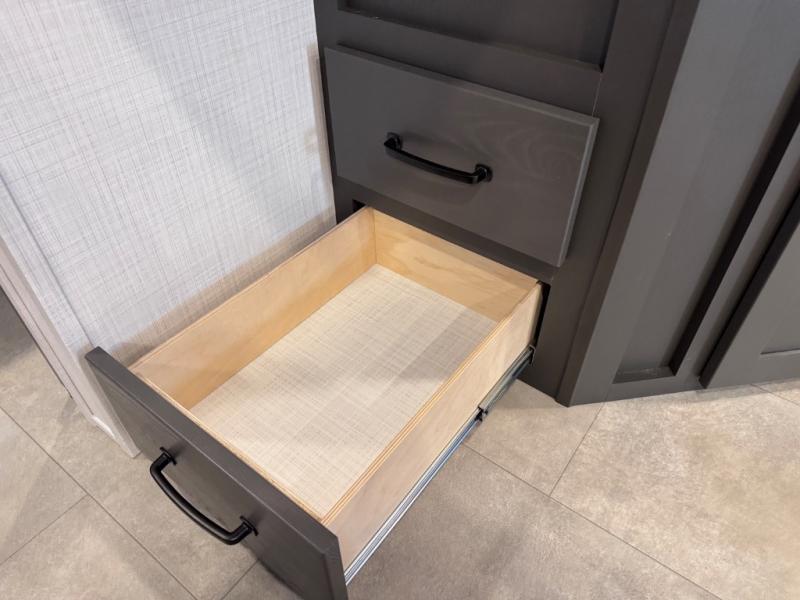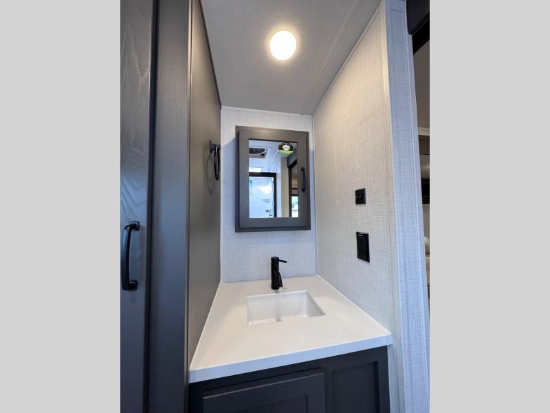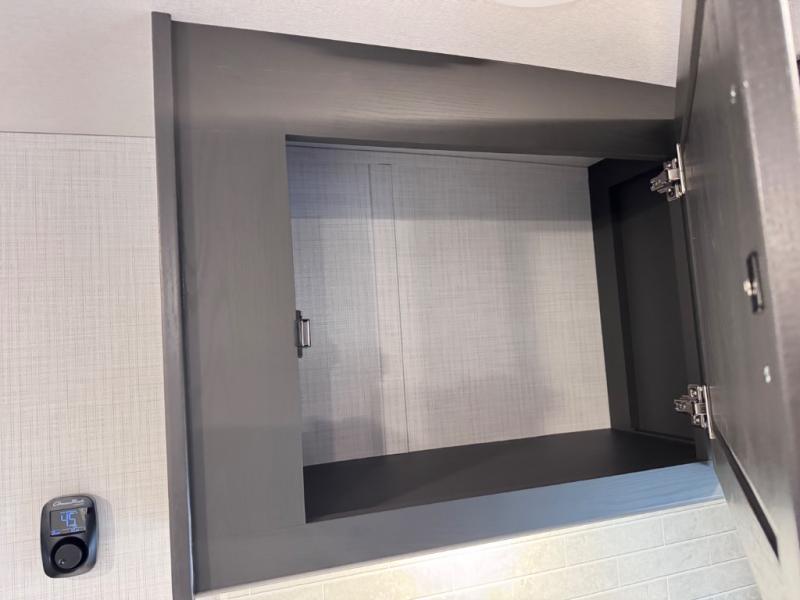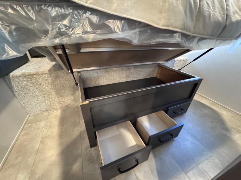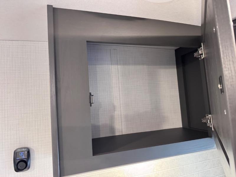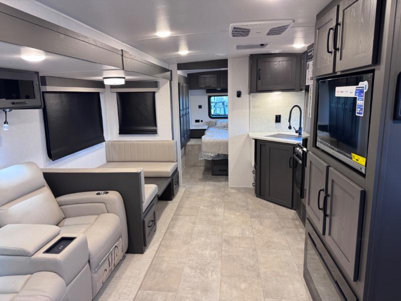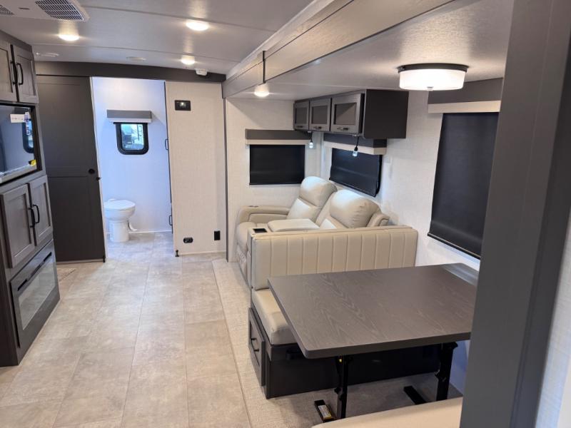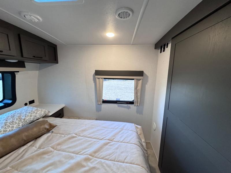 Enjoy inside comforts, and outside conveniences in this trailer. You can relax under the 21' awning which offers an outdoor living area protected from the elements, and a pass-thru storage with an optional steel sliding tray gives you the option to easily access your gear. You'll find ample storage space inside as well, including a walk-in pantry by the entry door for convenience! The cook will have full amenities to make meals, and when you are ready to sleep, head to the front bedroom with a queen bed and plenty of storage, and a wardrobe slide out giving you more floor and storage space.