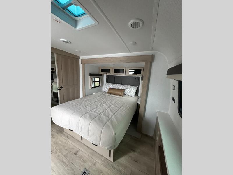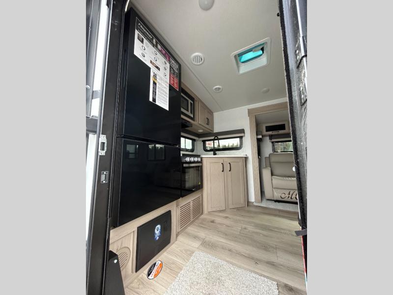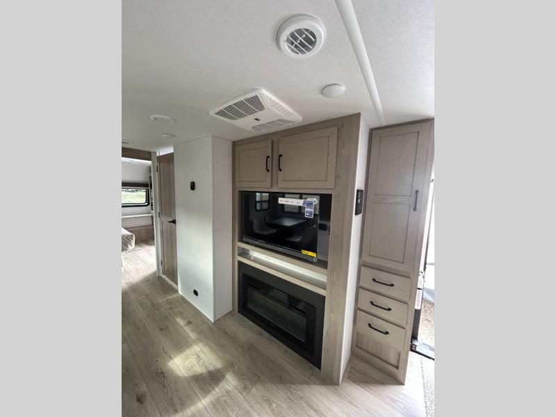 Whether you camp at state parks, national forests or on your friend's land, this trailer offers you plenty of floor space thanks to the two slide outs! As you enter the main entrance near the rear kitchen you can grab a drink from the 12V refrigerator or a snack from the pantry and relax on the 60" theater seating or sit at the booth dinette. The Smart TV offers entertainment while the fireplace will keep you cozy during the cooler months. Everyone will appreciate having a full bathroom to get cleaned up in, and the front bedroom gives you privacy and a queen bed slide, plus storage and the second exterior entry. If you don't need the second entry door you can choose the optional desk and window in place of the door!