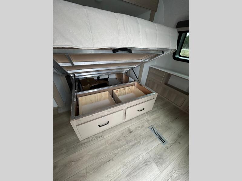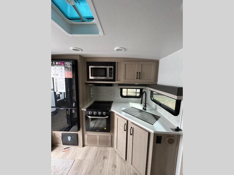 With any Flagstaff Super Lite travel trailer by Forest River the towing features include the TST tire pressure monitor system with a monitor providing safety on the road, Easy Lube axles and Nev-R adjust brakes, a power tongue jack for easy setup, and rear observation camera prep. Each is built with 6 sided aluminum framed side walls, end wall, front, floor and a roof, a plywood tongue and groove subfloor, electronically controlled heated holding tanks and an enclosed underbelly allowing you to travel during any season. The interior includes designer kitchen backsplash, solid surface kitchen countertops, Sedonwood cabinetry, and solid wood cabinet doors and drawers to make you feel right at home.