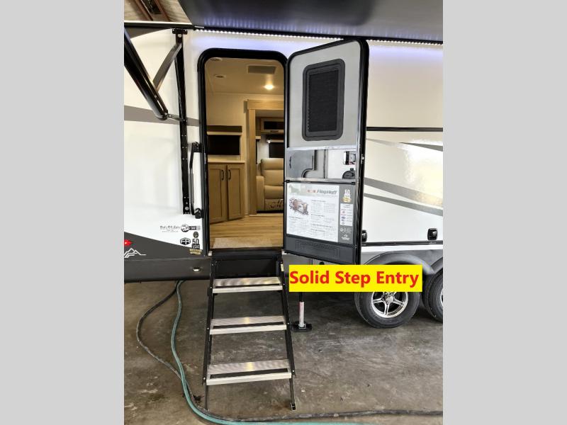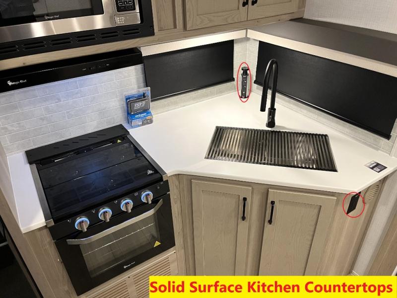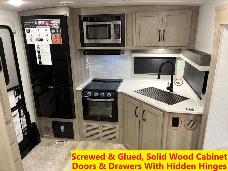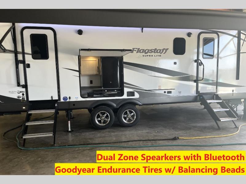 With any Flagstaff Super Lite travel trailer by Forest River the towing features include the TST tire pressure monitor system with a monitor providing safety on the road, Easy Lube axles and Nev-R adjust brakes, a power tongue jack for easy setup, and rear observation camera prep. Each is built with 6 sided aluminum framed side walls, end wall, front, floor and a roof, a plywood tongue and groove subfloor, electronically controlled heated holding tanks and an enclosed underbelly allowing you to travel during any season. The interior includes designer kitchen backsplash, solid surface kitchen countertops, Sedonwood cabinetry, and solid wood cabinet doors and drawers to make you feel right at home.