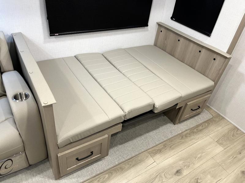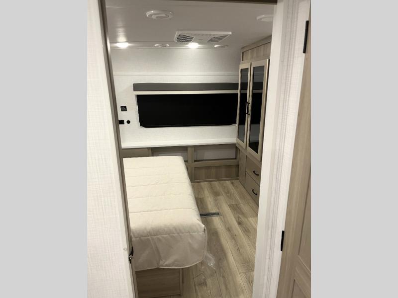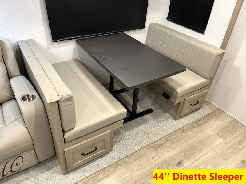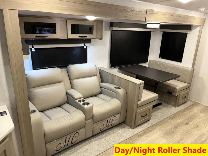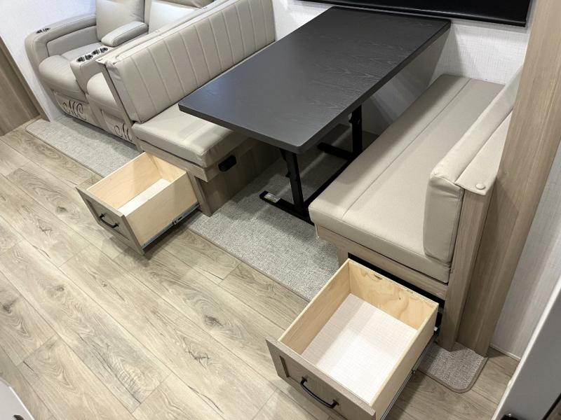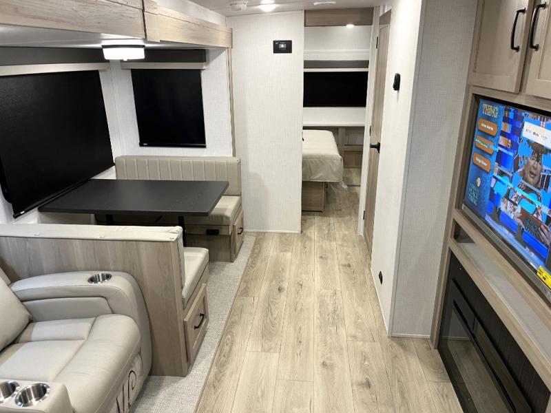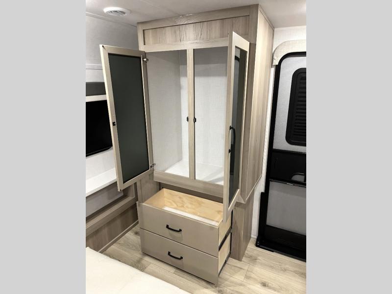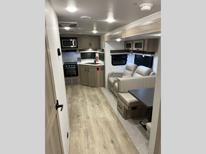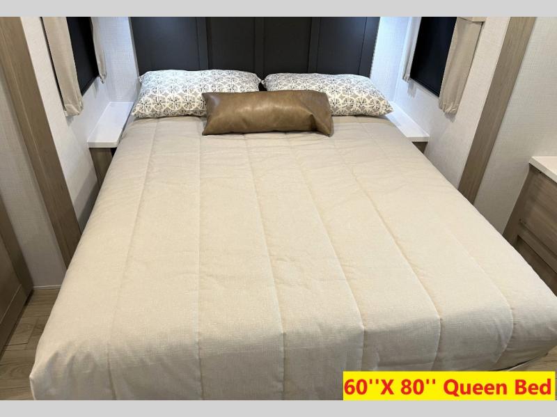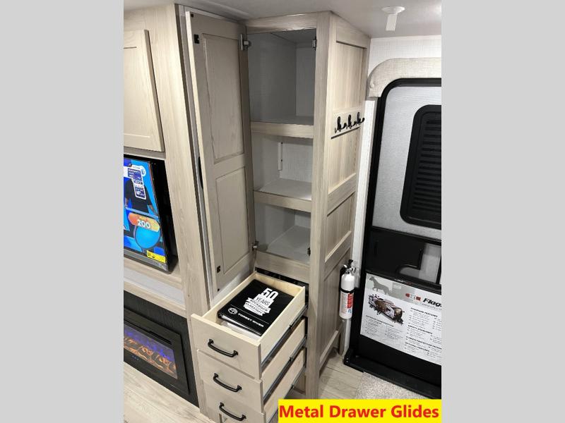Whether you camp at state parks, national forests or on your friend's land, this trailer offers you plenty of floor space thanks to the two slide outs! As you enter the main entrance near the rear kitchen you can grab a drink from the 12V refrigerator or a snack from the pantry and relax on the 60" theater seating or sit at the booth dinette. The Smart TV offers entertainment while the fireplace will keep you cozy during the cooler months. Everyone will appreciate having a full bathroom to get cleaned up in, and the front bedroom gives you privacy and a queen bed slide, plus storage and the second exterior entry. If you don't need the second entry door you can choose the optional desk and window in place of the door!