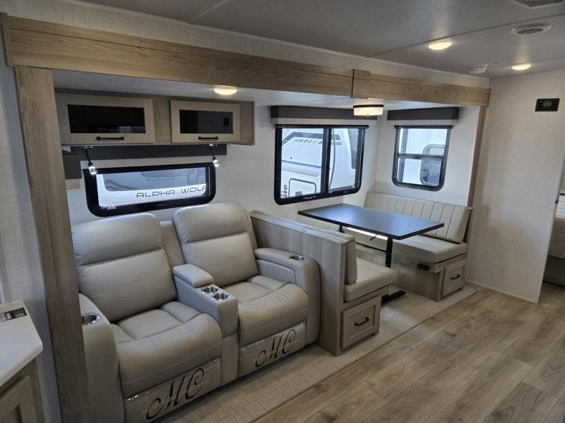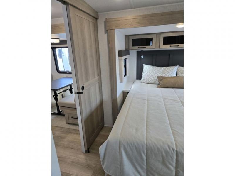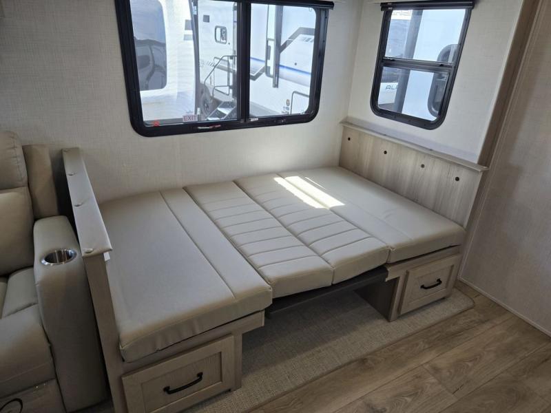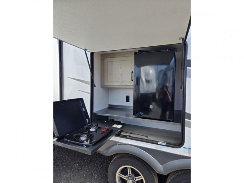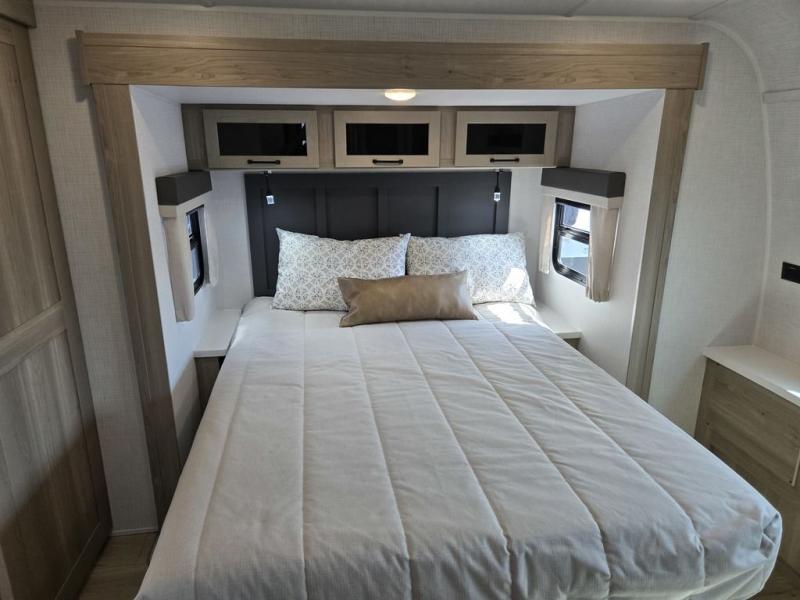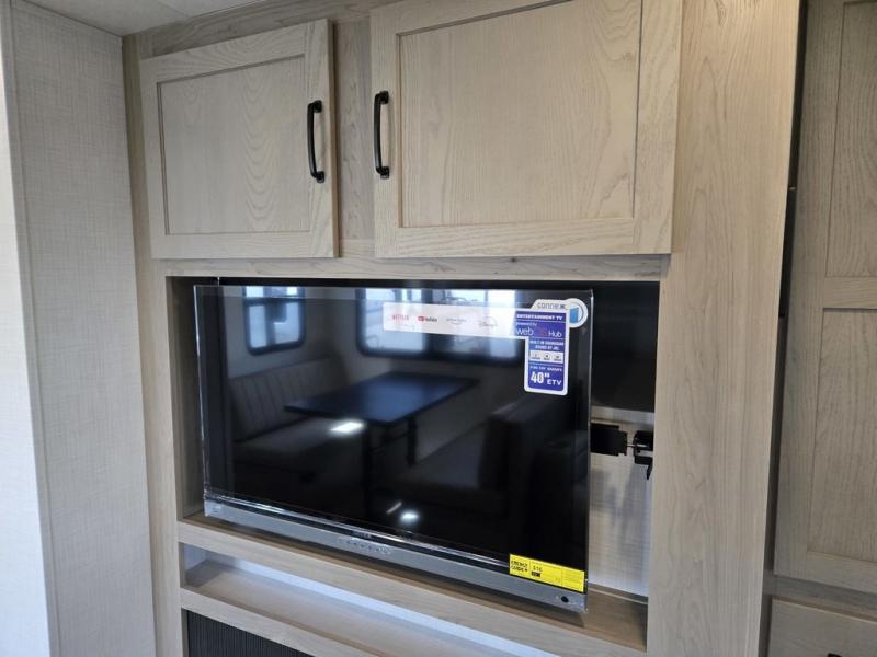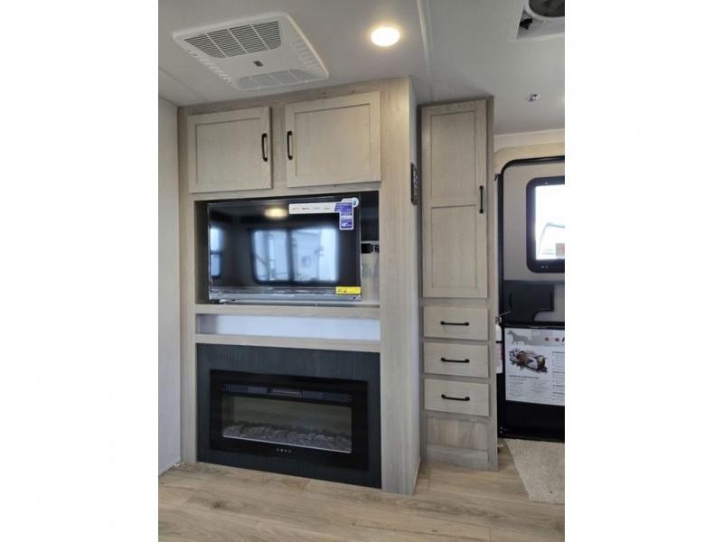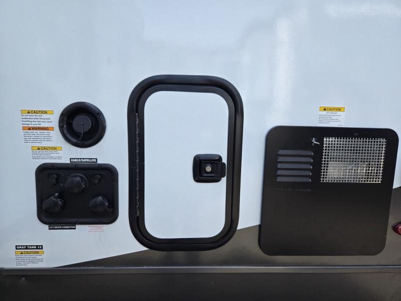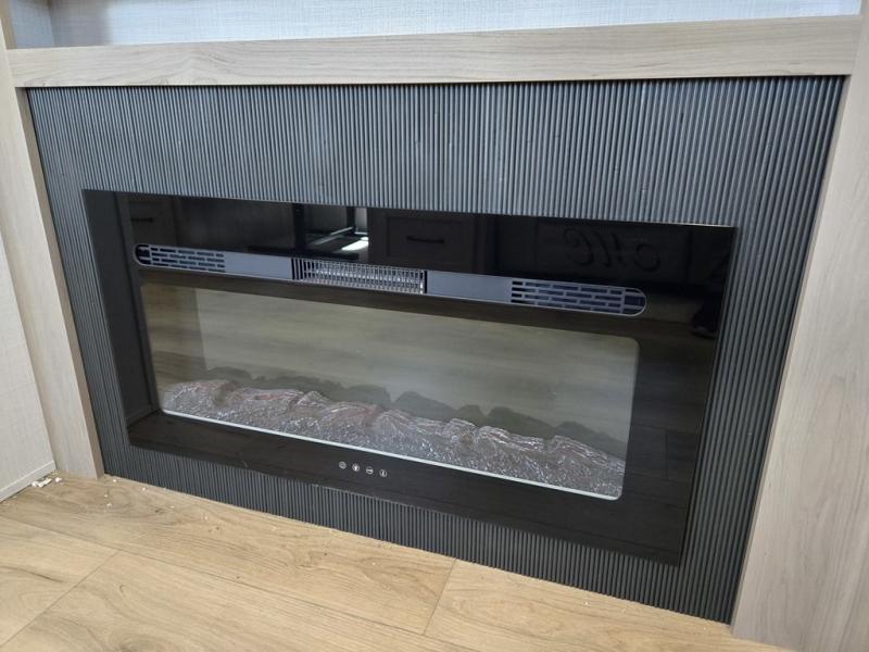 Whether you camp at state parks, national forests or on your friend's land, this trailer offers you plenty of floor space thanks to the two slide outs! As you enter the main entrance near the rear kitchen you can grab a drink from the 12V refrigerator or a snack from the pantry and relax on the 60" theater seating or sit at the booth dinette. The Smart TV offers entertainment while the fireplace will keep you cozy during the cooler months. Everyone will appreciate having a full bathroom to get cleaned up in, and the front bedroom gives you privacy and a queen bed slide, plus storage and the second exterior entry. If you don't need the second entry door you can choose the optional desk and window in place of the door!