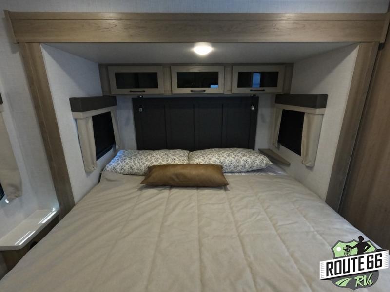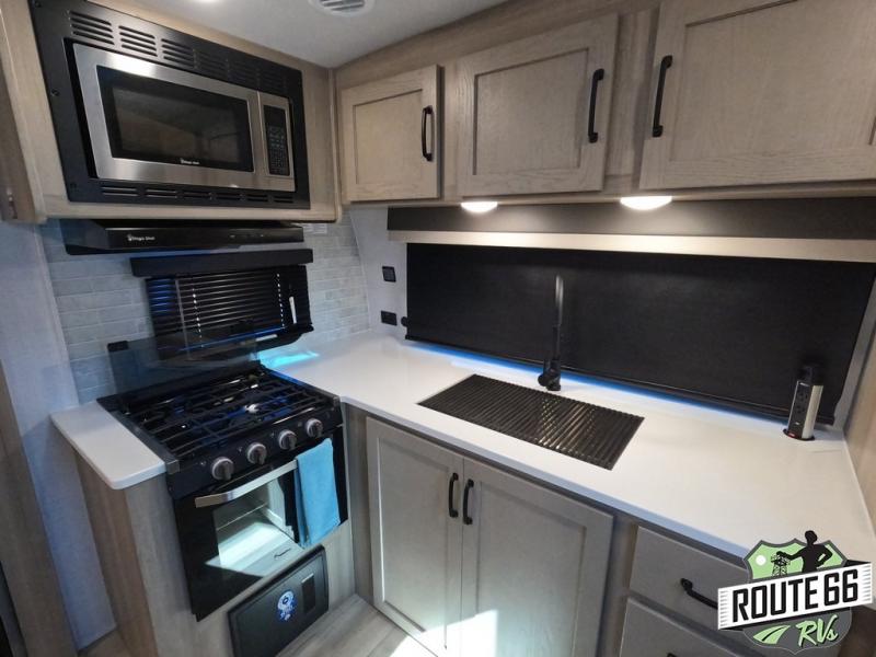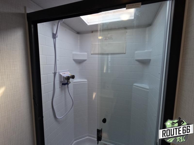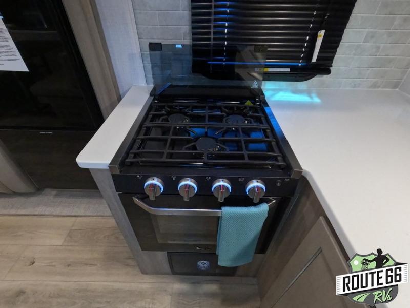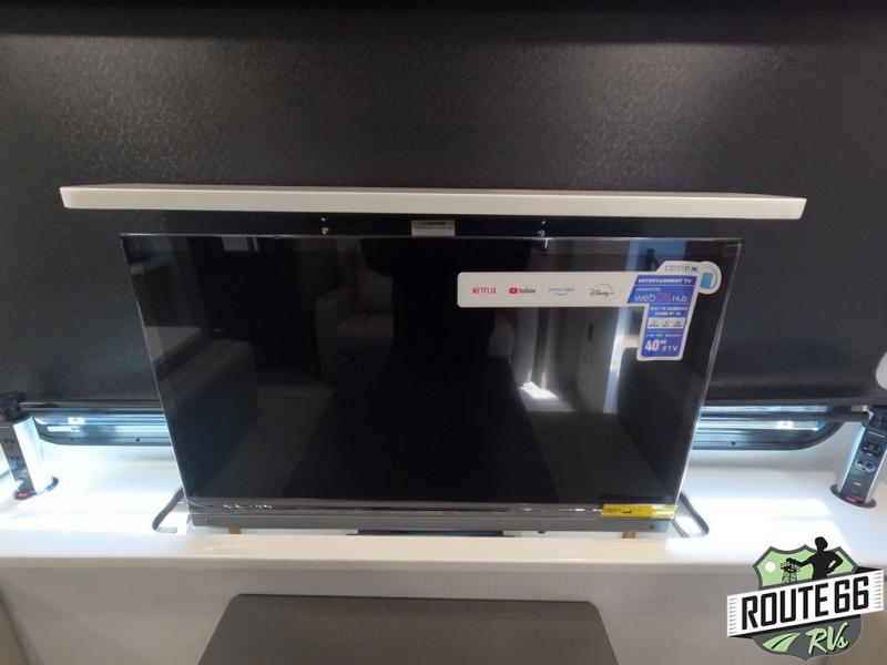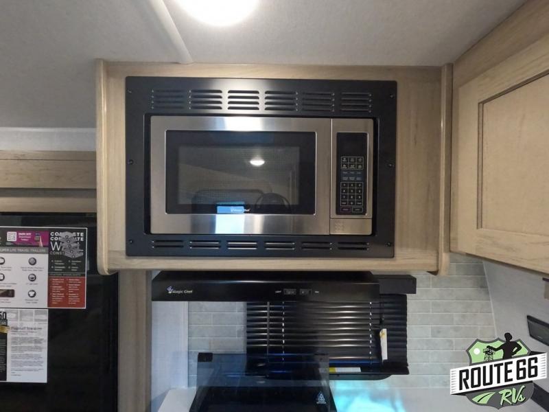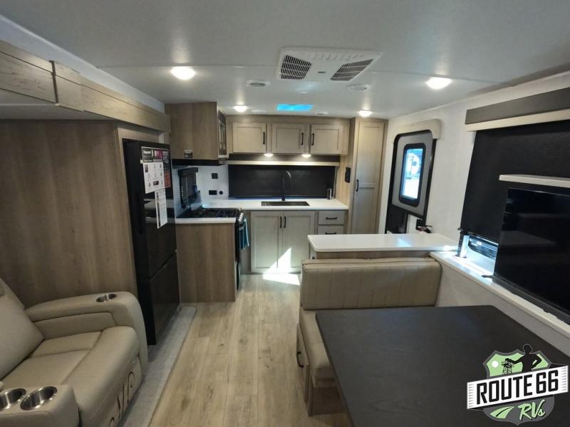 It will be so easy to enjoy time at the campground in this cozy travel trailer. The full kitchen includes a three burner gas oven, a microwave oven, and a 12V refrigerator to cook and store food, and the pantry will let you stock up on snacks. Your crew can get comfortable on the theater seat or play a game at the 39" booth dinette, and there is a 40" TV with a lift here to make it a movie night. The walk-thru bath will let you freshen up each day, and the queen bed in the rear bedroom is sure to bring comfort. You will also find one of the dual entry doors here for convenience plus a wardrobe for clothes storage and an optional TV if you want to add a television. The exterior is just as accommodating with its pass-thru storage, exterior griddle, and 21' awning!