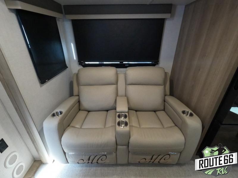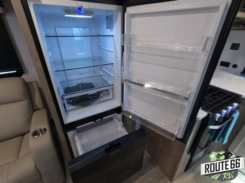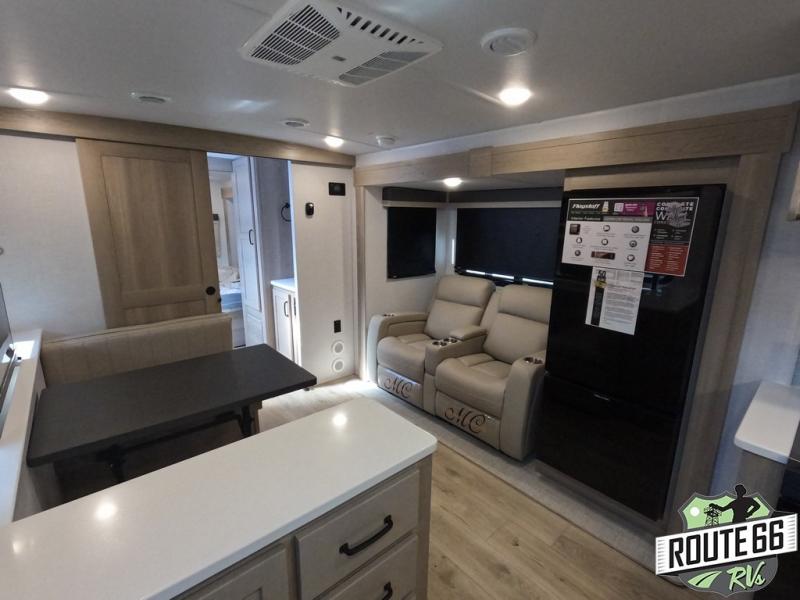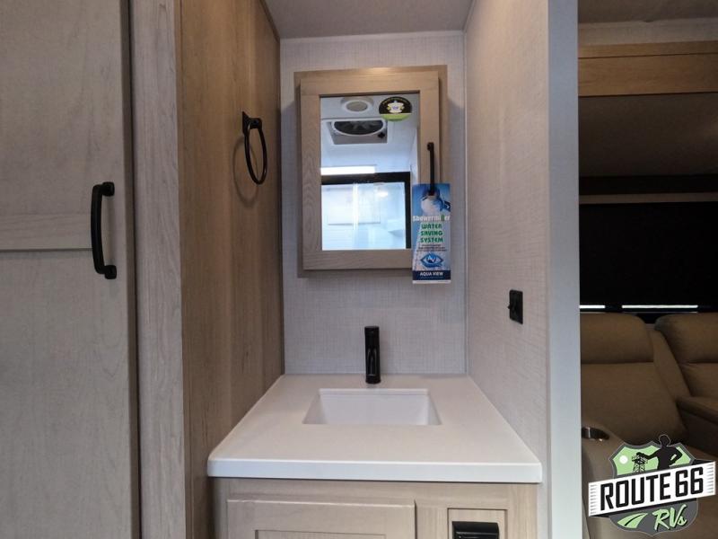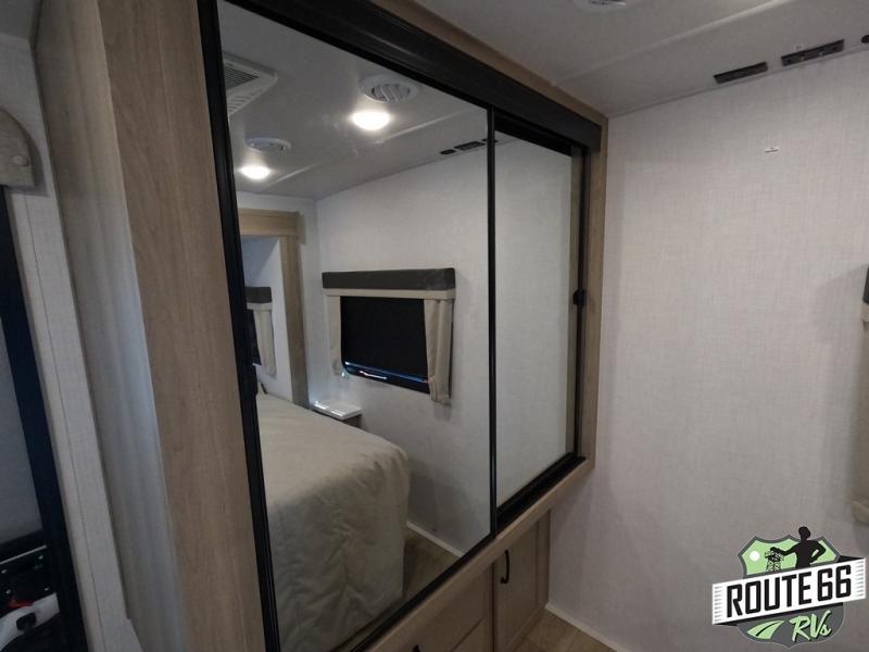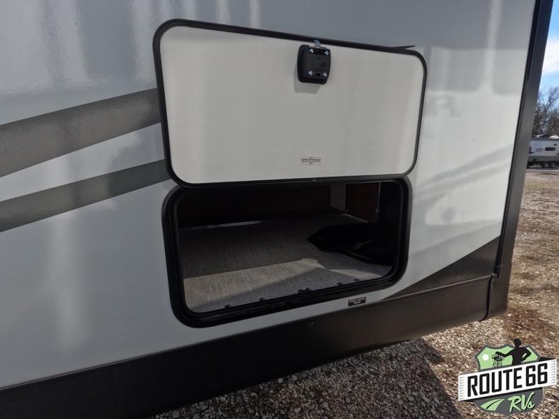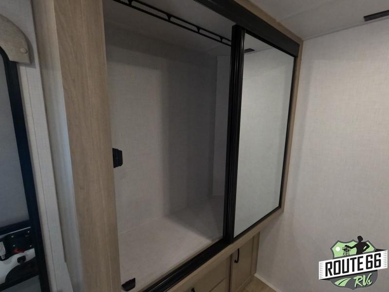 It will be so easy to enjoy time at the campground in this cozy travel trailer. The full kitchen includes a three burner gas oven, a microwave oven, and a 12V refrigerator to cook and store food, and the pantry will let you stock up on snacks. Your crew can get comfortable on the theater seat or play a game at the 39" booth dinette, and there is a 40" TV with a lift here to make it a movie night. The walk-thru bath will let you freshen up each day, and the queen bed in the rear bedroom is sure to bring comfort. You will also find one of the dual entry doors here for convenience plus a wardrobe for clothes storage and an optional TV if you want to add a television. The exterior is just as accommodating with its pass-thru storage, exterior griddle, and 21' awning!