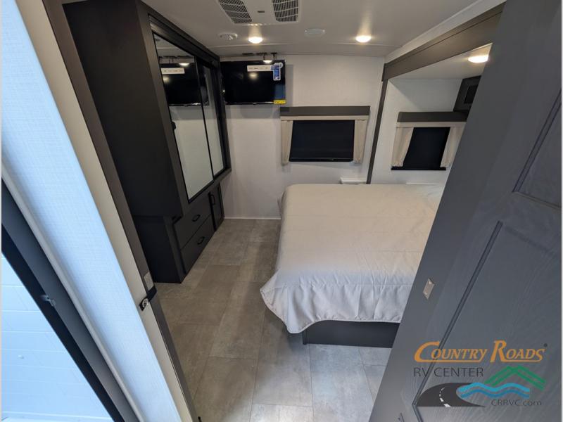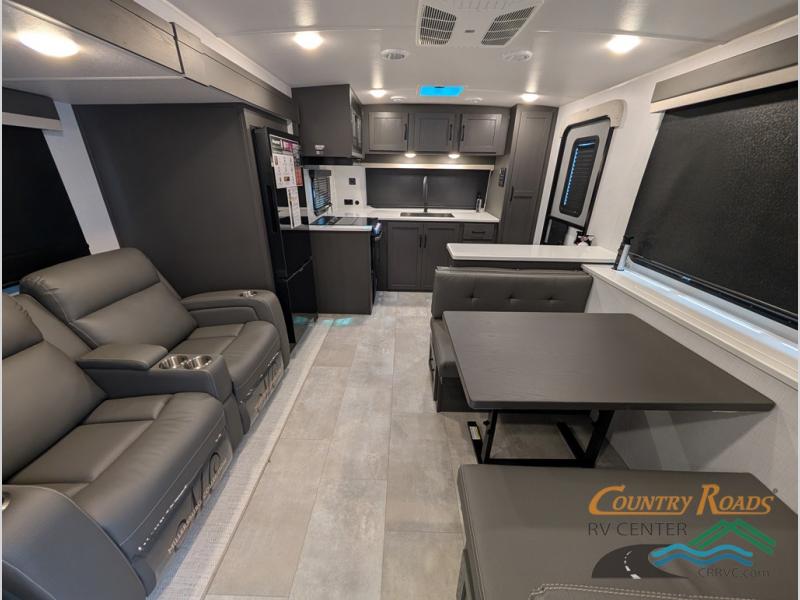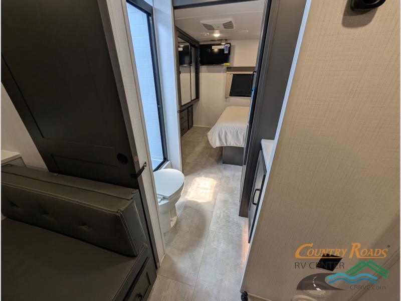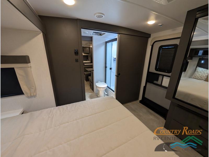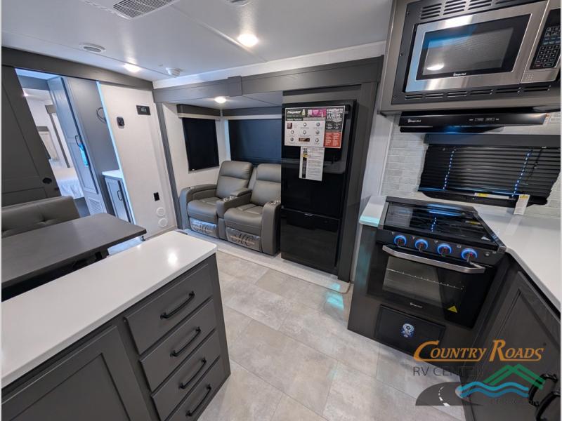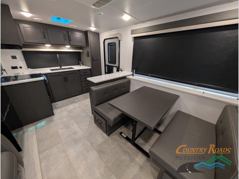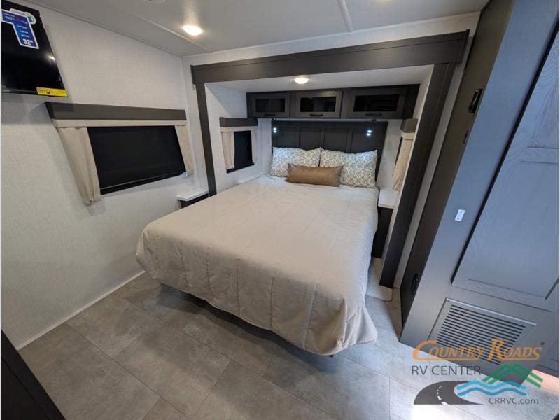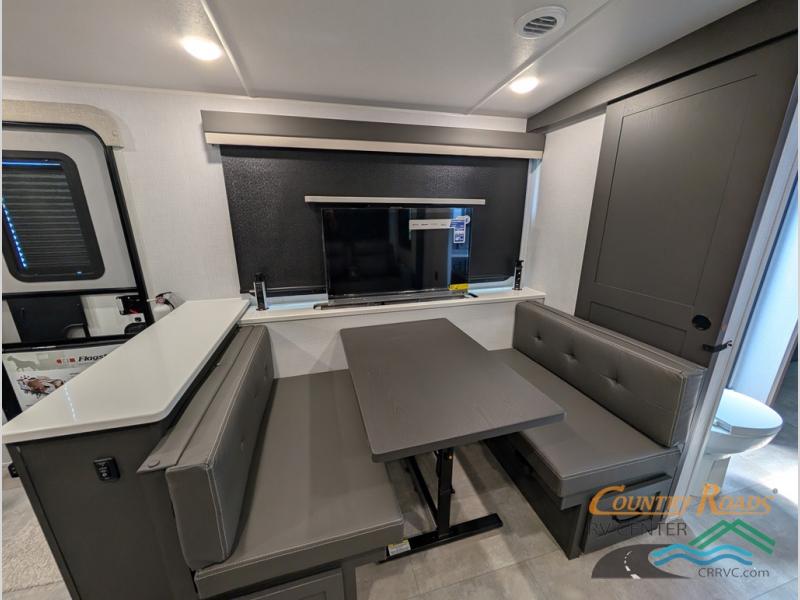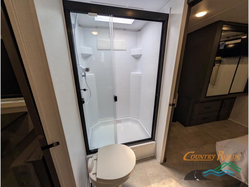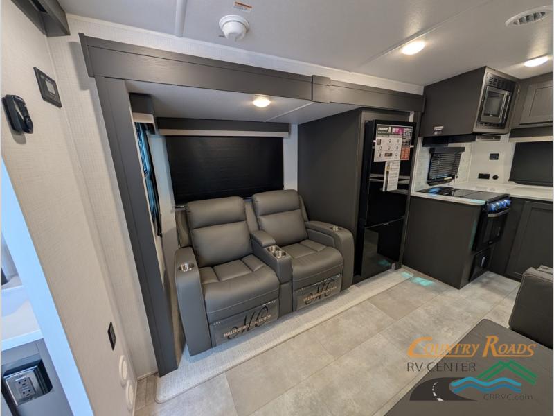 It will be so easy to enjoy time at the campground in this cozy travel trailer. The full kitchen includes a three burner gas oven, a microwave oven, and a 12V refrigerator to cook and store food, and the pantry will let you stock up on snacks. Your crew can get comfortable on the theater seat or play a game at the 39" booth dinette, and there is a 40" TV with a lift here to make it a movie night. The walk-thru bath will let you freshen up each day, and the queen bed in the rear bedroom is sure to bring comfort. You will also find one of the dual entry doors here for convenience plus a wardrobe for clothes storage and an optional TV if you want to add a television. The exterior is just as accommodating with its pass-thru storage, exterior griddle, and 21' awning!