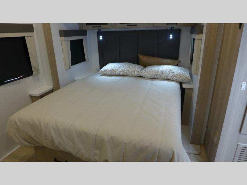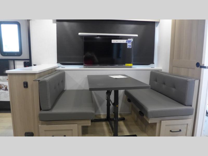 It will be so easy to enjoy time at the campground in this cozy travel trailer. The full kitchen includes a three burner gas oven, a microwave oven, and a 12V refrigerator to cook and store food, and the pantry will let you stock up on snacks. Your crew can get comfortable on the theater seat or play a game at the 39" booth dinette, and there is a 40" TV with a lift here to make it a movie night. The walk-thru bath will let you freshen up each day, and the queen bed in the rear bedroom is sure to bring comfort. You will also find one of the dual entry doors here for convenience plus a wardrobe for clothes storage and an optional TV if you want to add a television. The exterior is just as accommodating with its pass-thru storage, exterior griddle, and 21' awning!