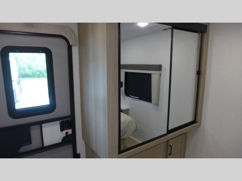 It will be so easy to enjoy time at the campground in this cozy travel trailer. The full kitchen includes a three burner gas oven, a microwave oven, and a 12V refrigerator to cook and store food, and the pantry will let you stock up on snacks. Your crew can get comfortable on the theater seat or play a game at the 39" booth dinette, and there is a 40" TV with a lift here to make it a movie night. The walk-thru bath will let you freshen up each day, and the queen bed in the rear bedroom is sure to bring comfort. You will also find one of the dual entry doors here for convenience plus a wardrobe for clothes storage and an optional TV if you want to add a television. The exterior is just as accommodating with its pass-thru storage, exterior griddle, and 21' awning!