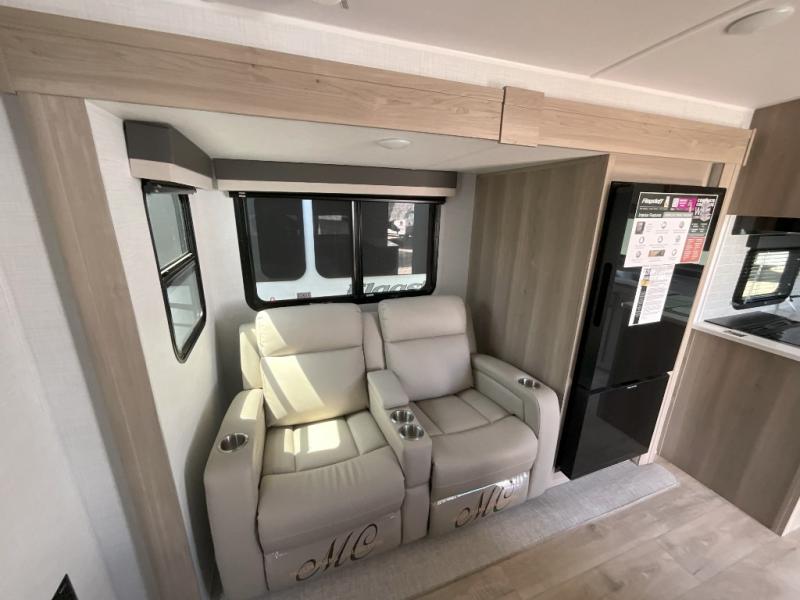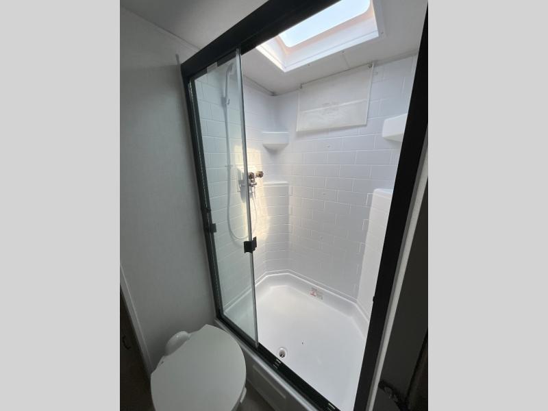 It will be so easy to enjoy time at the campground in this cozy travel trailer. The full kitchen includes a three burner gas oven, a microwave oven, and a 12V refrigerator to cook and store food, and the pantry will let you stock up on snacks. Your crew can get comfortable on the theater seat or play a game at the 39" booth dinette, and there is a 40" TV with a lift here to make it a movie night. The walk-thru bath will let you freshen up each day, and the queen bed in the rear bedroom is sure to bring comfort. You will also find one of the dual entry doors here for convenience plus a wardrobe for clothes storage and an optional TV if you want to add a television. The exterior is just as accommodating with its pass-thru storage, exterior griddle, and 21' awning!