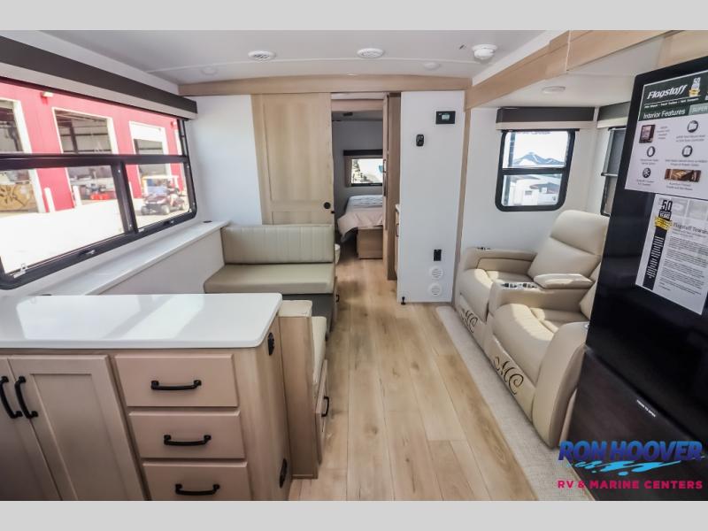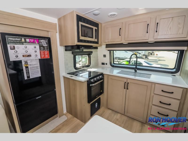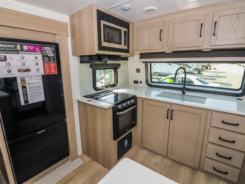With any Flagstaff Super Lite travel trailer by Forest River the towing features include the TST tire pressure monitor system with a monitor providing safety on the road, Easy Lube axles and Nev-R adjust brakes, a power tongue jack for easy setup, and rear observation camera prep. Each is built with 6 sided aluminum framed side walls, end wall, front, floor and a roof, a plywood tongue and groove subfloor, electronically controlled heated holding tanks and an enclosed underbelly allowing you to travel during any season. The interior includes designer kitchen backsplash, solid surface kitchen countertops, Sedonwood cabinetry, and solid wood cabinet doors and drawers to make you feel right at home.