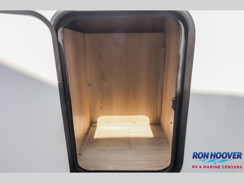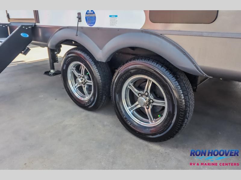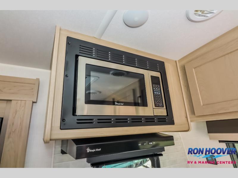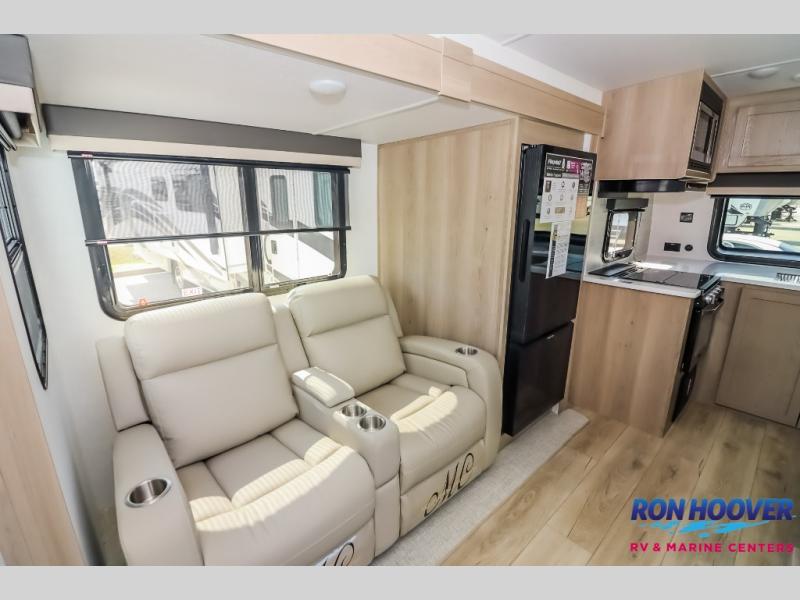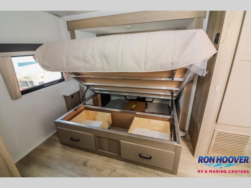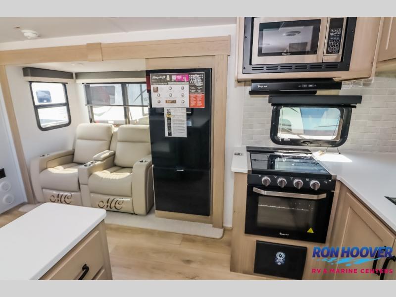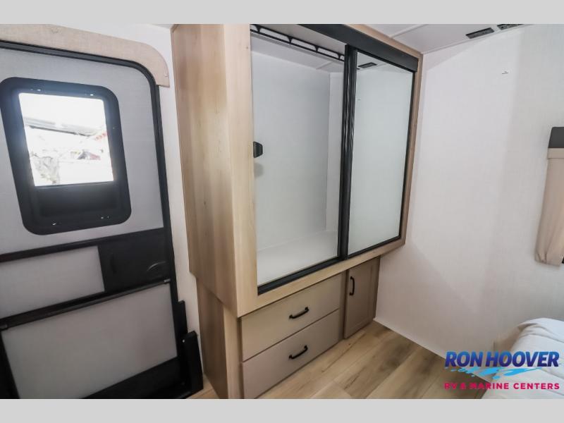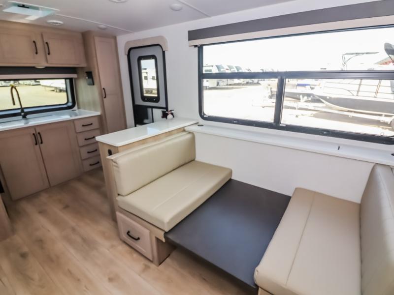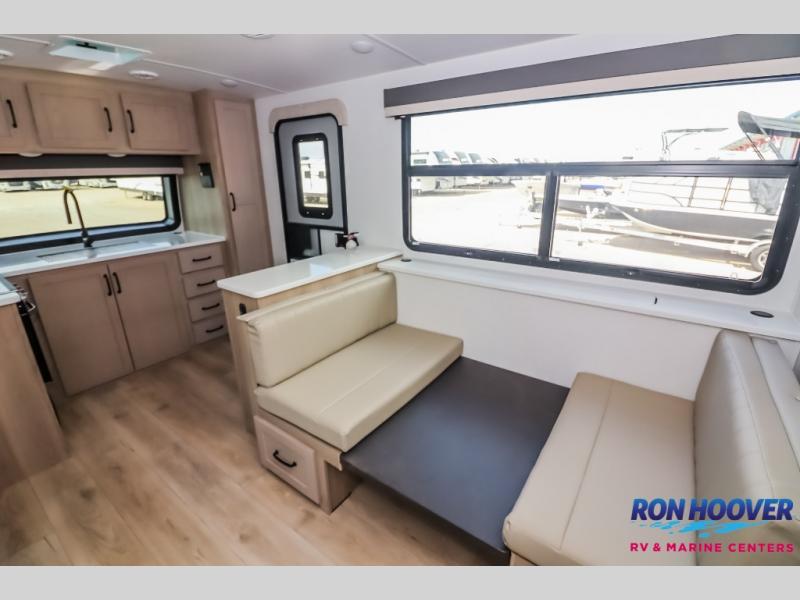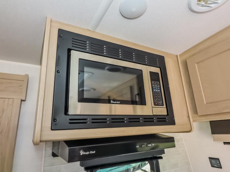 It will be so easy to enjoy time at the campground in this cozy travel trailer. The full kitchen includes a three burner gas oven, a microwave oven, and a 12V refrigerator to cook and store food, and the pantry will let you stock up on snacks. Your crew can get comfortable on the theater seat or play a game at the 39" booth dinette, and there is a 40" TV with a lift here to make it a movie night. The walk-thru bath will let you freshen up each day, and the queen bed in the rear bedroom is sure to bring comfort. You will also find one of the dual entry doors here for convenience plus a wardrobe for clothes storage and an optional TV if you want to add a television. The exterior is just as accommodating with its pass-thru storage, exterior griddle, and 21' awning!