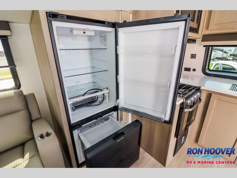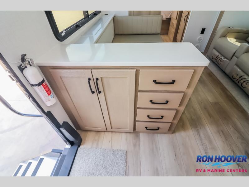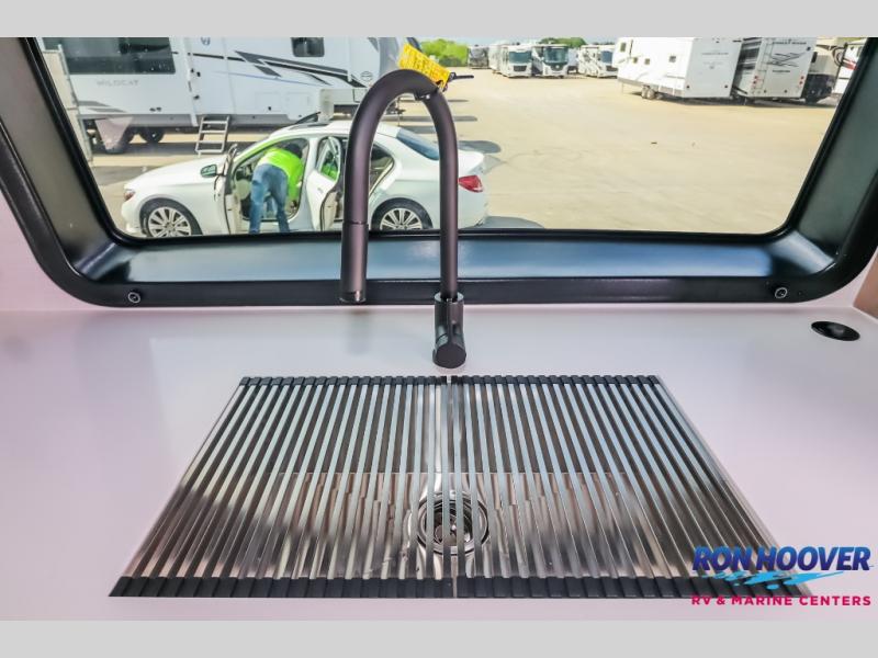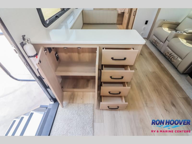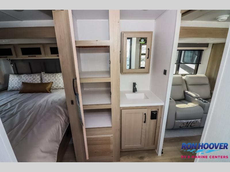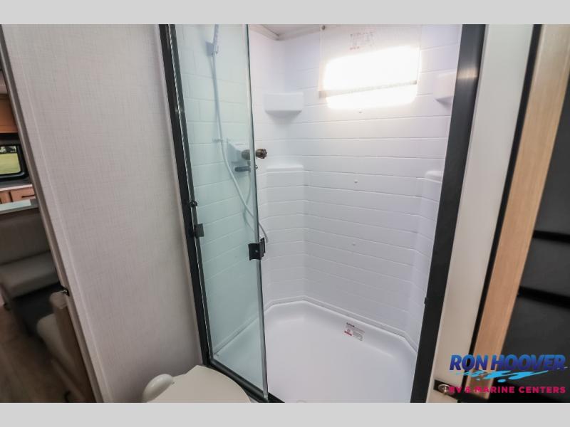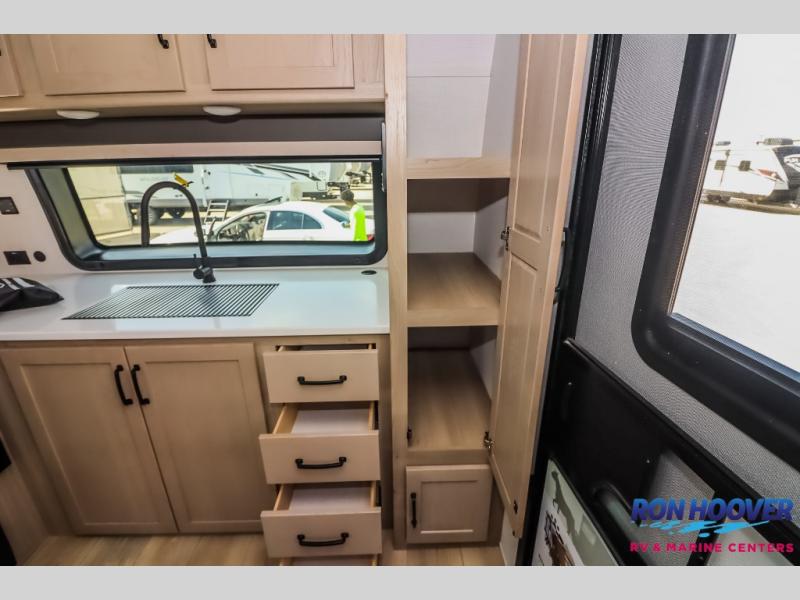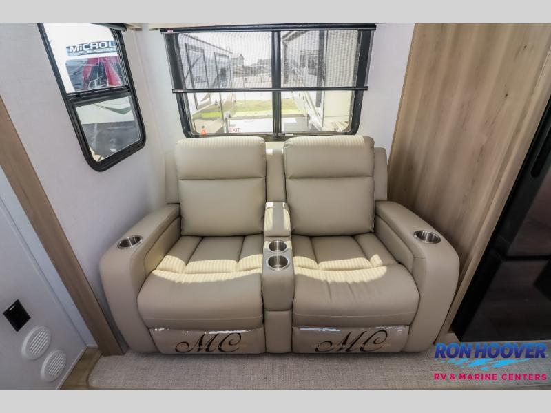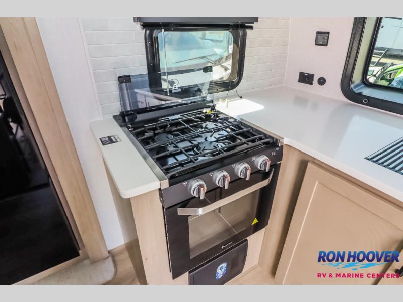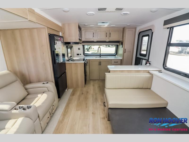 It will be so easy to enjoy time at the campground in this cozy travel trailer. The full kitchen includes a three burner gas oven, a microwave oven, and a 12V refrigerator to cook and store food, and the pantry will let you stock up on snacks. Your crew can get comfortable on the theater seat or play a game at the 39" booth dinette, and there is a 40" TV with a lift here to make it a movie night. The walk-thru bath will let you freshen up each day, and the queen bed in the rear bedroom is sure to bring comfort. You will also find one of the dual entry doors here for convenience plus a wardrobe for clothes storage and an optional TV if you want to add a television. The exterior is just as accommodating with its pass-thru storage, exterior griddle, and 21' awning!