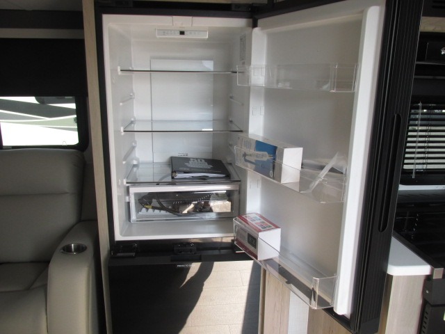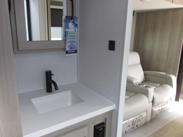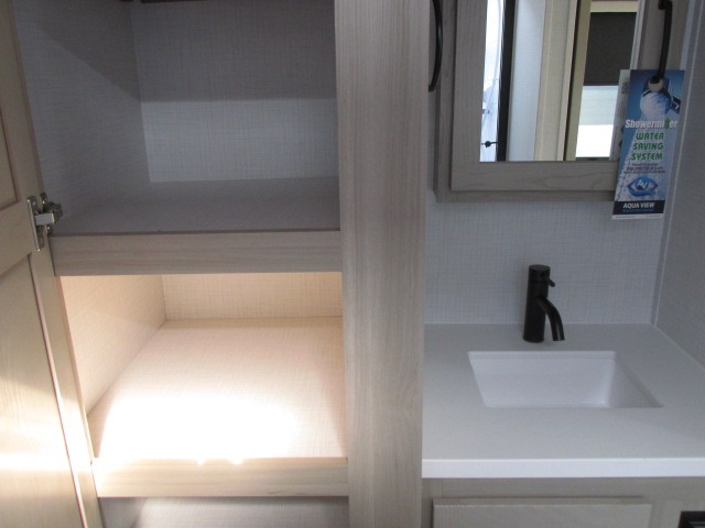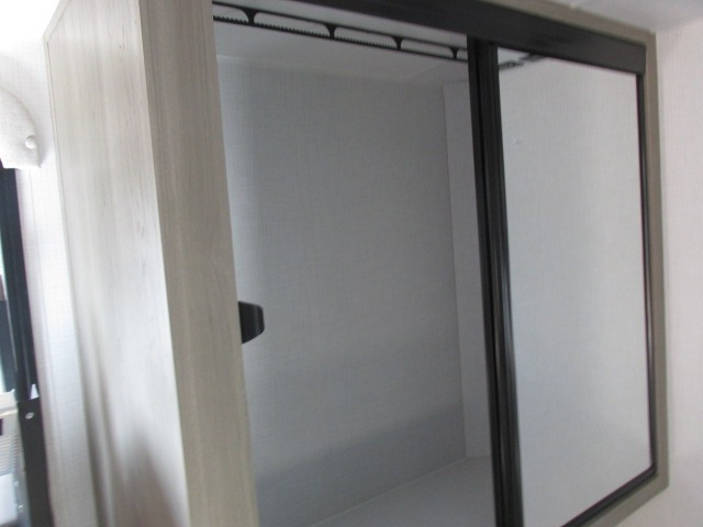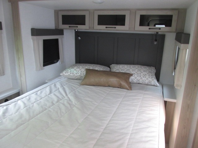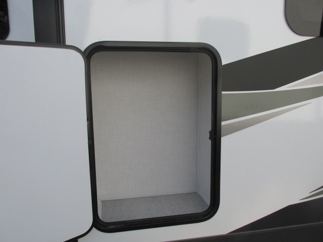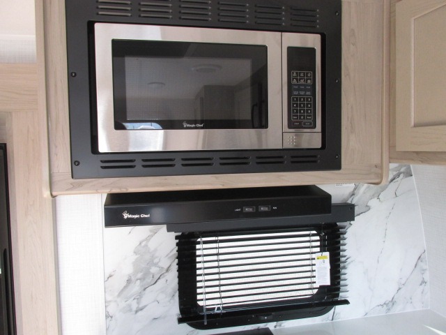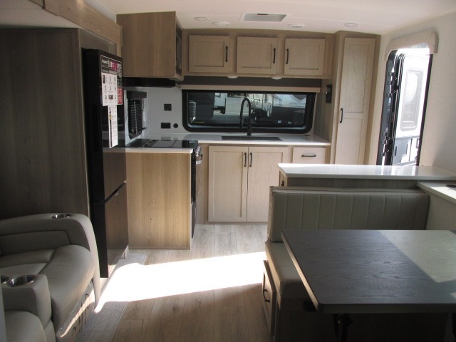 It will be so easy to enjoy time at the campground in this cozy travel trailer. The full kitchen includes a three burner gas oven, a microwave oven, and a 12V refrigerator to cook and store food, and the pantry will let you stock up on snacks. Your crew can get comfortable on the theater seat or play a game at the 39" booth dinette, and there is a 40" TV with a lift here to make it a movie night. The walk-thru bath will let you freshen up each day, and the queen bed in the rear bedroom is sure to bring comfort. You will also find one of the dual entry doors here for convenience plus a wardrobe for clothes storage and an optional TV if you want to add a television. The exterior is just as accommodating with its pass-thru storage, exterior griddle, and 21' awning!