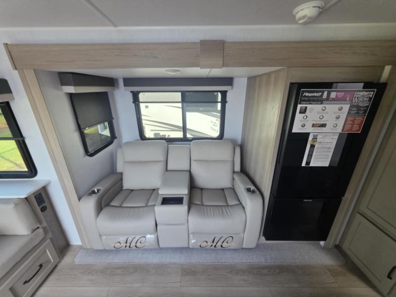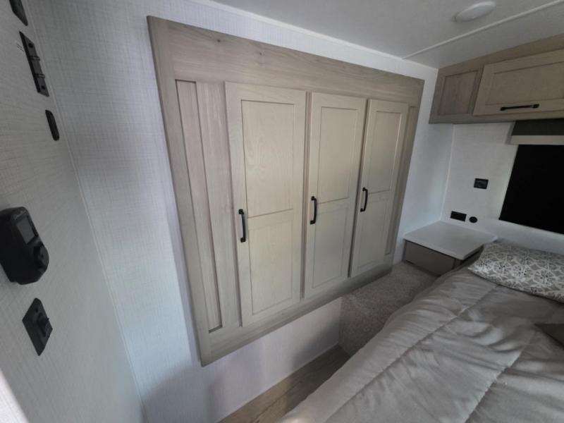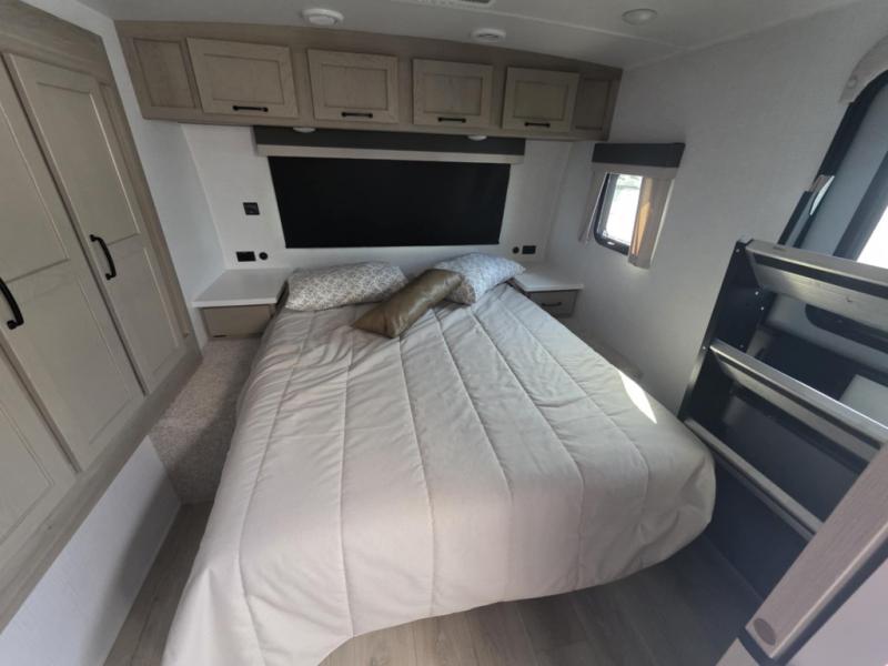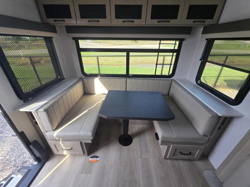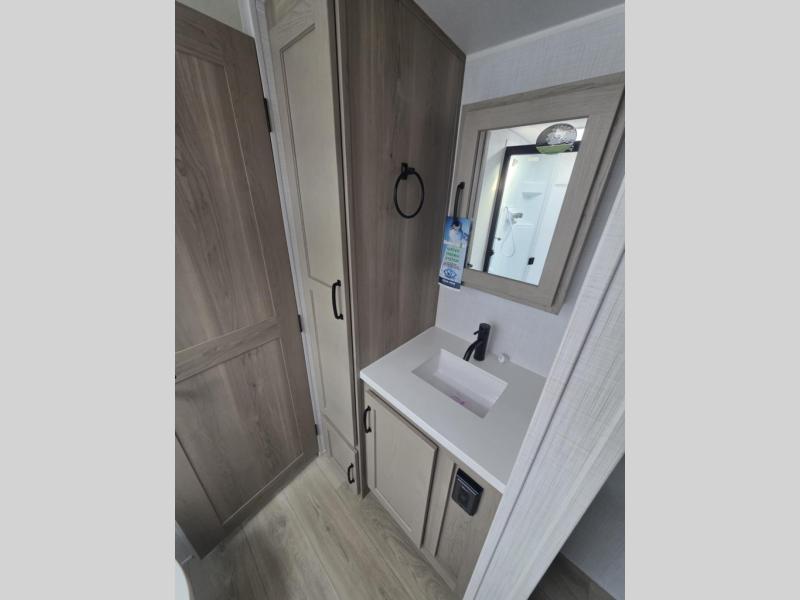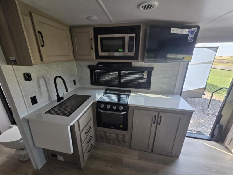 It will be so easy to enjoy time at the campground in this cozy travel trailer. The full kitchen includes a three burner gas oven, a microwave oven, and a 12V refrigerator to cook and store food, and the pantry will let you stock up on snacks. Your crew can get comfortable on the theater seat or around the rear U-shaped dinette, and there is a 12V smart entertainment TV here to make it a movie night. The walk-thru bath will let you freshen up each day, and the queen bed in the front bedroom is sure to bring comfort. You will also find one of the dual entry doors here for convenience plus a wardrobe slide out for more storage and floor space. The exterior is just as accommodating with its pass-thru storage, exterior griddle, and 21' awning!