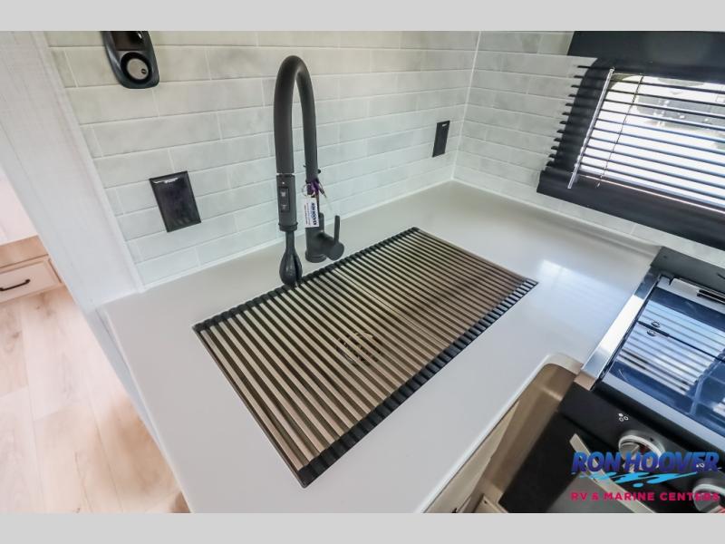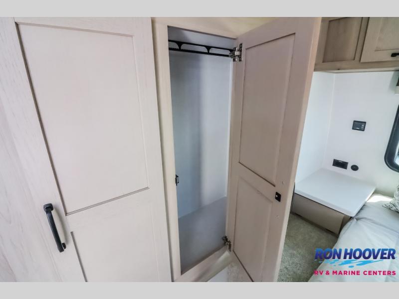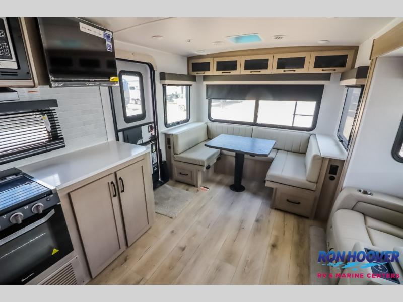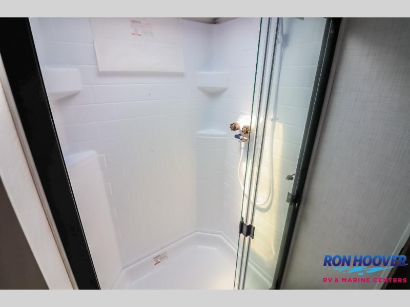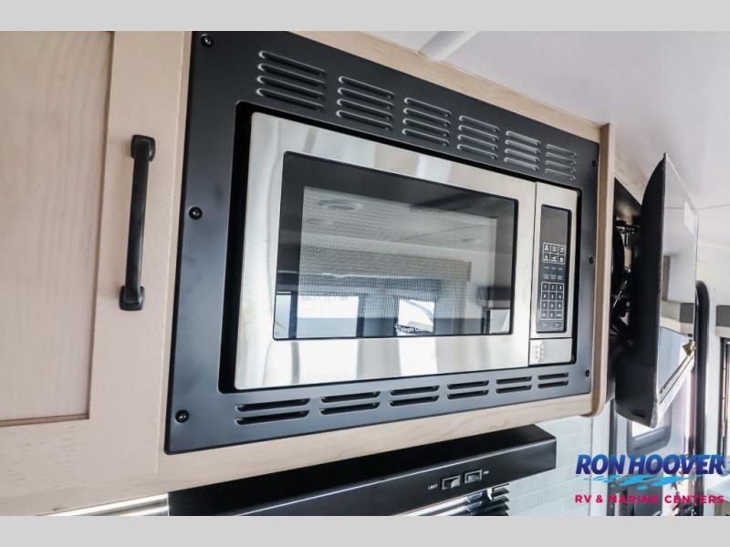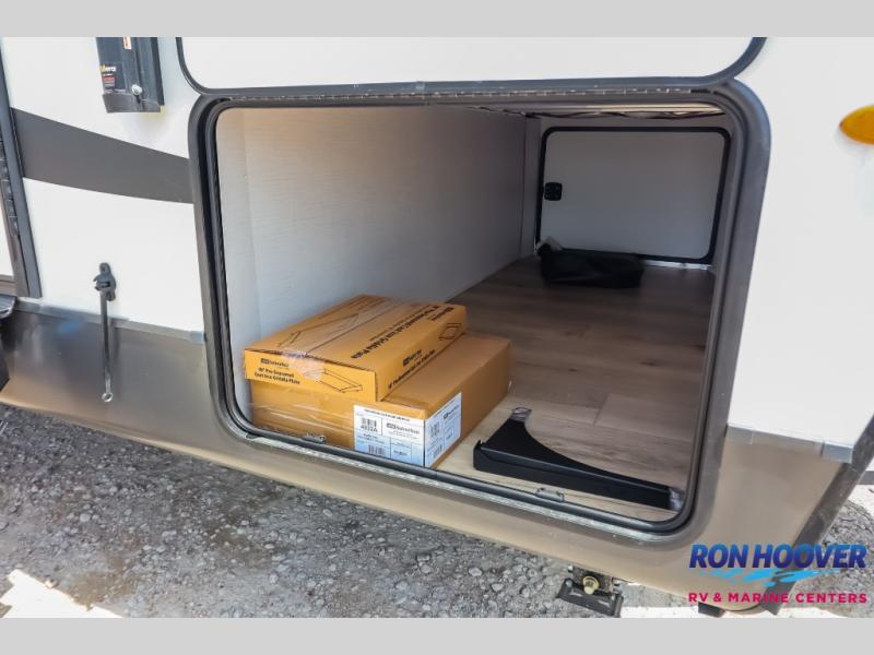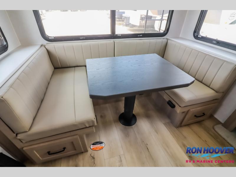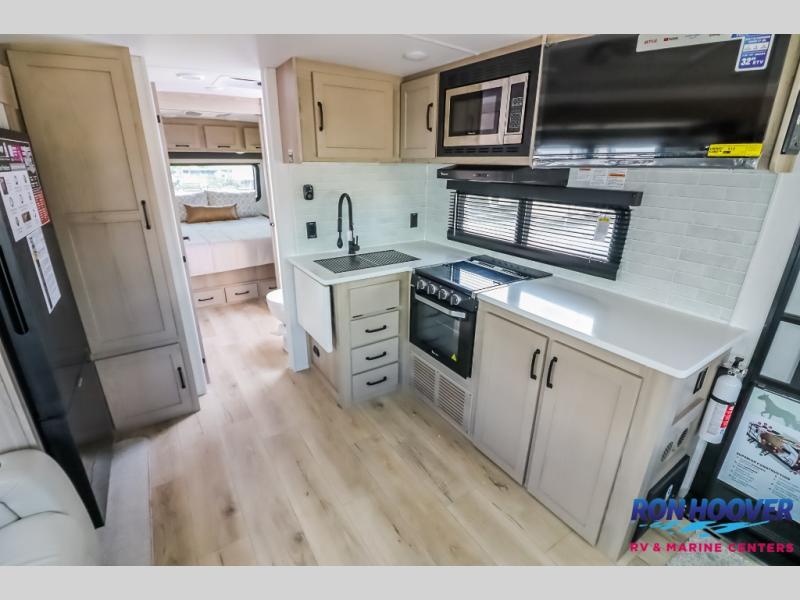It will be so easy to enjoy time at the campground in this cozy travel trailer. The full kitchen includes a three burner gas oven, a microwave oven, and a 12V refrigerator to cook and store food, and the pantry will let you stock up on snacks. Your crew can get comfortable on the theater seat or around the rear U-shaped dinette, and there is a 12V smart entertainment TV here to make it a movie night. The walk-thru bath will let you freshen up each day, and the queen bed in the front bedroom is sure to bring comfort. You will also find one of the dual entry doors here for convenience plus a wardrobe slide out for more storage and floor space. The exterior is just as accommodating with its pass-thru storage, exterior griddle, and 21' awning!