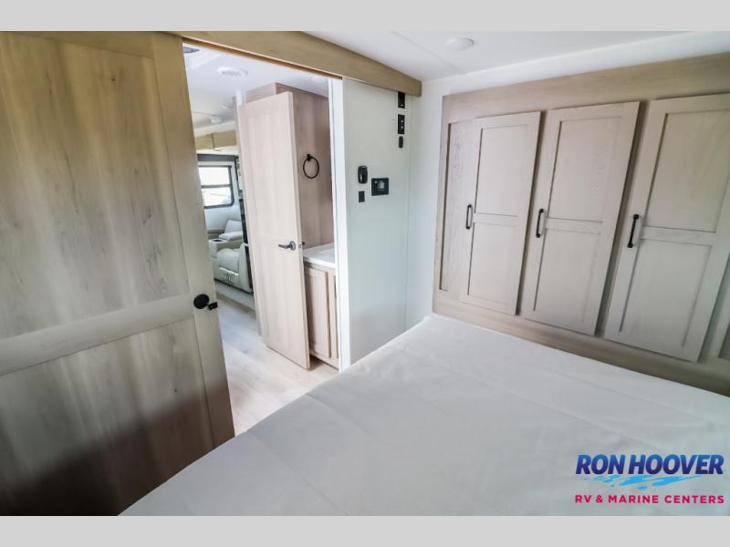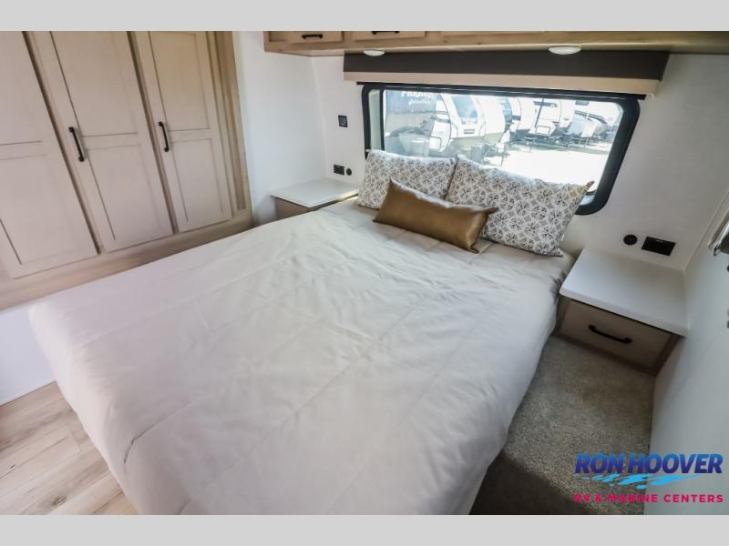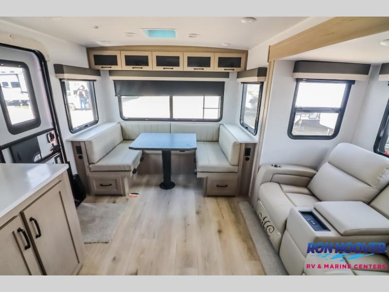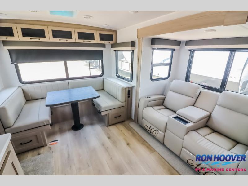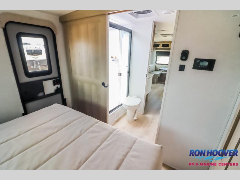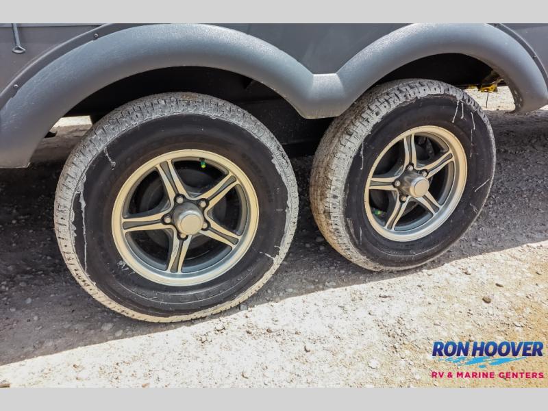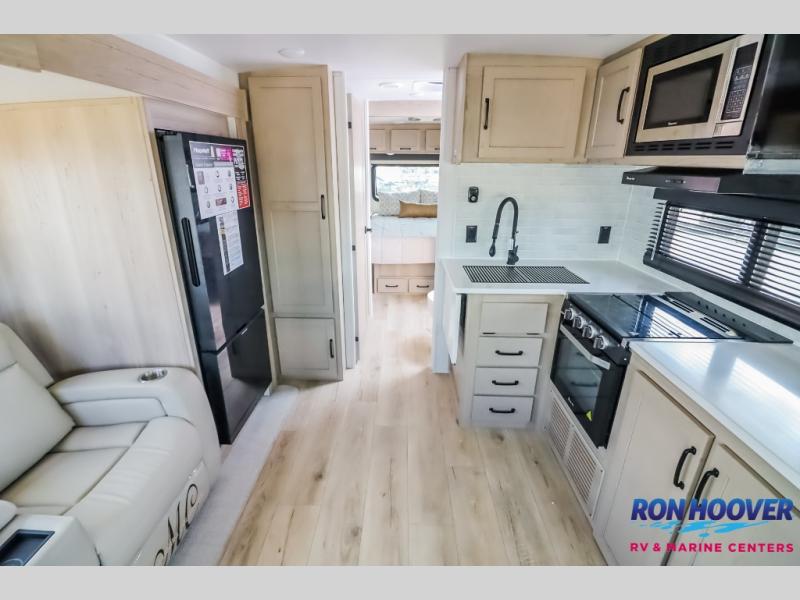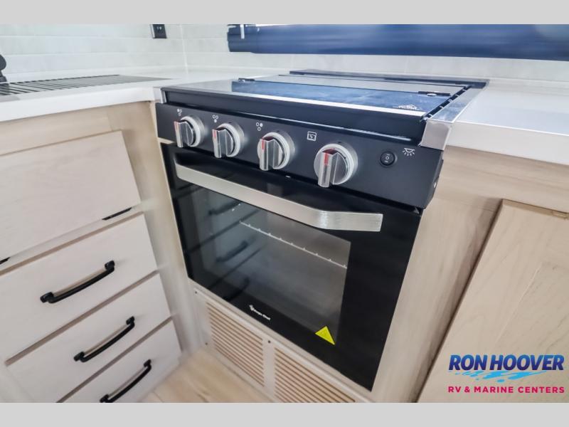 It will be so easy to enjoy time at the campground in this cozy travel trailer. The full kitchen includes a three burner gas oven, a microwave oven, and a 12V refrigerator to cook and store food, and the pantry will let you stock up on snacks. Your crew can get comfortable on the theater seat or around the rear U-shaped dinette, and there is a 12V smart entertainment TV here to make it a movie night. The walk-thru bath will let you freshen up each day, and the queen bed in the front bedroom is sure to bring comfort. You will also find one of the dual entry doors here for convenience plus a wardrobe slide out for more storage and floor space. The exterior is just as accommodating with its pass-thru storage, exterior griddle, and 21' awning!