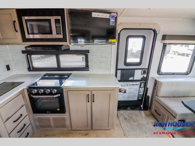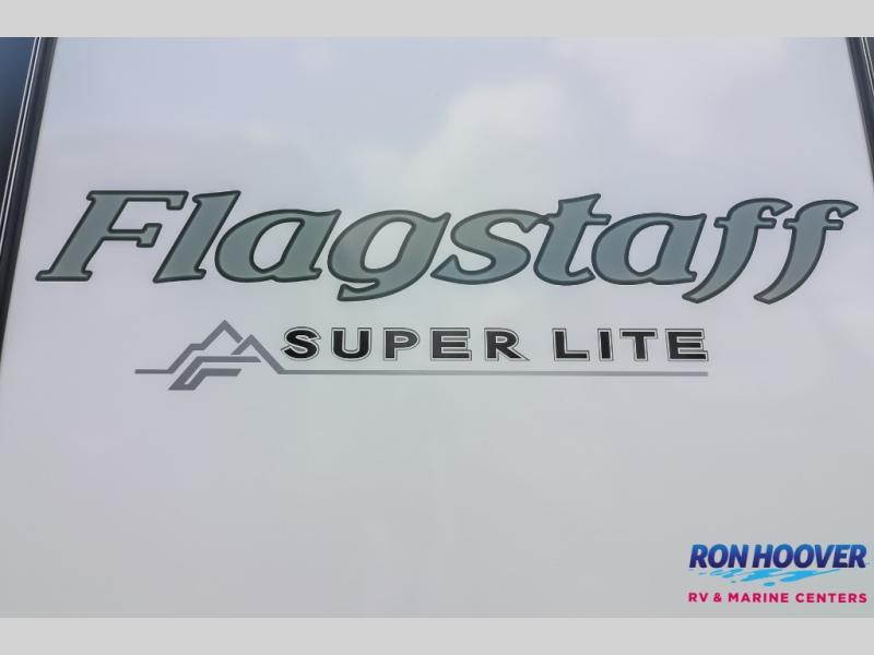 With any Flagstaff Super Lite travel trailer by Forest River the towing features include the TST tire pressure monitor system with a monitor providing safety on the road, Easy Lube axles and Nev-R adjust brakes, a power tongue jack for easy setup, and rear observation camera prep. Each is built with 6 sided aluminum framed side walls, end wall, front, floor and a roof, a plywood tongue and groove subfloor, electronically controlled heated holding tanks and an enclosed underbelly allowing you to travel during any season. The interior includes designer kitchen backsplash, solid surface kitchen countertops, Sedonwood cabinetry, and solid wood cabinet doors and drawers to make you feel right at home.