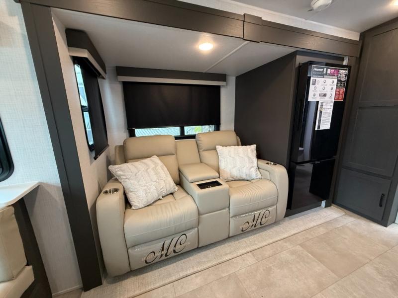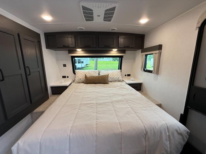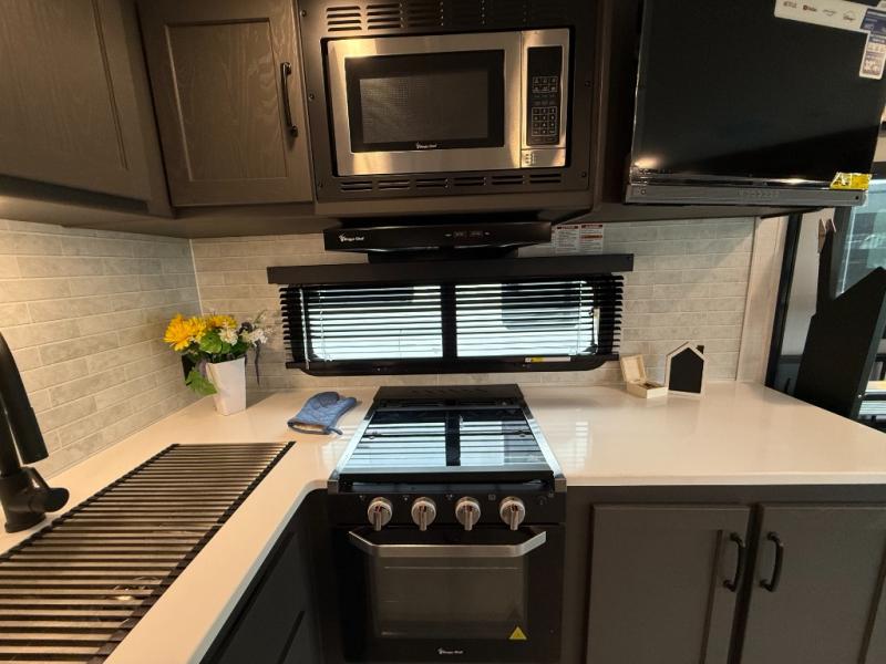 It will be so easy to enjoy time at the campground in this cozy travel trailer. The full kitchen includes a three burner gas oven, a microwave oven, and a 12V refrigerator to cook and store food, and the pantry will let you stock up on snacks. Your crew can get comfortable on the theater seat or around the rear U-shaped dinette, and there is a 12V smart entertainment TV here to make it a movie night. The walk-thru bath will let you freshen up each day, and the queen bed in the front bedroom is sure to bring comfort. You will also find one of the dual entry doors here for convenience plus a wardrobe slide out for more storage and floor space. The exterior is just as accommodating with its pass-thru storage, exterior griddle, and 21' awning!