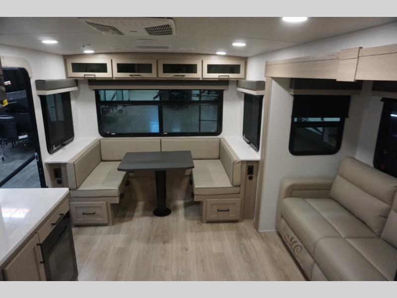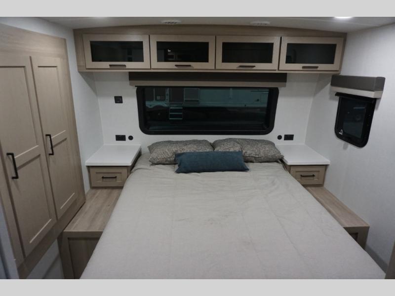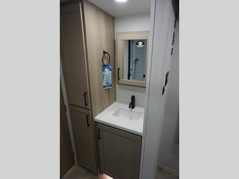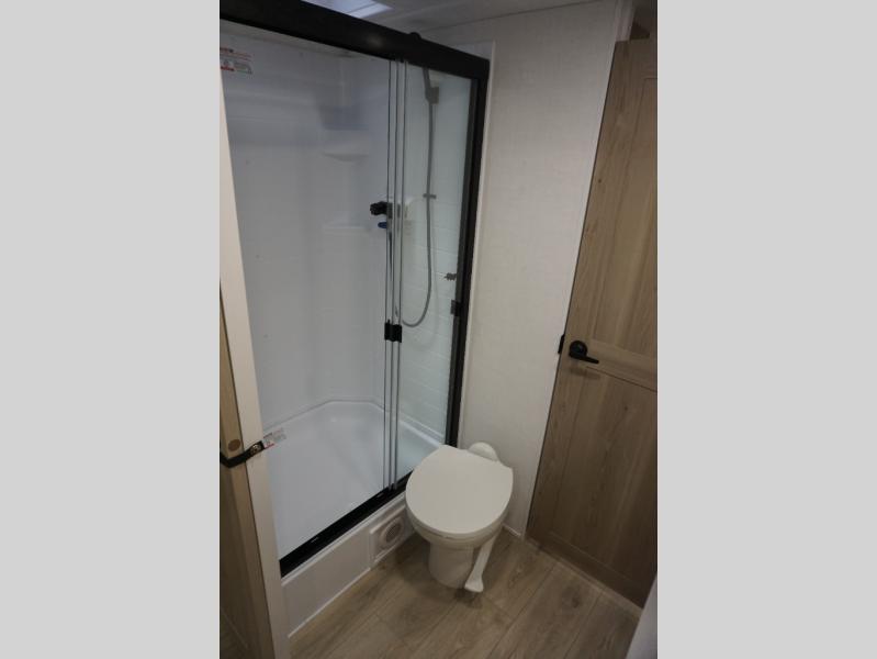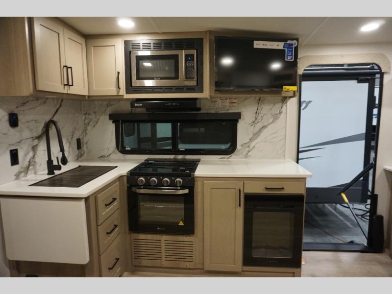 It will be so easy to enjoy time at the campground in this cozy travel trailer. The full kitchen includes a three burner gas oven, a microwave oven, and a 12V refrigerator to cook and store food, and the pantry will let you stock up on snacks. Your crew can get comfortable on the theater seat or around the rear U-shaped dinette, and there is a 12V smart entertainment TV here to make it a movie night. The walk-thru bath will let you freshen up each day, and the queen bed in the front bedroom is sure to bring comfort. You will also find one of the dual entry doors here for convenience plus a wardrobe slide out for more storage and floor space. The exterior is just as accommodating with its pass-thru storage, exterior griddle, and 21' awning!
