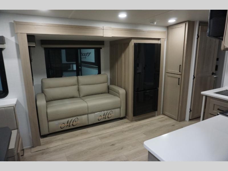 With any Flagstaff Super Lite travel trailer by Forest River the towing features include the TST tire pressure monitor system with a monitor providing safety on the road, Easy Lube axles and Nev-R adjust brakes, a power tongue jack for easy setup, and rear observation camera prep. Each is built with 6 sided aluminum framed side walls, end wall, front, floor and a roof, a plywood tongue and groove subfloor, electronically controlled heated holding tanks and an enclosed underbelly allowing you to travel during any season. The interior includes designer kitchen backsplash, solid surface kitchen countertops, Sedonwood cabinetry, and solid wood cabinet doors and drawers to make you feel right at home.