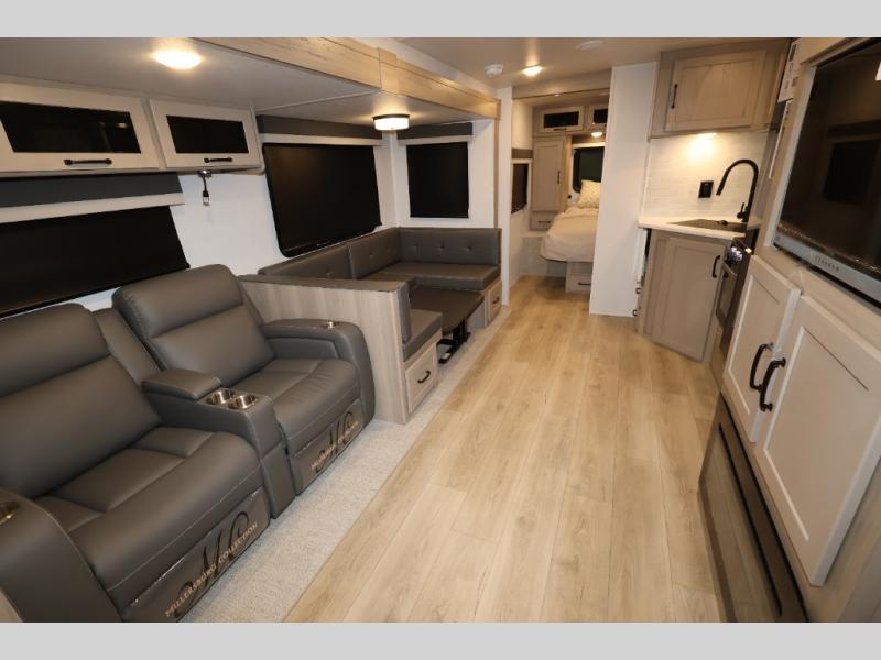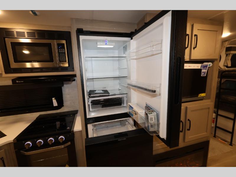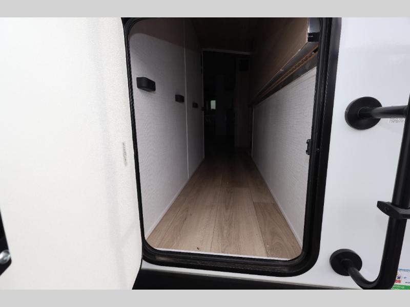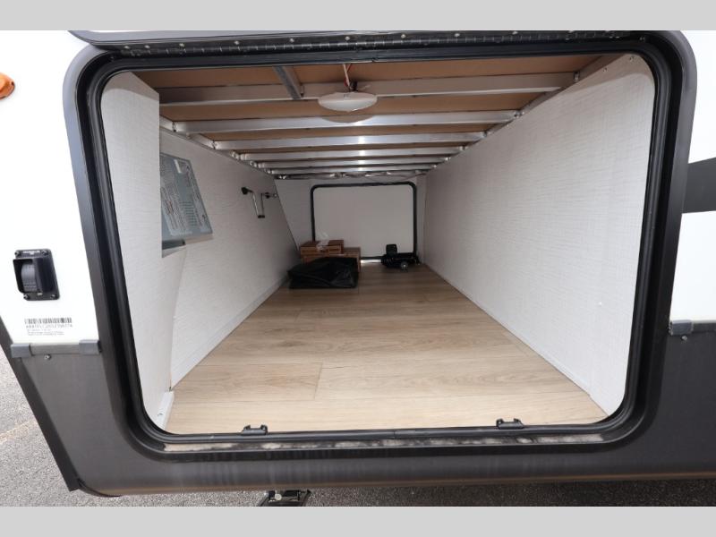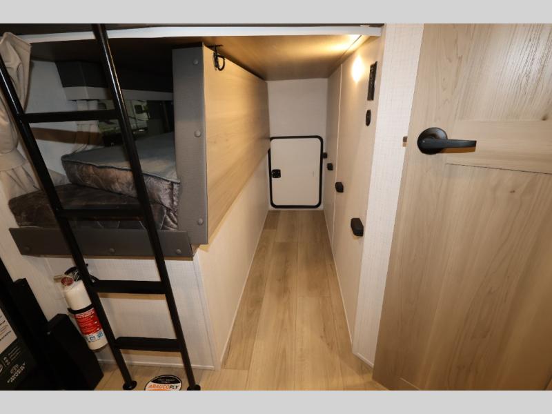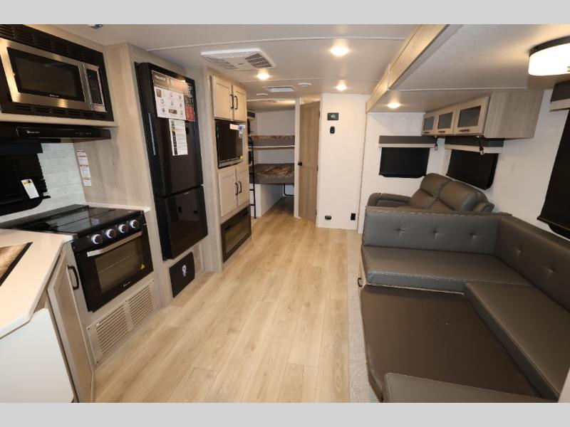 Get ready for a fun camping experience with your family and friends in this trailer that sleeps eight! From the rear double size bunks to the front bedroom's queen bed, and the furniture in the spacious main living area, everyone will find a place to lay their head at night. The cook will have full amenities inside and the choice to make meals on the outside kitchen when feeding everyone. There is abundant storage for your snacks and dry ingredients in the walk-in pantry, your cold items in the 12V refrigerator, and throughout the interior and along the exterior. You can load the larger gear in the front pass-thru storage with an optional steel sliding tray, and there is also an optional front door leading to the bedroom if you want even more convenience!