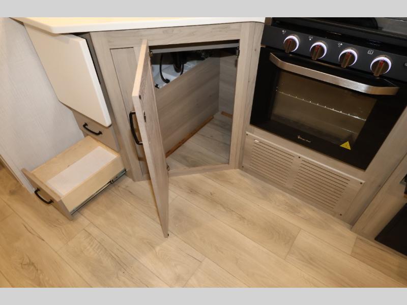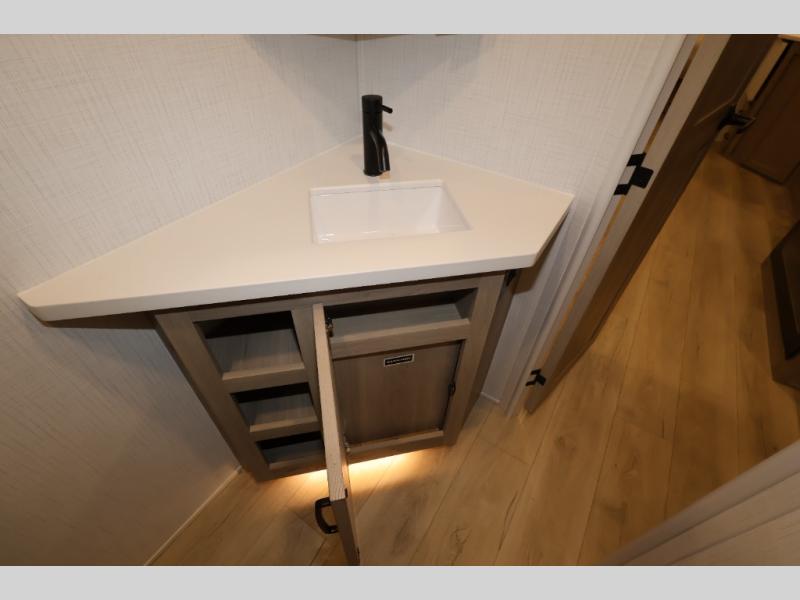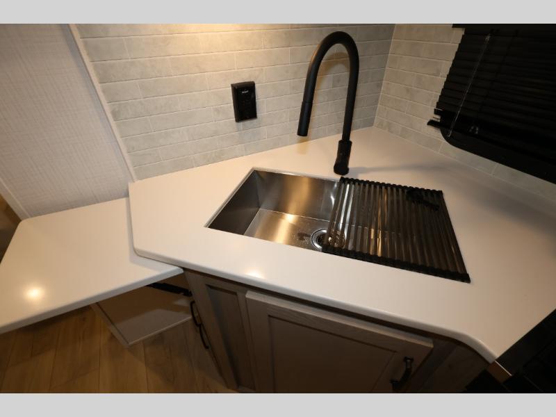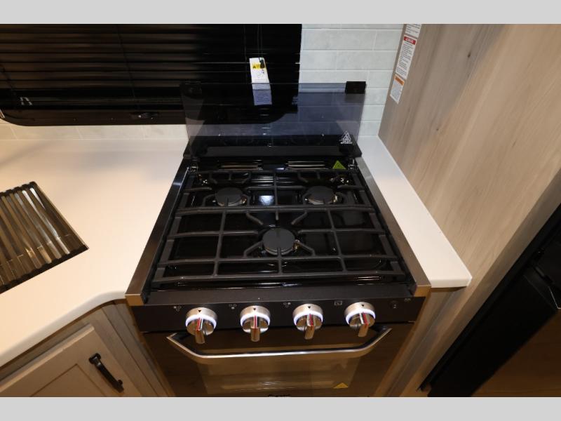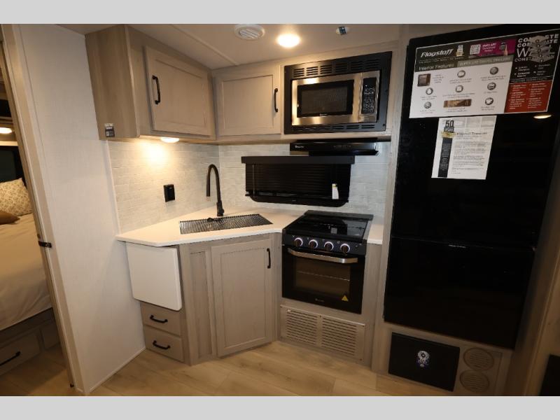 With any Flagstaff Super Lite travel trailer by Forest River the towing features include the TST tire pressure monitor system with a monitor providing safety on the road, Easy Lube axles and Nev-R adjust brakes, a power tongue jack for easy setup, and rear observation camera prep. Each is built with 6 sided aluminum framed side walls, end wall, front, floor and a roof, a plywood tongue and groove subfloor, electronically controlled heated holding tanks and an enclosed underbelly allowing you to travel during any season. The interior includes designer kitchen backsplash, solid surface kitchen countertops, Sedonwood cabinetry, and solid wood cabinet doors and drawers to make you feel right at home.